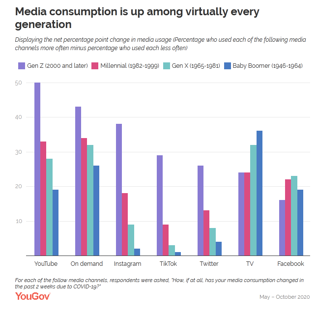 另一方面,广告主和旅游品牌有更多机会与潜在受众互动。YouGov数据表明,美国人在屏幕前花费的时间更多,而年轻一代推动了在线媒体消费的增长。 在大流行期间,Z世代和千禧一代与社交媒体平台、点播内容和YouTube互动最多。 Z世代对每个数字媒体渠道的访问都有所上升,尤其是对于YouTube、点播内容、Instagram、TikTok和Twitter。在千禧一代中,点播内容、YouTube、电视和Facebook的使用率最高。