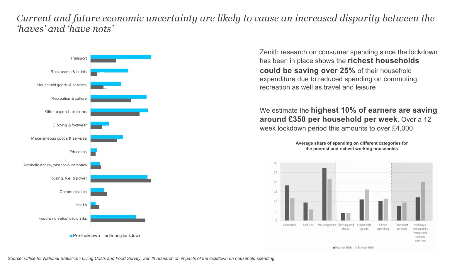 Zenith对封锁以来的消费者支出进行的研究显示,由于通勤、娱乐以及旅行和休闲方面的支出减少,最富有的家庭可以节省超过25%的家庭支出。收入最高的10%的家庭正在储蓄,每个家庭每周约储蓄350英镑。在12周的锁定期内,这笔钱总计超过4,000英镑。
