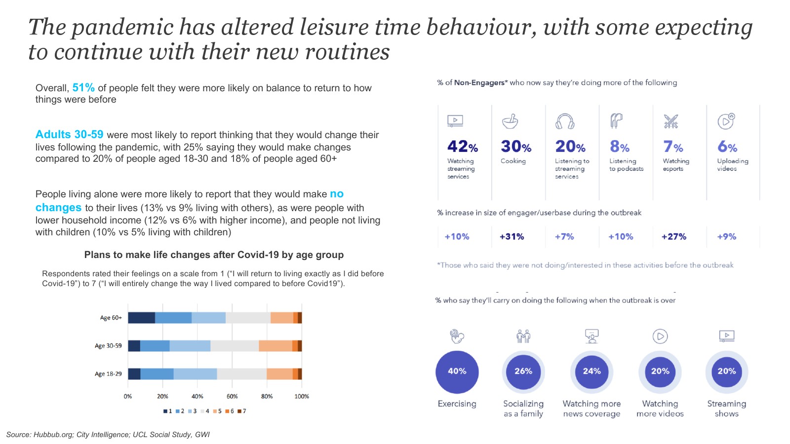 总体而言,有51%的英国人认为自己更有可能恢复之前的状态。30-59岁成年人最有可能报告说他们会在大流行后改变生活。18-30岁和60岁以上的英国人中分别有20%和18%报告说他们不会改变自己的生活。