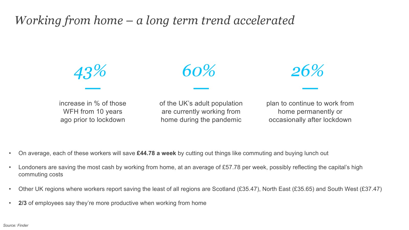 平均而言,那些在家工作的英国人通过减少通勤和买午餐等每周可节省44.78英镑。其中伦敦人通过在家工作节省的钱最多,平均每周57.78英镑,这可能反映出首都的通勤成本更高。在苏格兰(35.47英镑)、东北(35.65英镑)和西南(37.47英镑)地区在家工作也可以节省一些支出。2/3的员工表示他们在家工作时生产率更高。