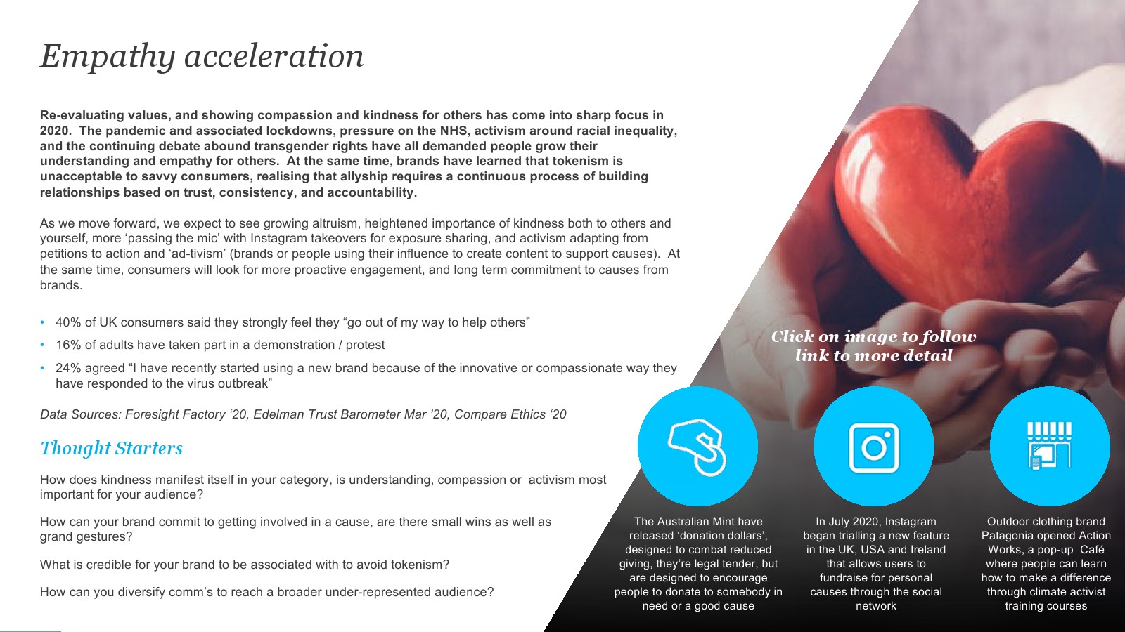 危机过后,“谨慎奢侈”的消费者期望增加不必要的消费。 但是,有45%的英国人认为他们的购物方式将永久改变,并且会对有目标的品牌做出强烈反应。其中62%的消费者更有可能从他们认为对社会有益的公司购买商品,还有42%的人愿意为国内生产的产品支付溢价。相比之下,1/3的消费者(33%)认为危机不会改变他们的生活。