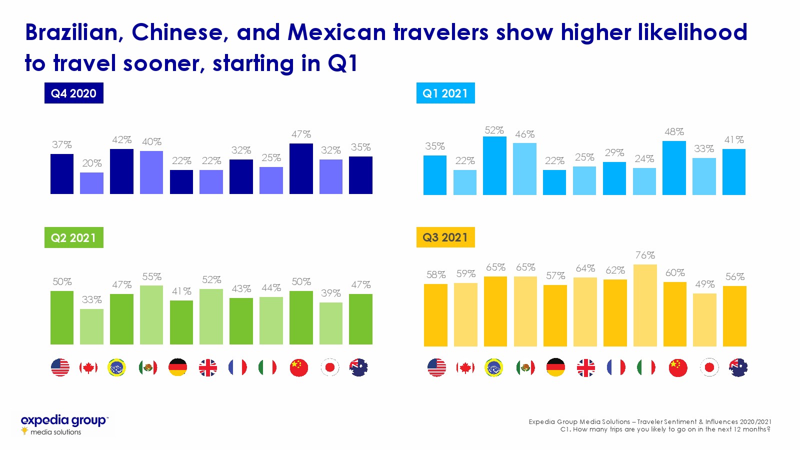 展望未来。旅行者表示他们更有可能在2021年4月到9月之间进行旅行。巴西、中国和墨西哥游客在2021年1月至3月之间旅行可能性更高。