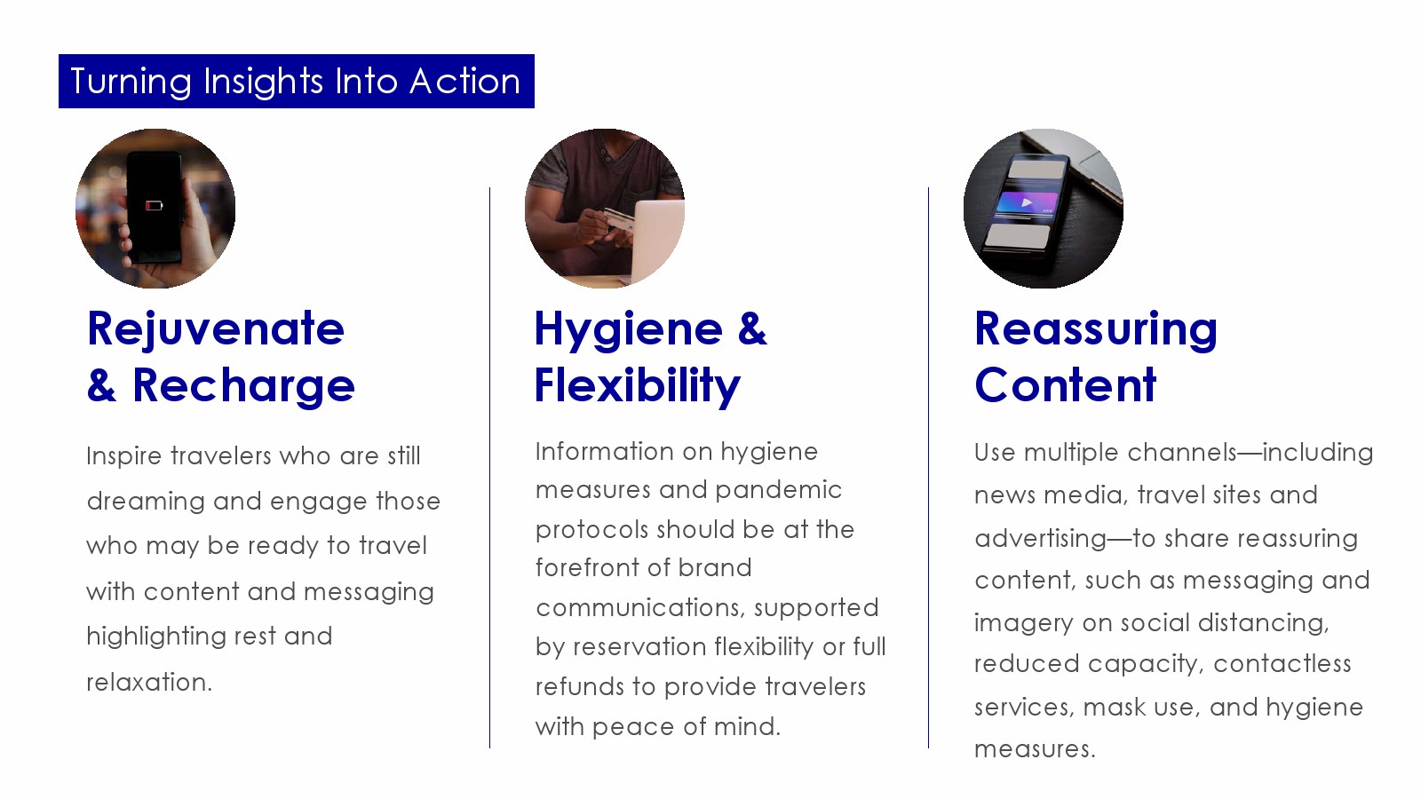 放心的内容:使用多种渠道(包括新闻媒体、旅游网站和广告)来共享令人放心的内容和图像,它们可以包括社会疏远或流量减少,非接触式服务,口罩实施政策以及严格的卫生措施等。