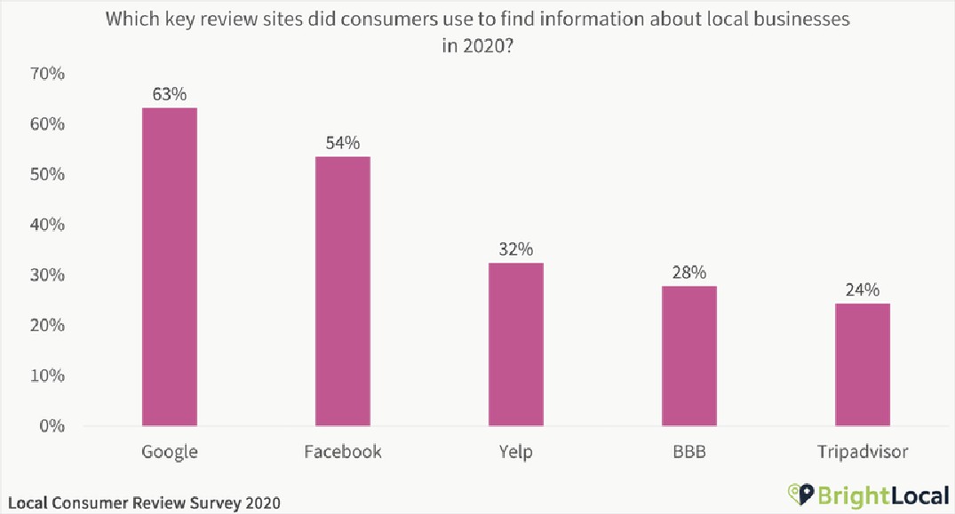 去年有93%的消费者使用互联网寻找本地商家,每天有34%的消费者进行搜索。2020年,87%的消费者阅读本地企业的在线评论,2019年为81%。31%的消费者表示,由于Covid-19他们在2020年阅读了更多评论,34%的消费者阅读了更少的评论。67%的消费者表示,如果评论中显示企业没有Covid-19健康与安全措施,他们不会继续与其来往。消费者最有可能阅读评论的行业:1餐厅、2酒店、3医疗、4汽车、5服装店。最重要的评价因素:1星级、2合法性、3新近度、4情感、5数量。只有48%的消费者会考虑使用少于4星的企业。73%的消费者仅关注上个月撰写的评论。72%的美国消费者为当地企业撰写了评论,与2019年的66%相比有很大的提高。撰写评论时,20%的消费者希望在一天之内收到回复。消费者最有可能在Google My Business上查看本地业务,但最信任Better Business Bureau。