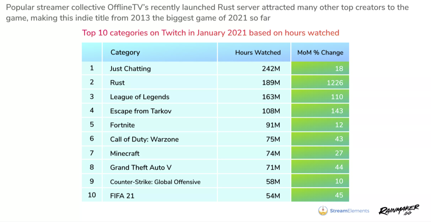 Twitch上个月的观看时长超过了20亿小时,而Facebook Gaming则超过了4.39亿小时,月环比增长13%。Twitch的非游戏类Just Chatting是其1月份最受欢迎的类别,累计观看时长达到2.42亿小时。紧随其后的是《Rust》(1.89亿)、《英雄联盟》(1.63亿)和《逃离塔科夫》(1.08亿)。每个类别都有月度增长,不过没有一个类别接近《Rust》1226%的涨幅。