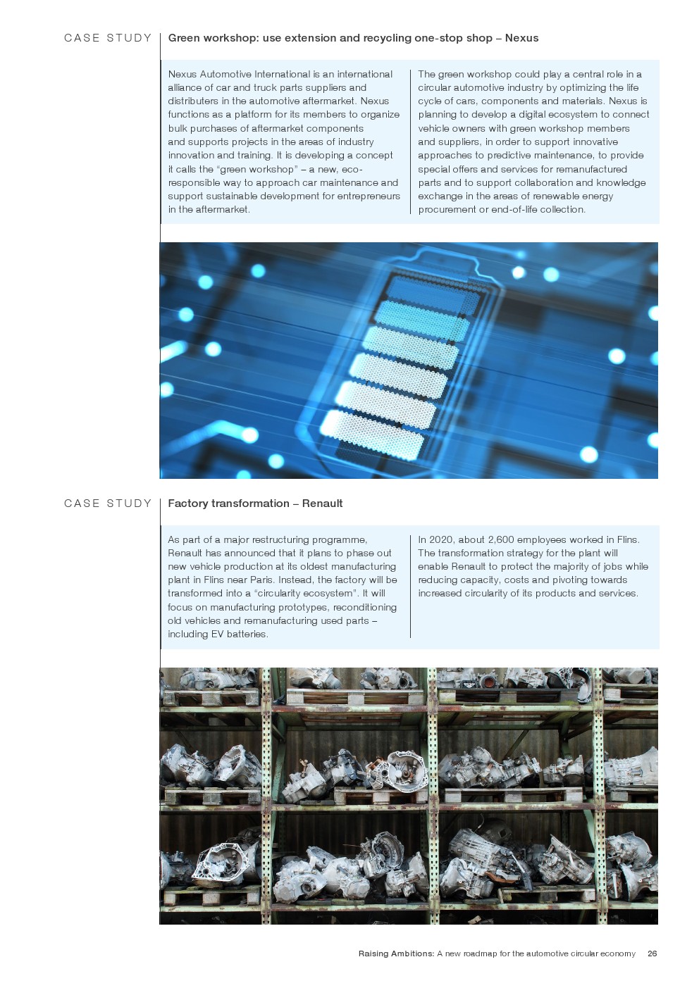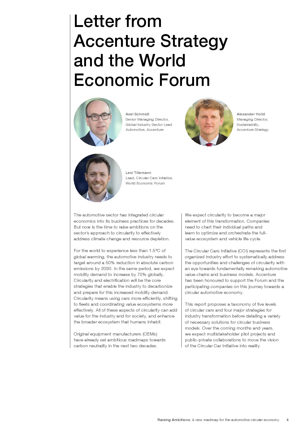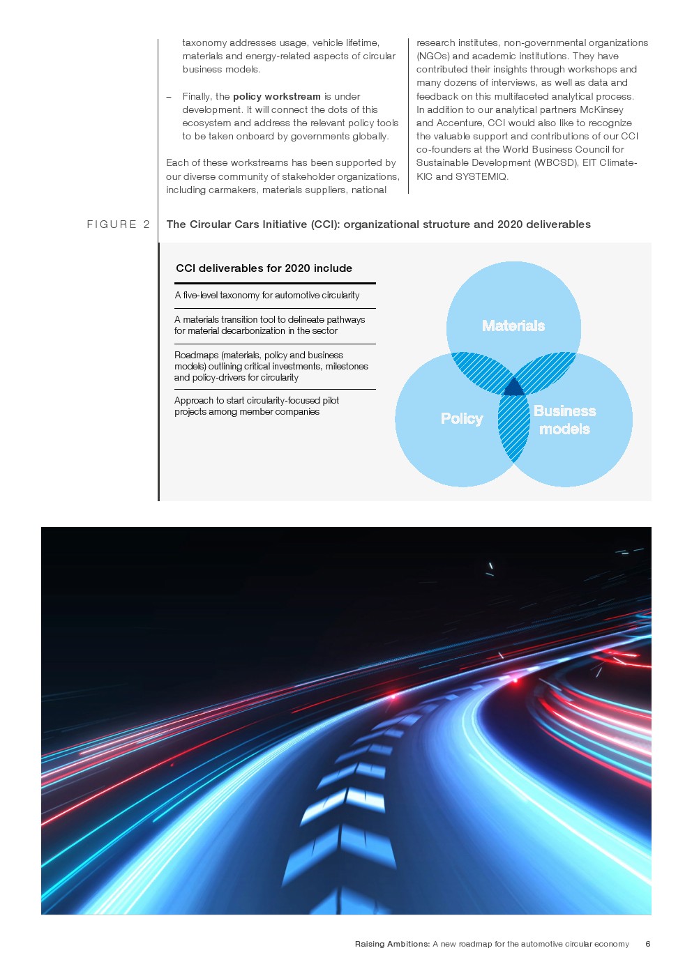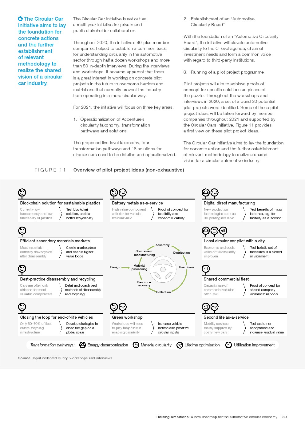 在整个车辆生命周期内实现净零碳排放(例如,低碳材料和装配,与能源网集成)。实现资源回收和闭合材料循环(例如,报废拆解和逆向物流、电动汽车电池回收)。延长车辆及其部件的使用寿命(例如,基于订阅的所有权、重复使用和大规模再制造)。确保随着时间的推移和占用率的提高有效地使用车辆(例如,按需车辆/机动性)。如果汽车业要在2050年实现净零碳排放的道路运输需求增长2.5倍的预测,那么汽车业和交通运输业将必须发生深刻的变化。循环汽车倡议将有助于找到加速这一转变的合作途径。