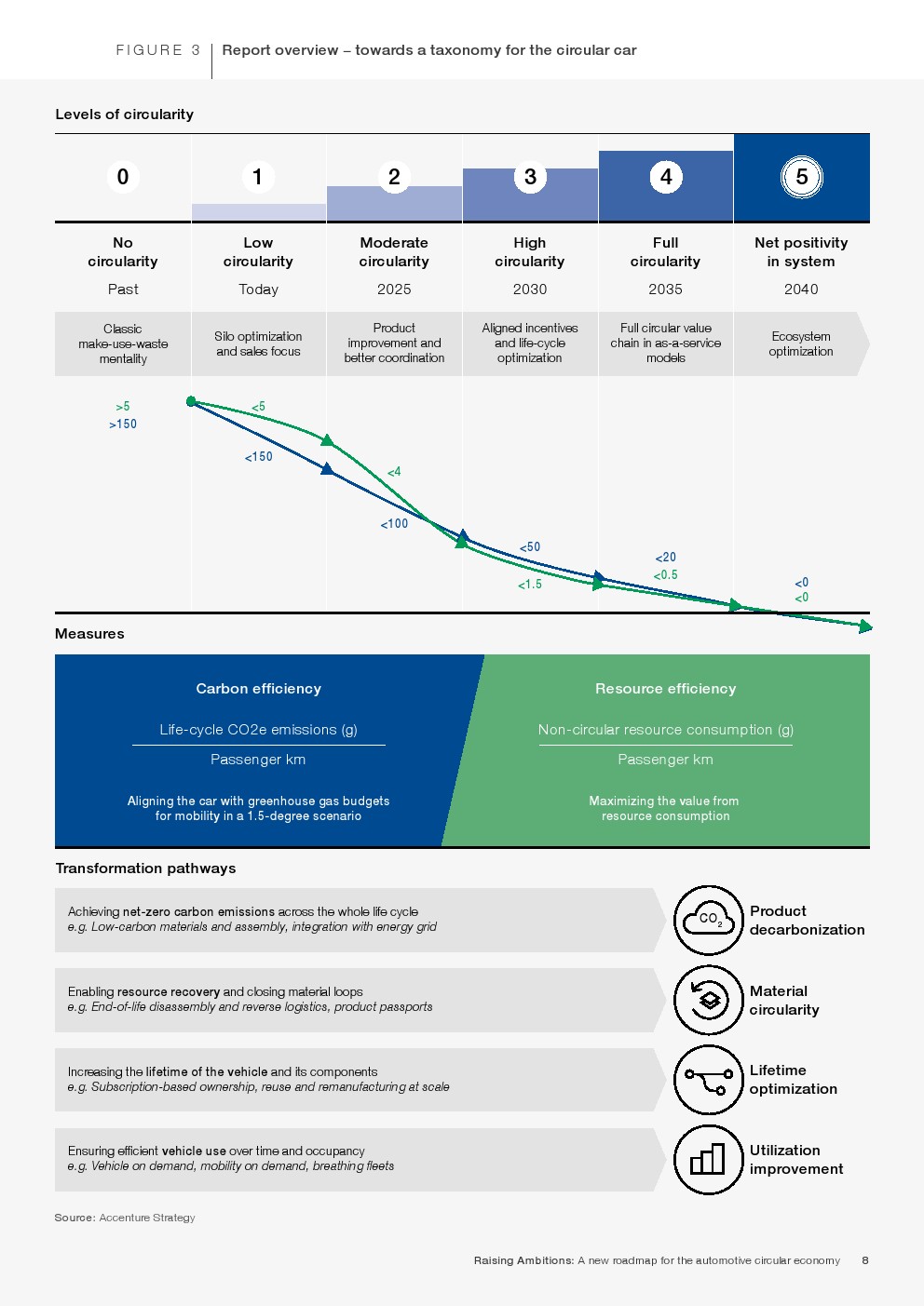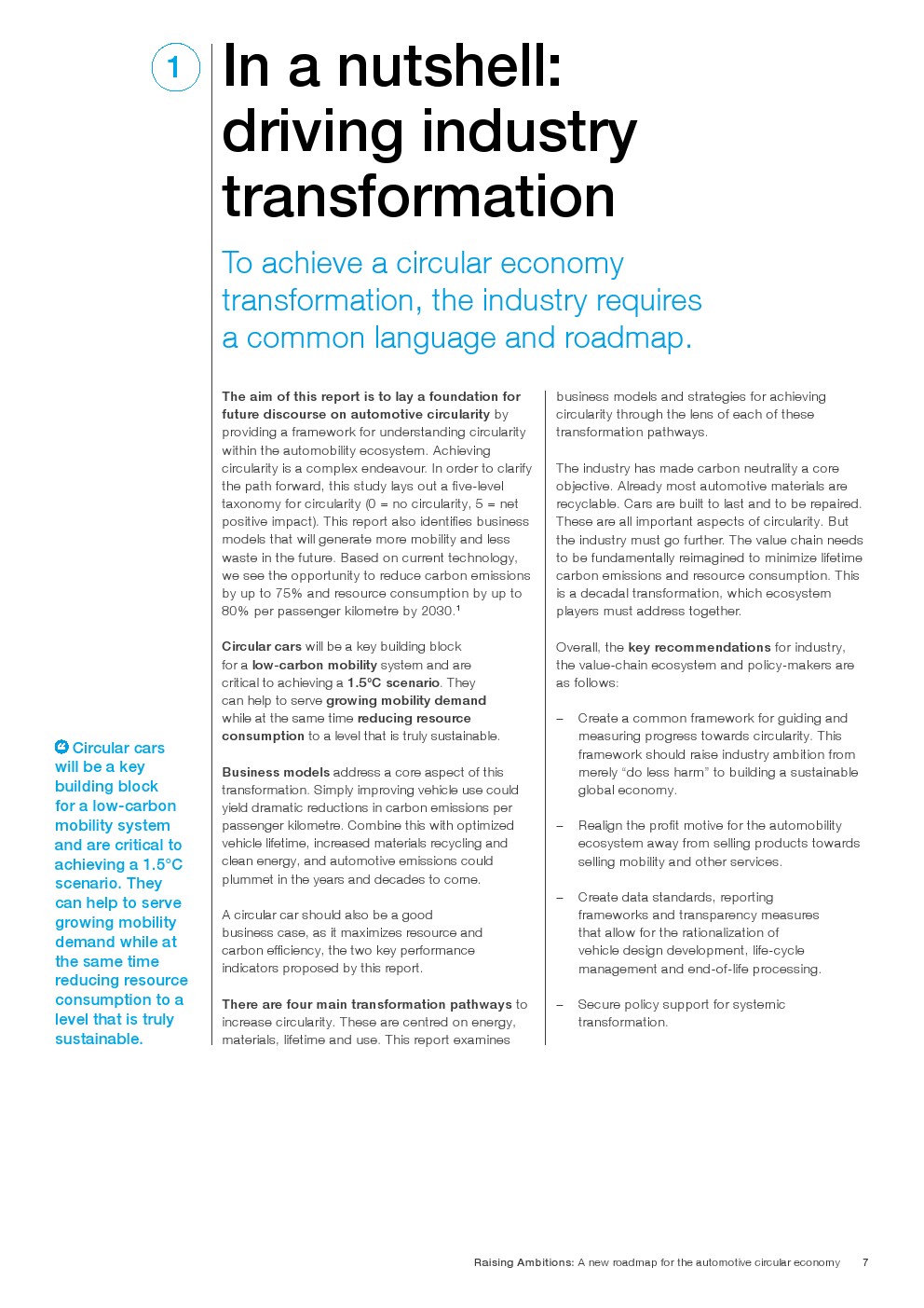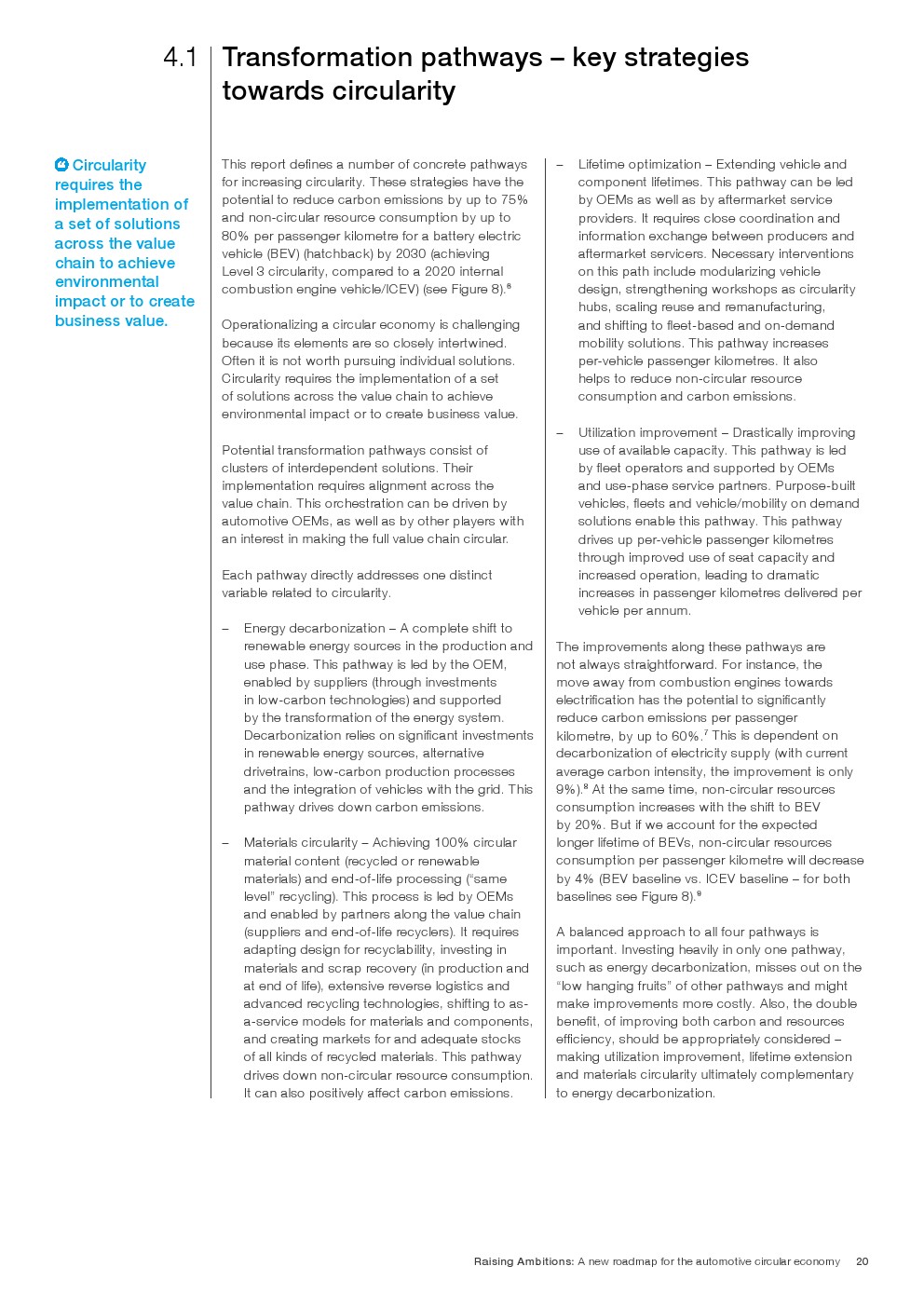 循环汽车将成为满足日益增长的需求的关键组成部分,同时将资源消耗和碳排放量降低到真正可持续的水平。根据这份报告,汽车生态系统的循环性可以通过四个关键的转化途径来实现: