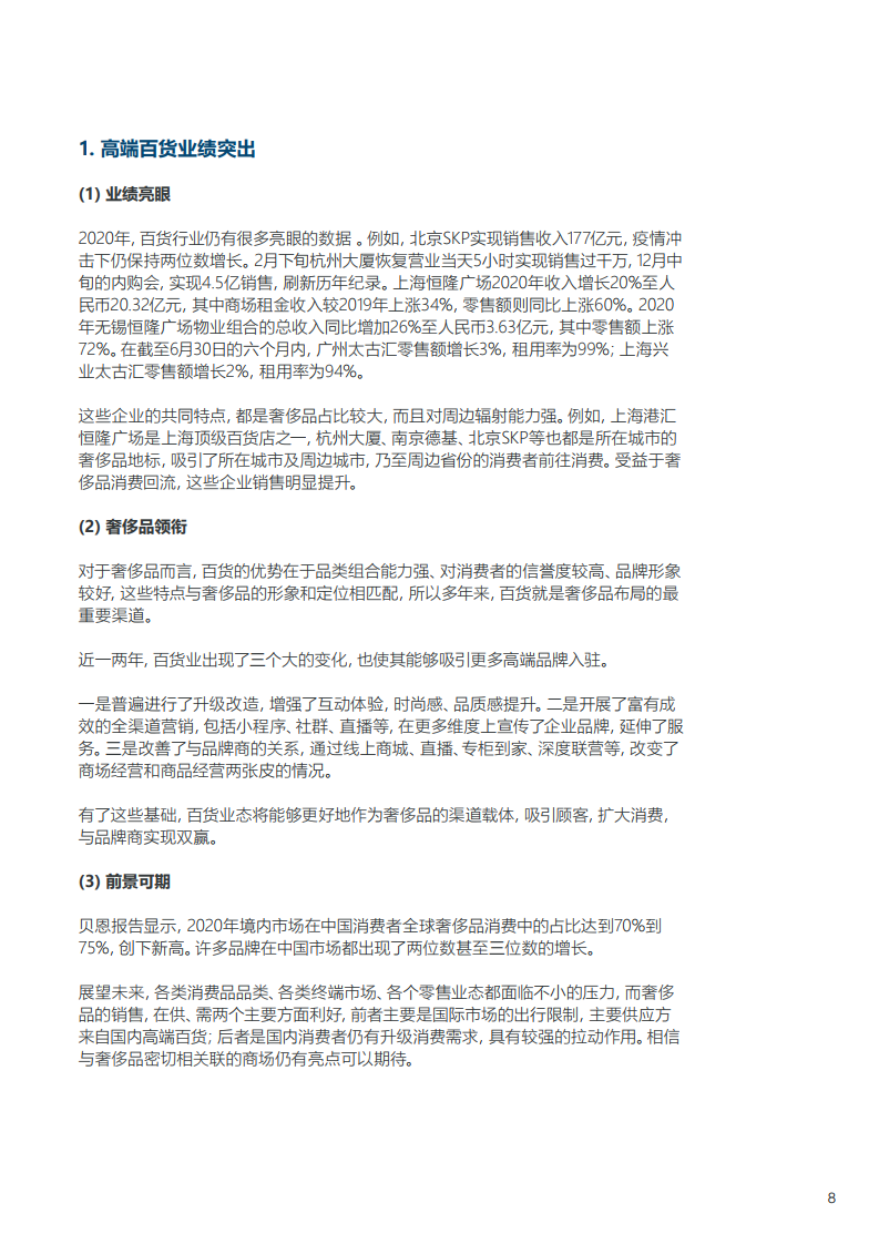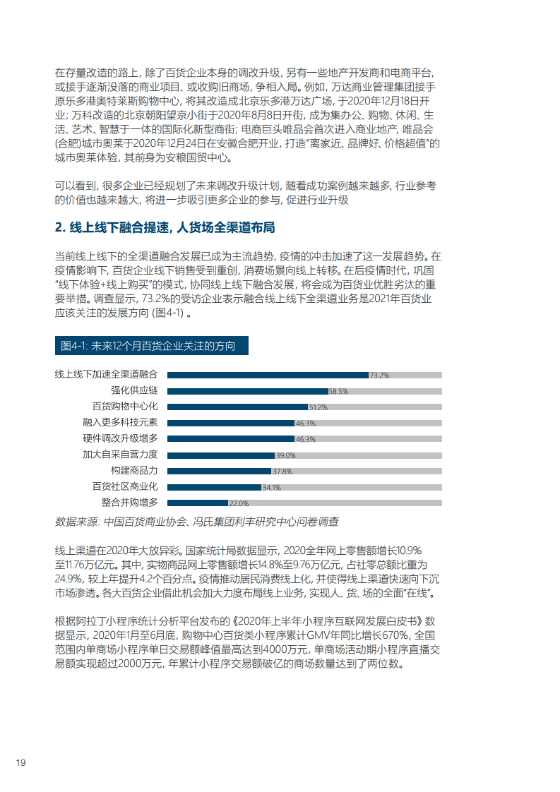 报告显示,2020年初突如其来的新冠疫情大大加快了中国百货企业的转型步伐,各环节数字化进程明显提速,百货企业积极拥抱社交电商和直播带货,并利用各类平台搭建私域流量。