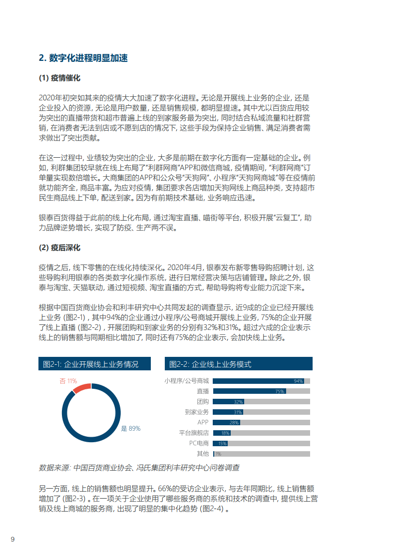 疫情迫使百货企业加快开展线上线下融合的全渠道业务。根据中国百货商业协会和利丰研究中心共同发起的问卷调查,近九成受访企业表示已经开展线上业务,业务模式包括微信小程序/公众号商城、直播带货、团购服务、到家业务等。另外,66%的受访企业表示,与去年同期相比,线上业务销售额有明显提升。