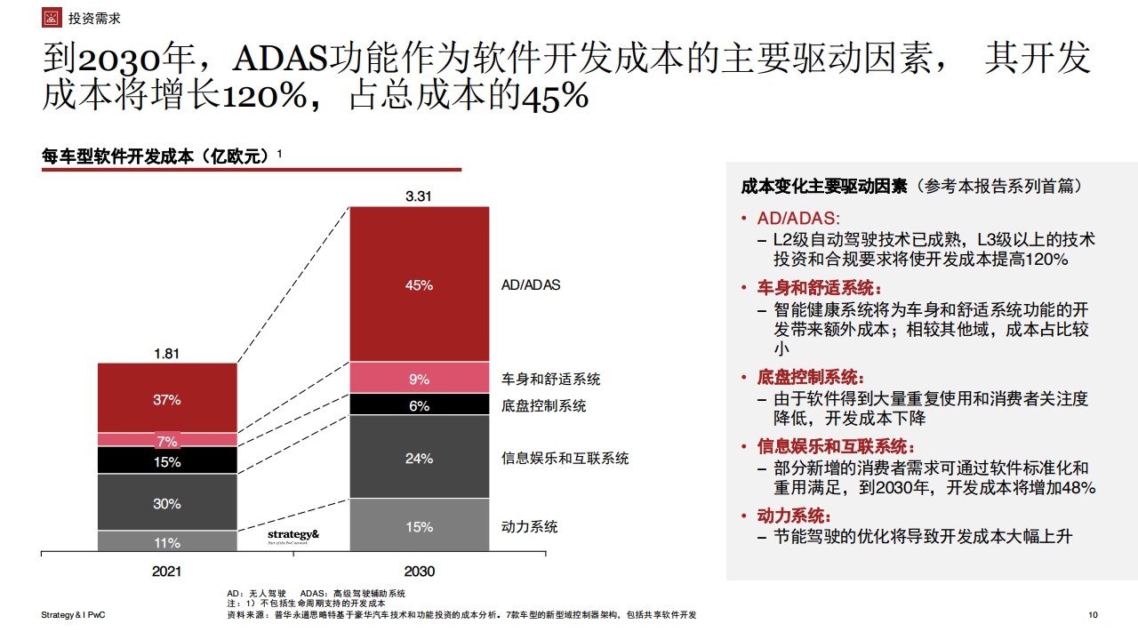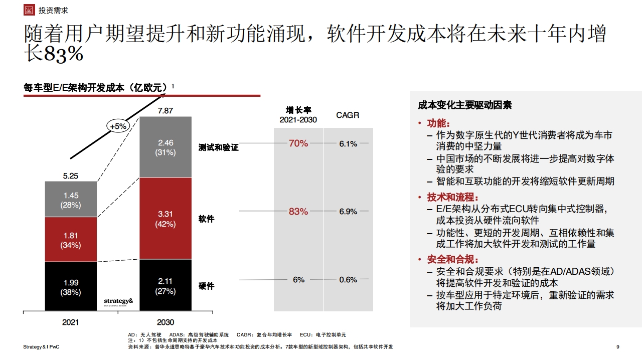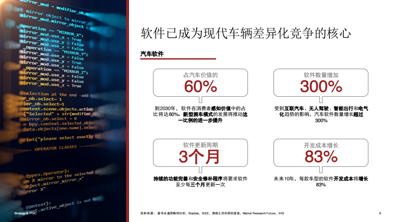 汽车产品和相关服务将随着智能和互联功能方面的需求增加迎来重大改变,软件开发成本将在未来十年内增长83%,软件已成为现代车辆差异化竞争的核心。