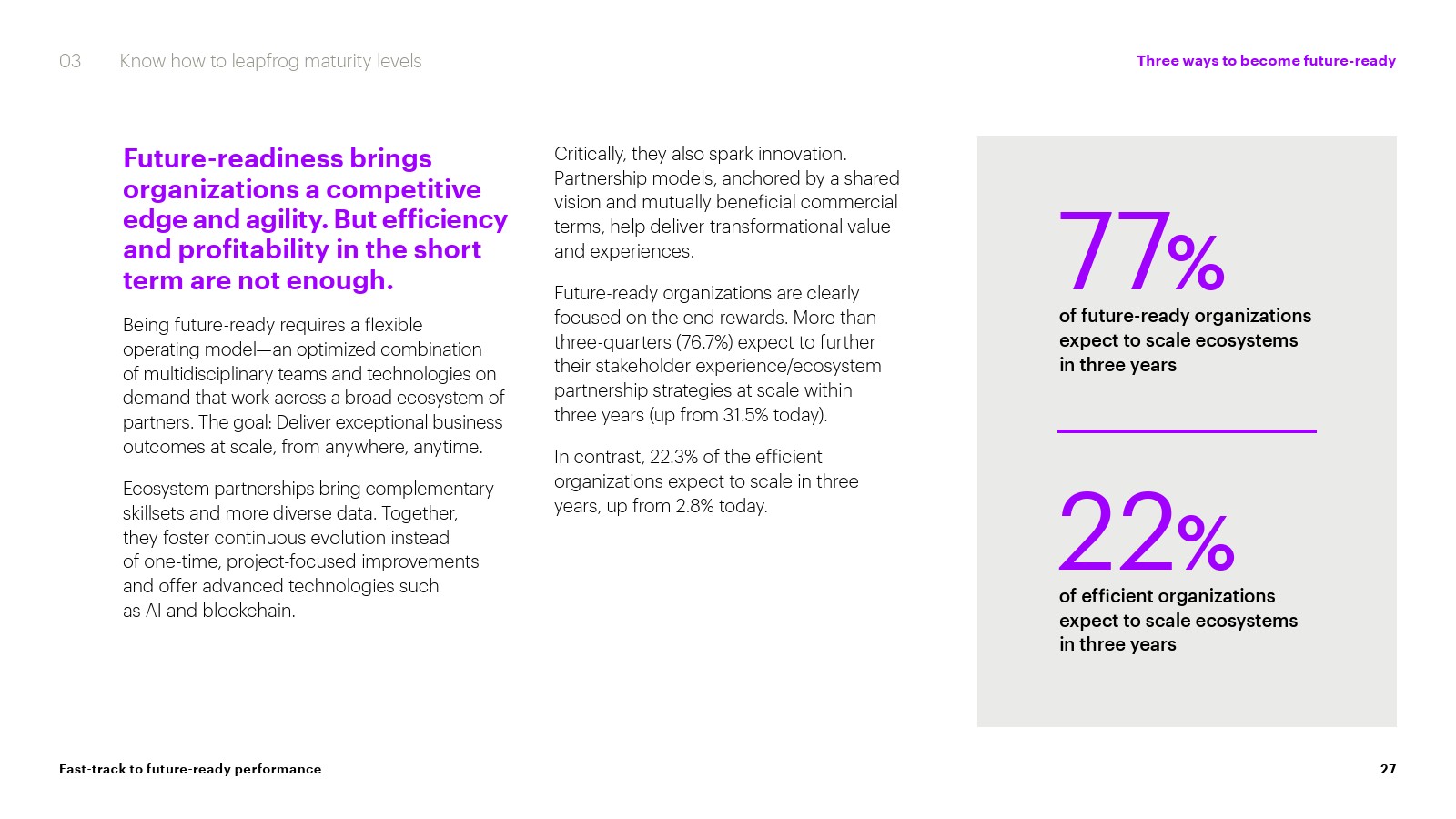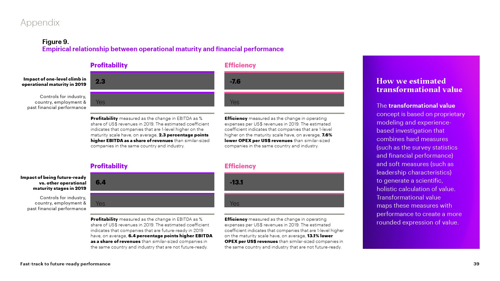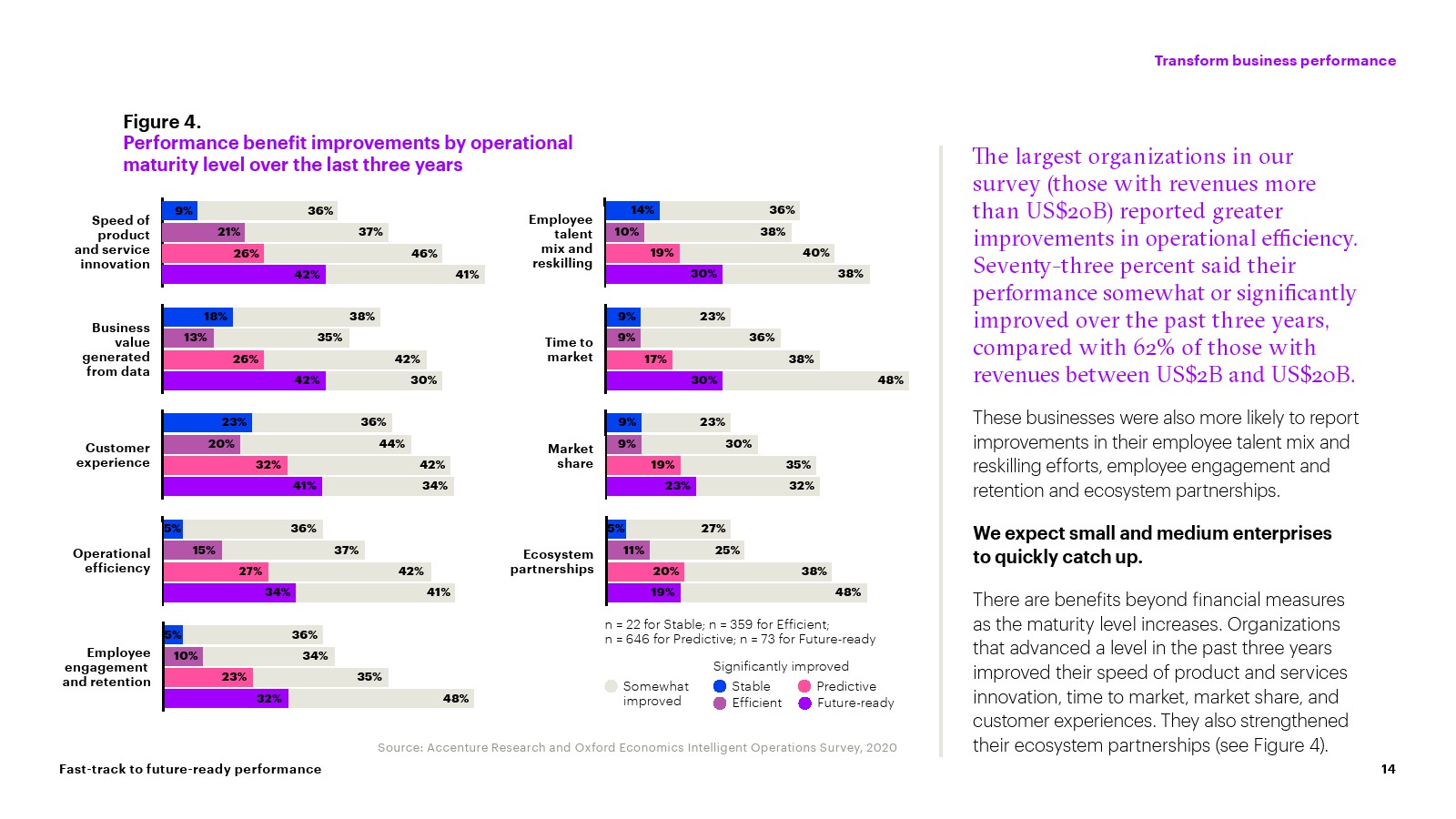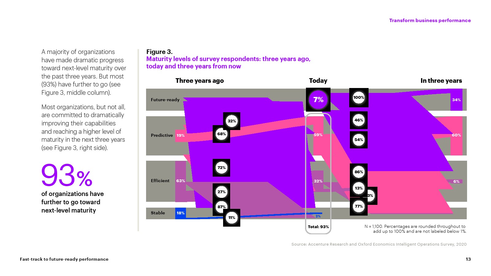 云:90%的面向未来的企业大规模使用云基础设施(其他企业为76%),78%的企业还在探索新的领域来扩展和最大化价值。机器智能:71%的面向未来的企业已经完全采用了人工智能和数据科学功能,38%的企业现在扩展了人工智能实践,而其他企业的这一比例仅为3%。规模化自动化:2/3的面向未来的企业(67%)采用了端到端数字化流程,58%的企业继续扩展领先实践,而其他企业的这一比例分别为32%和6%。预计到2023年,82%的公司将扩大领先实践的规模。更智能的数据:面向未来的企业使用大规模分析的可能性是其他企业的10倍以上(52% vs 5%),与更好、更多样化的数据集(45% vs 6%)相结合,以产生可操作的见解并为决策提供信息。敏捷的员工队伍:34%的面向未来的企业大规模采用了敏捷员工队伍战略,而其他企业中只有4%。埃森哲估计,到2023年,71%的公司将采用灵活的劳动力战略。目前,所有行业的企业都处于不同的运营成熟度水平。调查结果表明,保险业(10%)和高科技行业(9%)面向未来的企业所占比例普遍高于其他行业。但是,随着疫情迫使数字化加速,埃森哲预测,到2023年一些行业将实现飞跃,汽车(48%)、保险(42%)和银行业(37%)预计将成为领跑者。