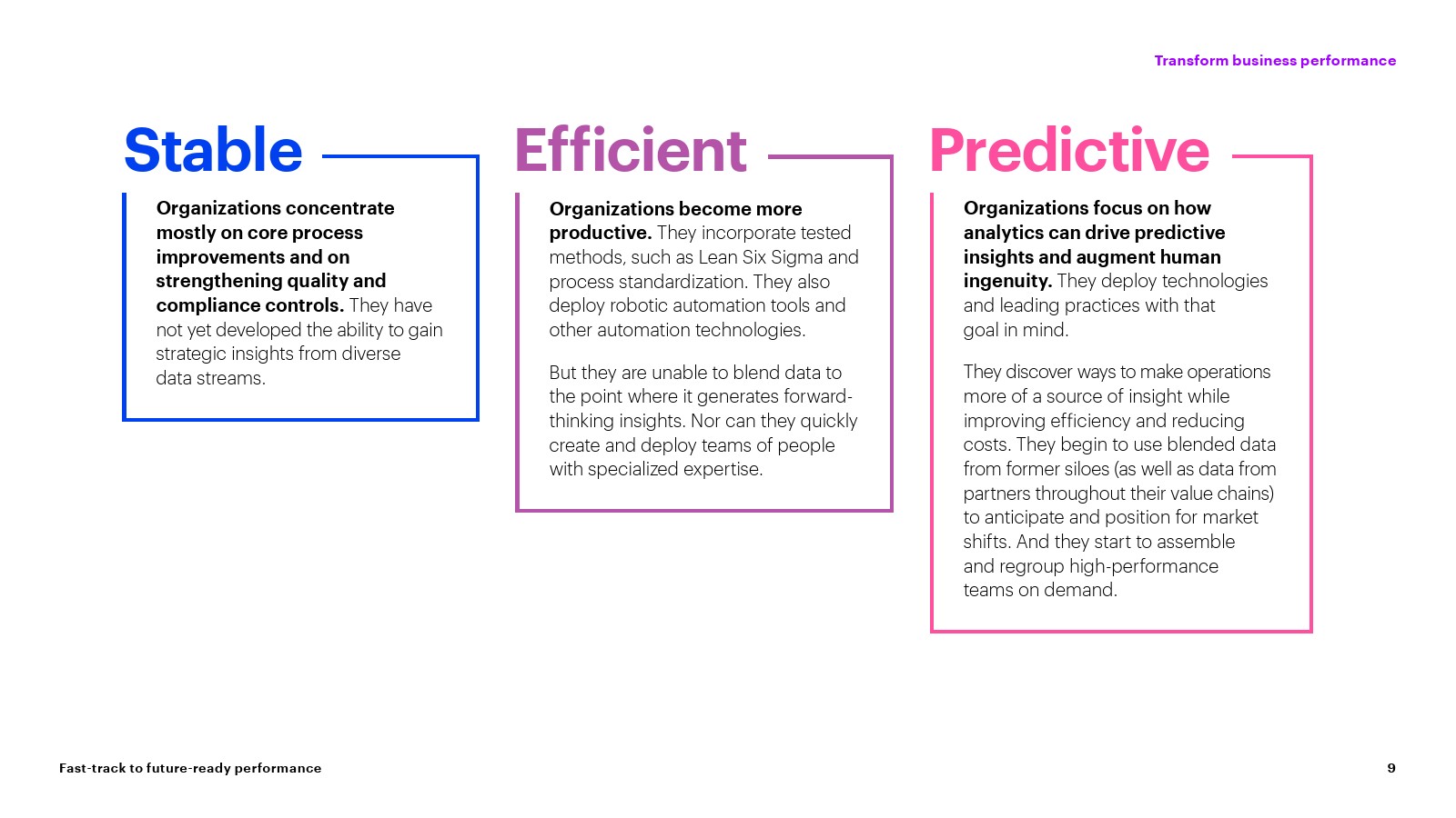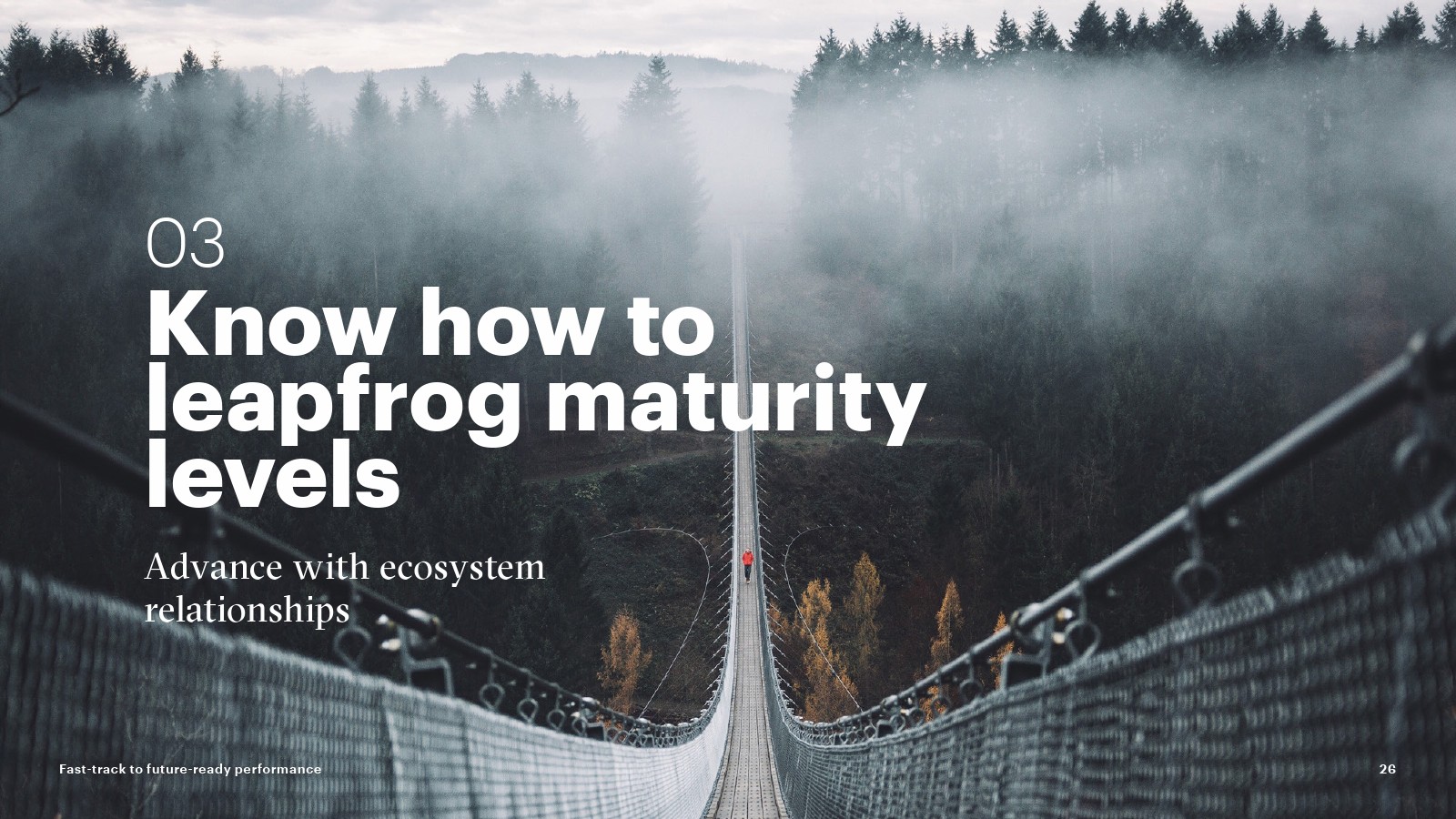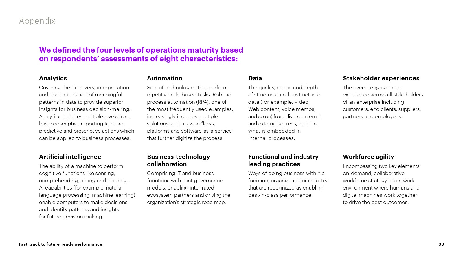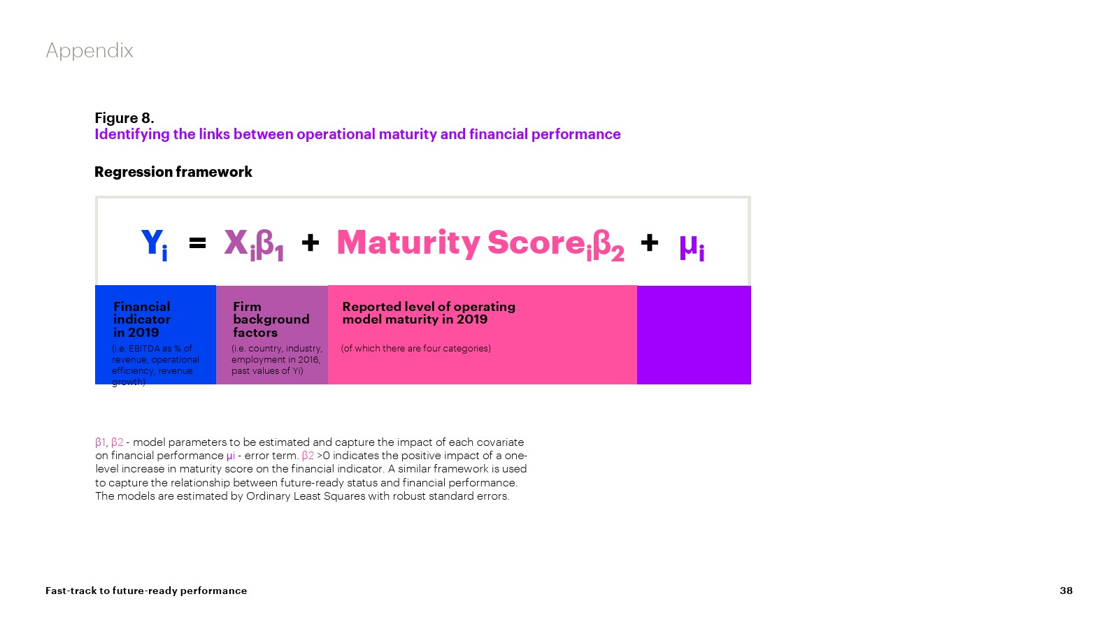 云:90%的面向未来的企业大规模使用云基础设施(其他企业为76%),78%的企业还在探索新的领域来扩展和最大化价值。机器智能:71%的面向未来的企业已经完全采用了人工智能和数据科学功能,38%的企业现在扩展了人工智能实践,而其他企业的这一比例仅为3%。规模化自动化:2/3的面向未来的企业(67%)采用了端到端数字化流程,58%的企业继续扩展领先实践,而其他企业的这一比例分别为32%和6%。预计到2023年,82%的公司将扩大领先实践的规模。更智能的数据:面向未来的企业使用大规模分析的可能性是其他企业的10倍以上(52% vs 5%),与更好、更多样化的数据集(45% vs 6%)相结合,以产生可操作的见解并为决策提供信息。敏捷的员工队伍:34%的面向未来的企业大规模采用了敏捷员工队伍战略,而其他企业中只有4%。埃森哲估计,到2023年,71%的公司将采用灵活的劳动力战略。目前,所有行业的企业都处于不同的运营成熟度水平。调查结果表明,保险业(10%)和高科技行业(9%)面向未来的企业所占比例普遍高于其他行业。但是,随着疫情迫使数字化加速,埃森哲预测,到2023年一些行业将实现飞跃,汽车(48%)、保险(42%)和银行业(37%)预计将成为领跑者。