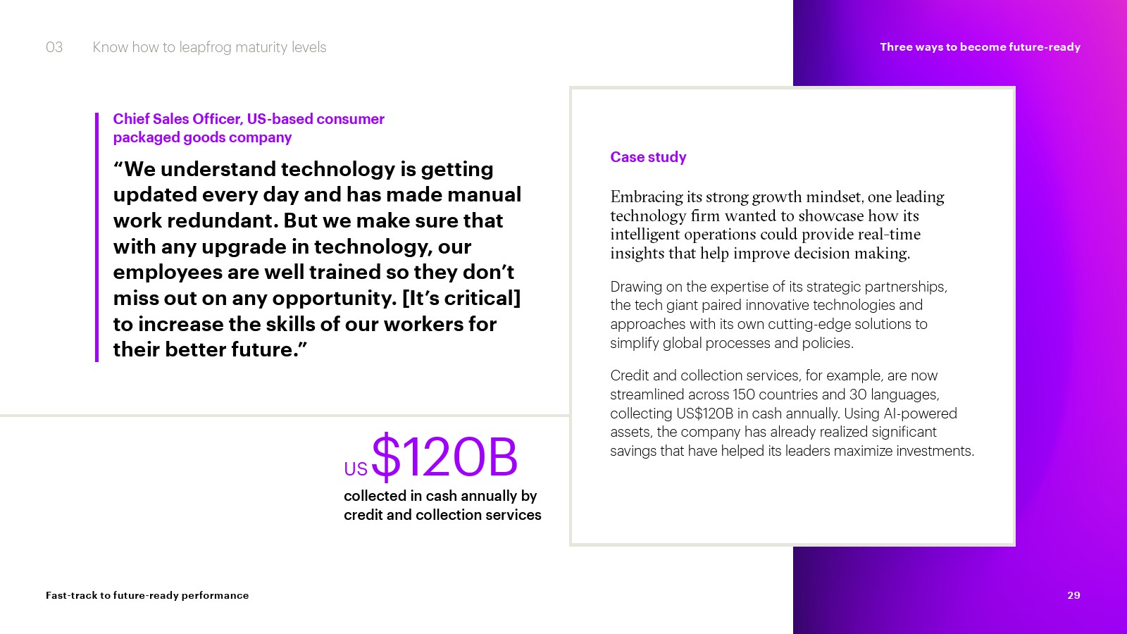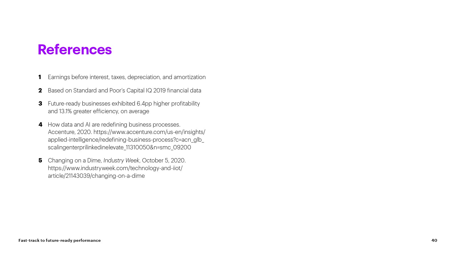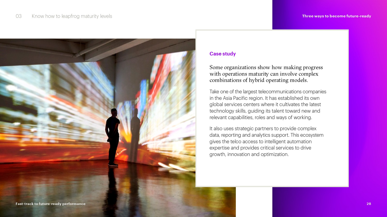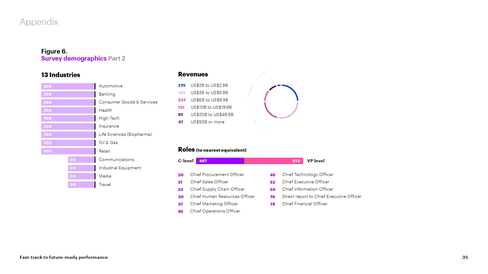 云:90%的面向未来的企业大规模使用云基础设施(其他企业为76%),78%的企业还在探索新的领域来扩展和最大化价值。机器智能:71%的面向未来的企业已经完全采用了人工智能和数据科学功能,38%的企业现在扩展了人工智能实践,而其他企业的这一比例仅为3%。规模化自动化:2/3的面向未来的企业(67%)采用了端到端数字化流程,58%的企业继续扩展领先实践,而其他企业的这一比例分别为32%和6%。预计到2023年,82%的公司将扩大领先实践的规模。更智能的数据:面向未来的企业使用大规模分析的可能性是其他企业的10倍以上(52% vs 5%),与更好、更多样化的数据集(45% vs 6%)相结合,以产生可操作的见解并为决策提供信息。敏捷的员工队伍:34%的面向未来的企业大规模采用了敏捷员工队伍战略,而其他企业中只有4%。埃森哲估计,到2023年,71%的公司将采用灵活的劳动力战略。目前,所有行业的企业都处于不同的运营成熟度水平。调查结果表明,保险业(10%)和高科技行业(9%)面向未来的企业所占比例普遍高于其他行业。但是,随着疫情迫使数字化加速,埃森哲预测,到2023年一些行业将实现飞跃,汽车(48%)、保险(42%)和银行业(37%)预计将成为领跑者。