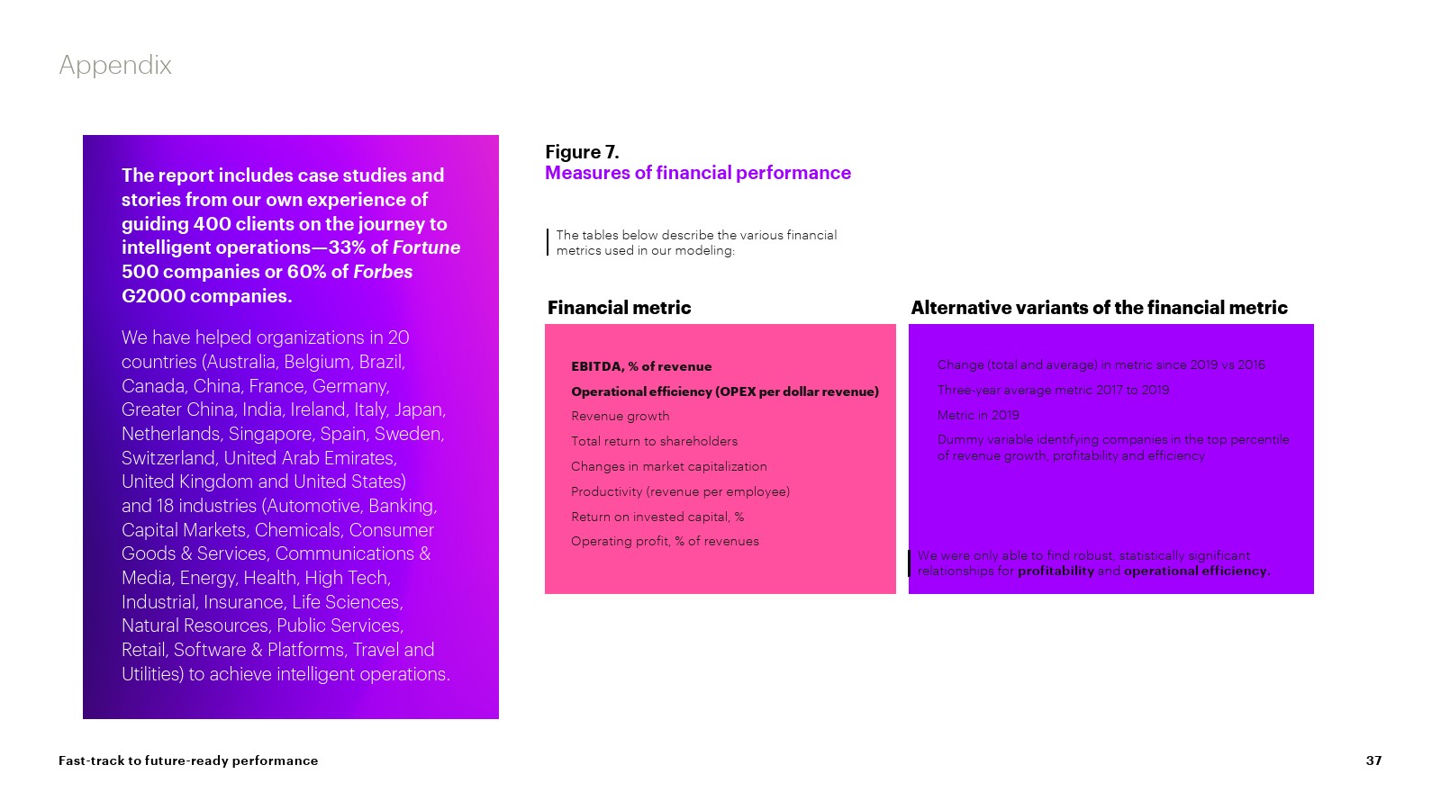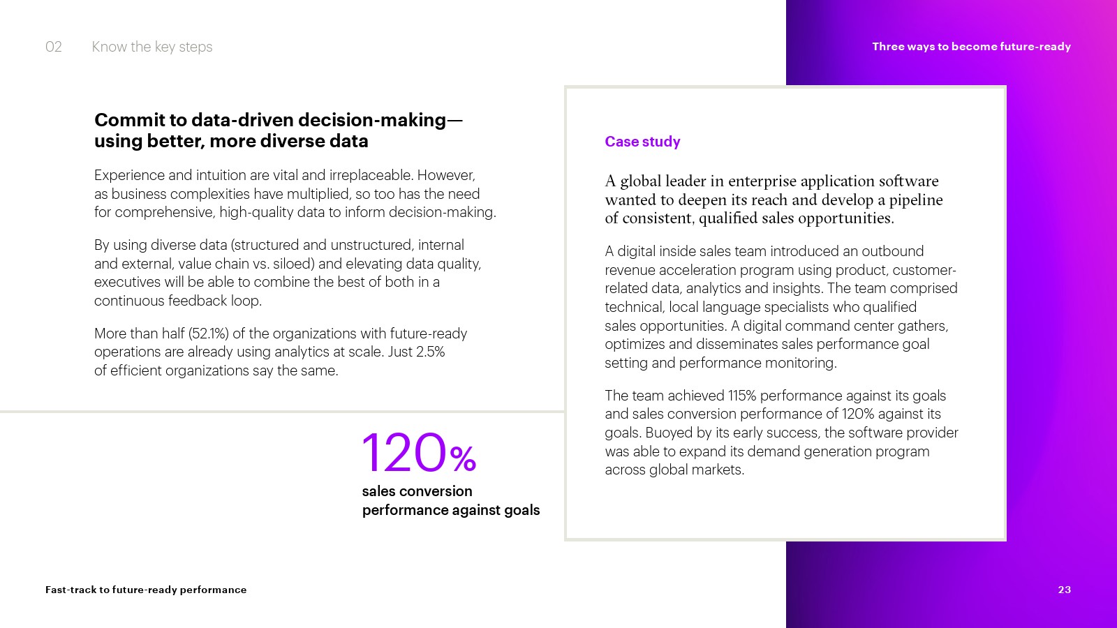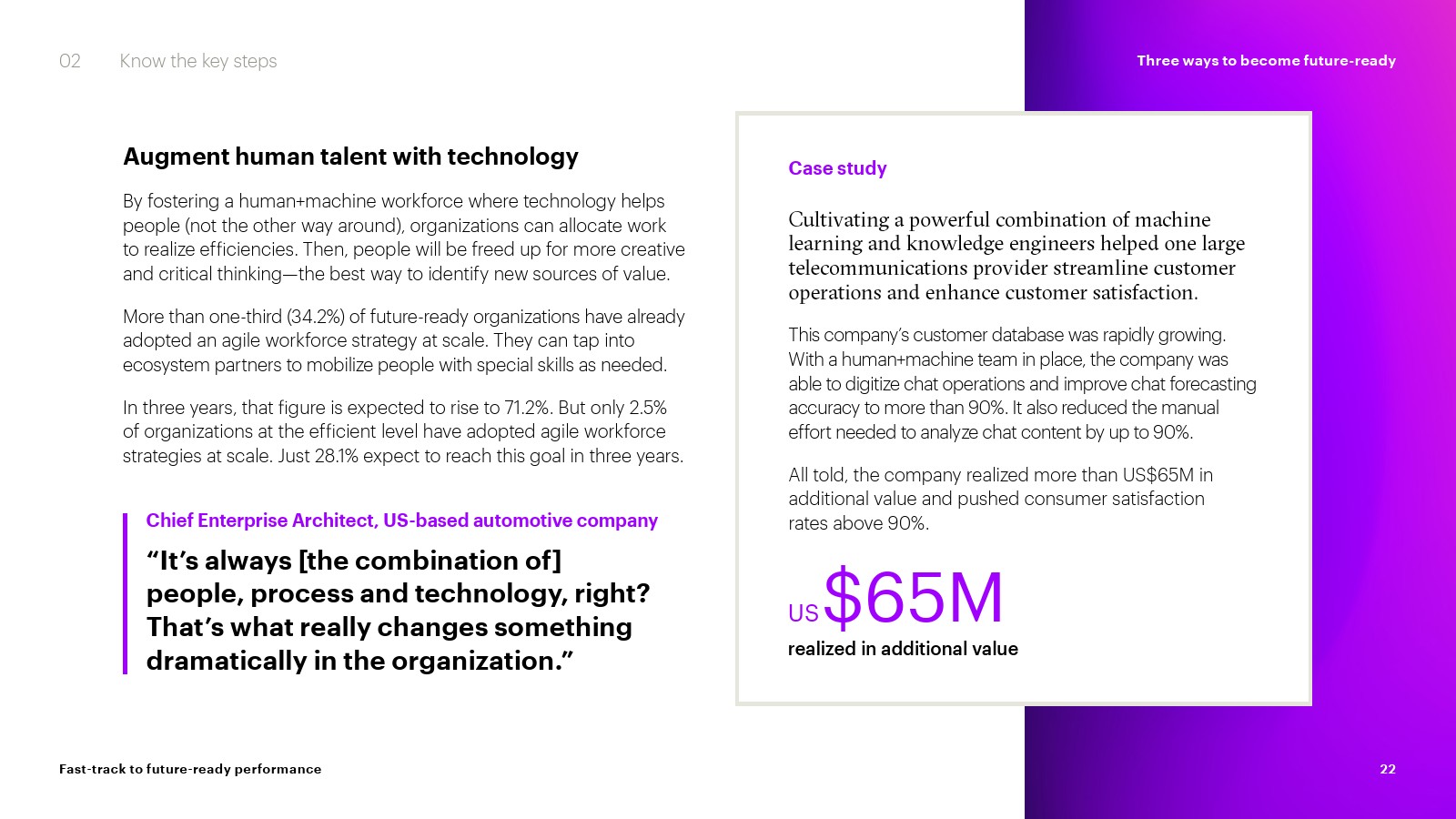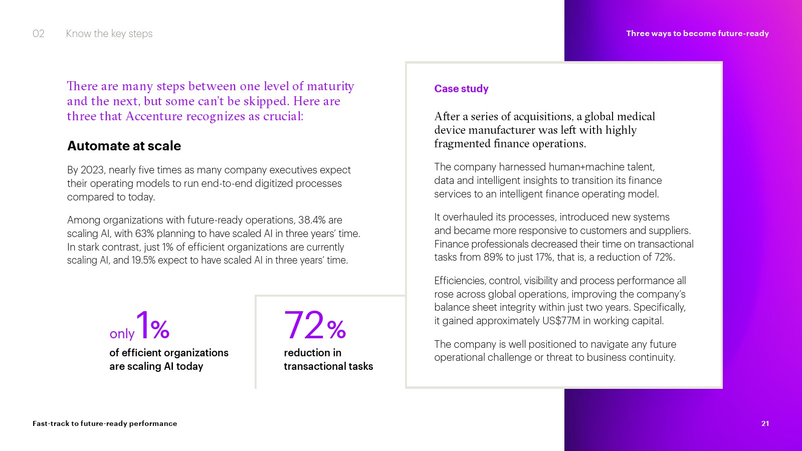 云:90%的面向未来的企业大规模使用云基础设施(其他企业为76%),78%的企业还在探索新的领域来扩展和最大化价值。机器智能:71%的面向未来的企业已经完全采用了人工智能和数据科学功能,38%的企业现在扩展了人工智能实践,而其他企业的这一比例仅为3%。规模化自动化:2/3的面向未来的企业(67%)采用了端到端数字化流程,58%的企业继续扩展领先实践,而其他企业的这一比例分别为32%和6%。预计到2023年,82%的公司将扩大领先实践的规模。更智能的数据:面向未来的企业使用大规模分析的可能性是其他企业的10倍以上(52% vs 5%),与更好、更多样化的数据集(45% vs 6%)相结合,以产生可操作的见解并为决策提供信息。敏捷的员工队伍:34%的面向未来的企业大规模采用了敏捷员工队伍战略,而其他企业中只有4%。埃森哲估计,到2023年,71%的公司将采用灵活的劳动力战略。目前,所有行业的企业都处于不同的运营成熟度水平。调查结果表明,保险业(10%)和高科技行业(9%)面向未来的企业所占比例普遍高于其他行业。但是,随着疫情迫使数字化加速,埃森哲预测,到2023年一些行业将实现飞跃,汽车(48%)、保险(42%)和银行业(37%)预计将成为领跑者。