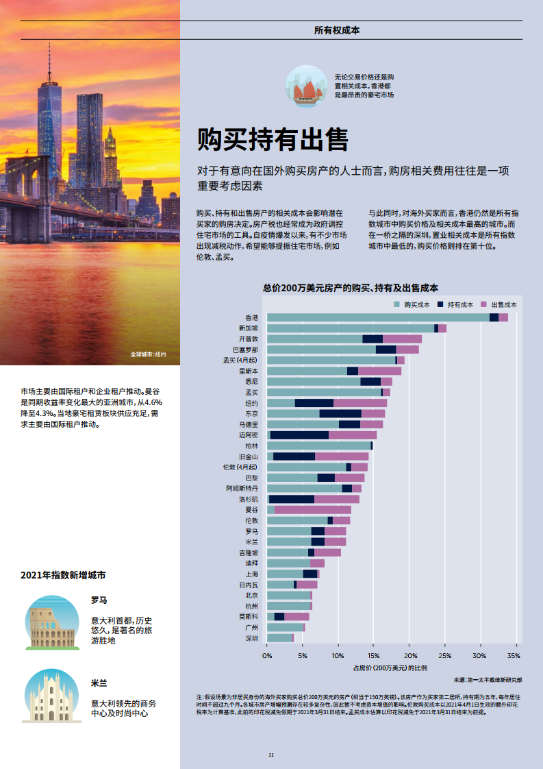 第一太平戴维斯世界城市豪宅指数追踪了30个全球城市的豪宅市场表现。指数变化能够反映2020年疫情对豪宅价值和租金的影响。指数城市的豪宅平均价格仍处在正增长区间,预计增势将在2021年得到强化。许多国家开启疫苗接种,对整体市场而言是一大利好。据此我们也对未来一年表现最好的市场进行了预测。