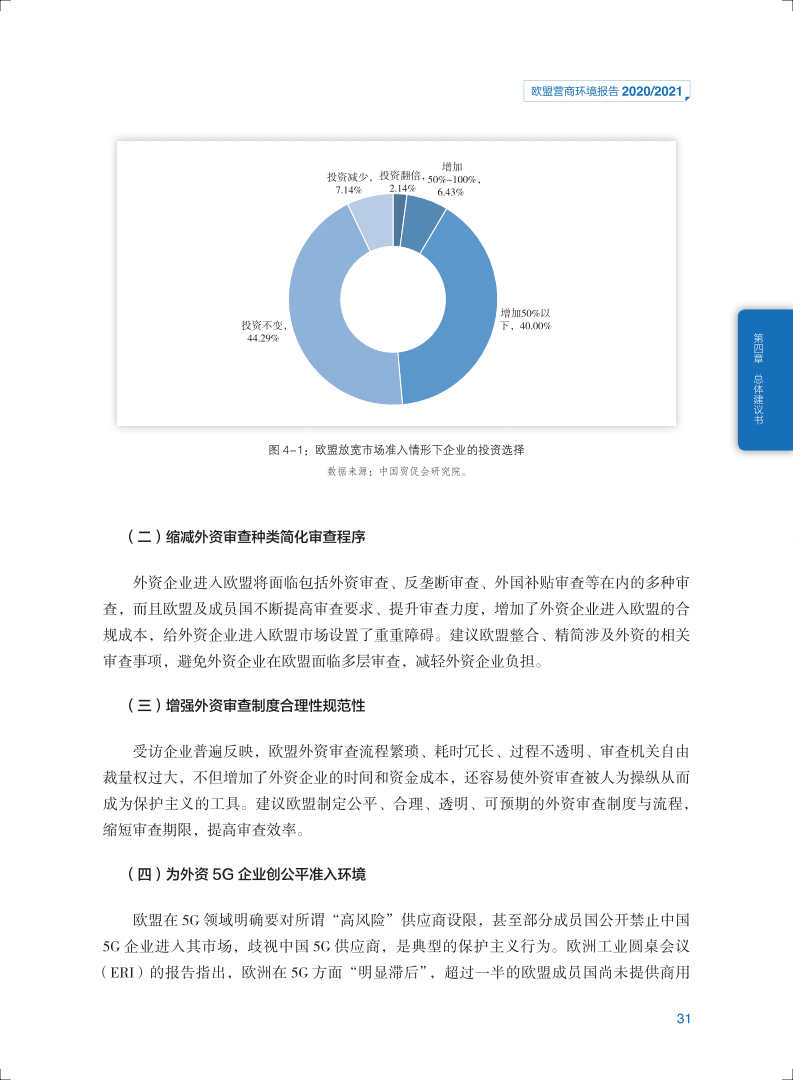 《报告》认为,新冠肺炎疫情期间欧盟保护主义抬头迹象明显,令企业进入欧盟市场愈发困难,打击外资企业对欧盟投资信心,在欧中资企业对欧盟未来营商环境预期趋于悲观。由于保护主义抬头叠加新冠肺炎疫情的双重因素,欧盟营商环境呈现了三方面突出问题:一是欧盟及部分成员国进一步收紧外资审查导致外资市场准入方面出现倒退,具体表现在多国降低外资审查的触发门槛、外资审查的产业范围扩大、大幅度延长审查时限、强化事前行政审批流程等;二是欧盟发布外国补贴白皮书筑起新的保护壁垒;三是欧盟政策执行层面对外资的歧视愈发严重,在欧中资企业难以平等地享受到欧盟的扶持政策。