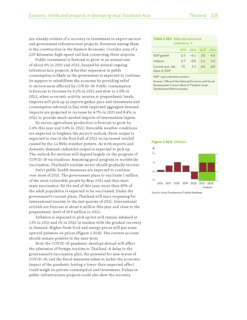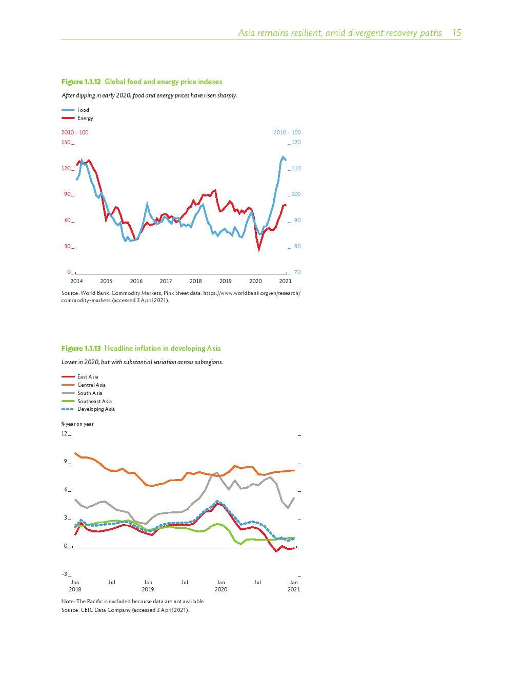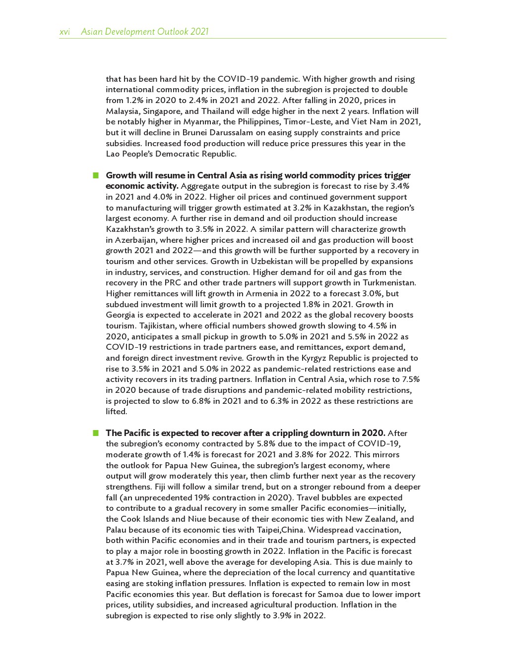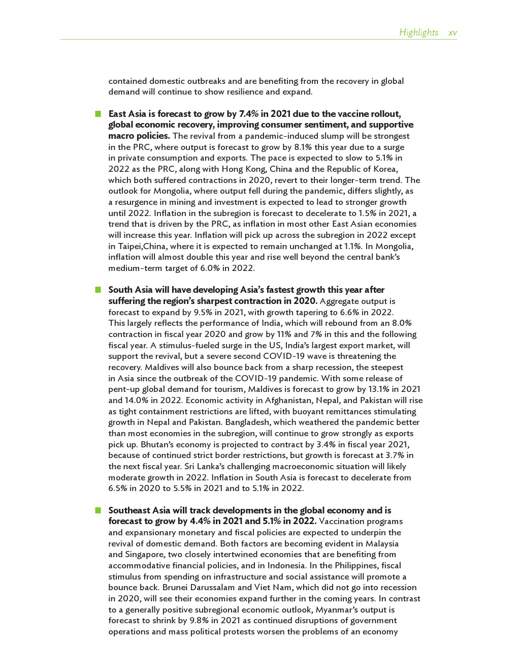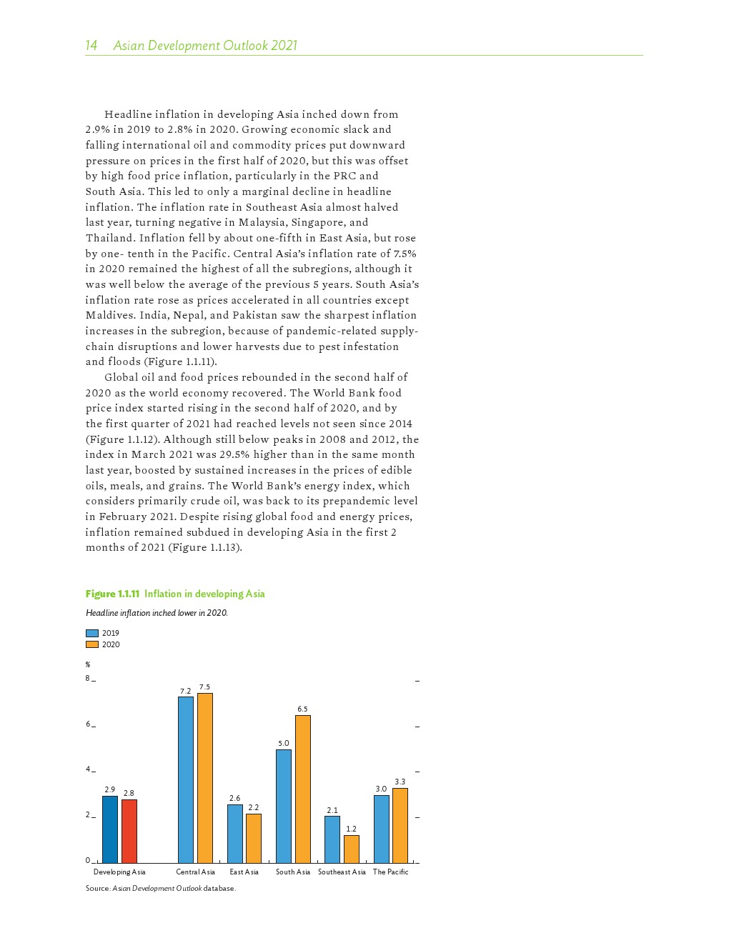 亚洲发展中地区的增长势头强劲,但新冠病毒的爆发表明,这种流行病仍然是一种威胁。即便如此,在全球健康复苏和疫苗研发的支持下,该地区的经济复苏仍在进行中。预计2021年该地区经济增长将反弹至7.3%,2022年将放缓至5.3%。不包括高收入新兴工业化经济体,预计今年和明年的经济增长率分别为7.7%和5.6%。2020年小幅下降之后,由于食品价格压力的缓解,预计2021年整体通胀率将降至2.3%,2022年物价将上涨2.7%。