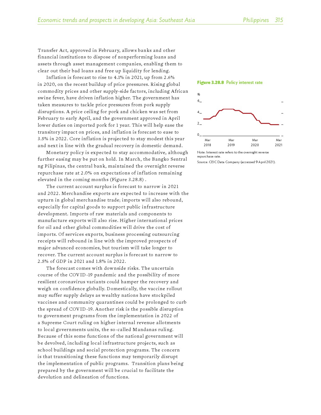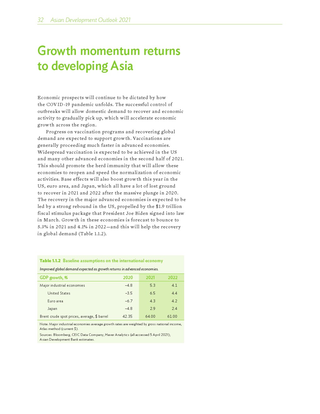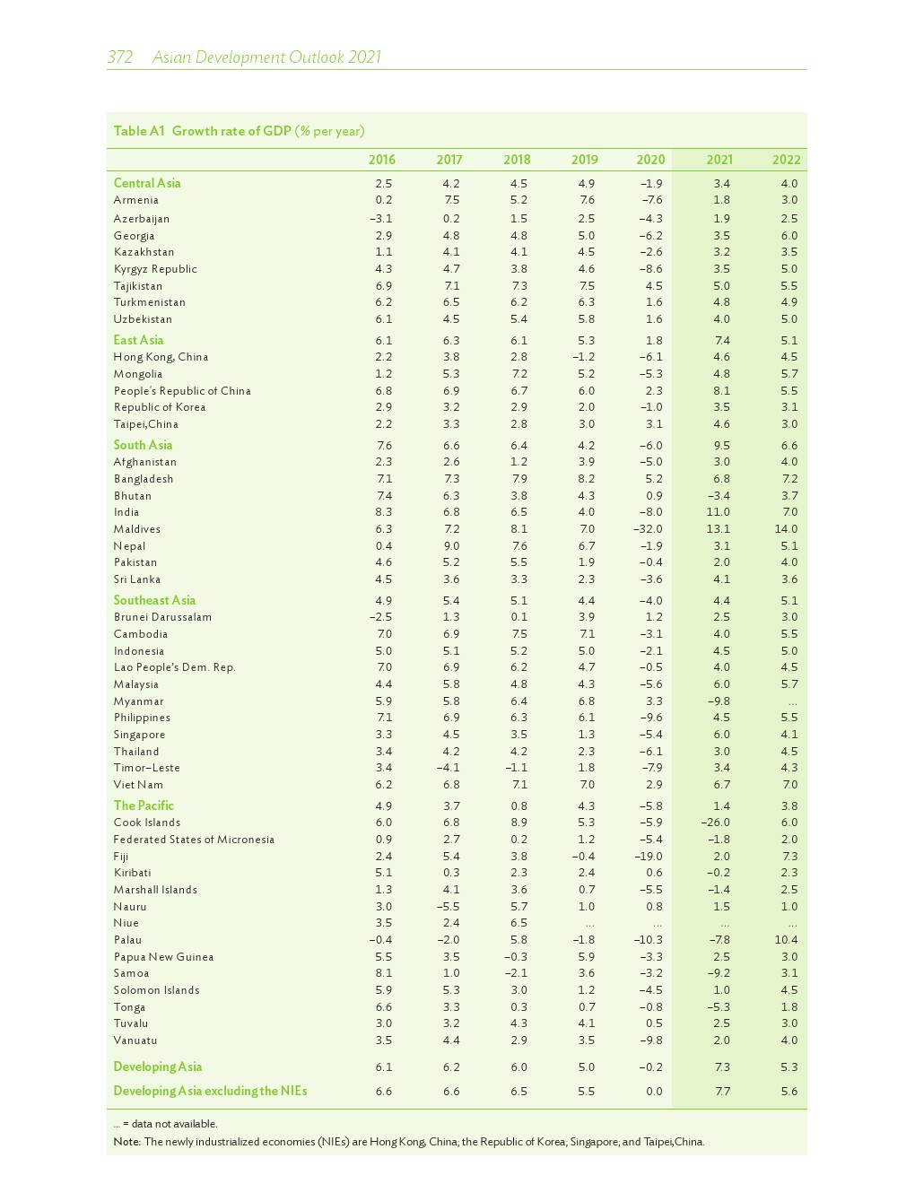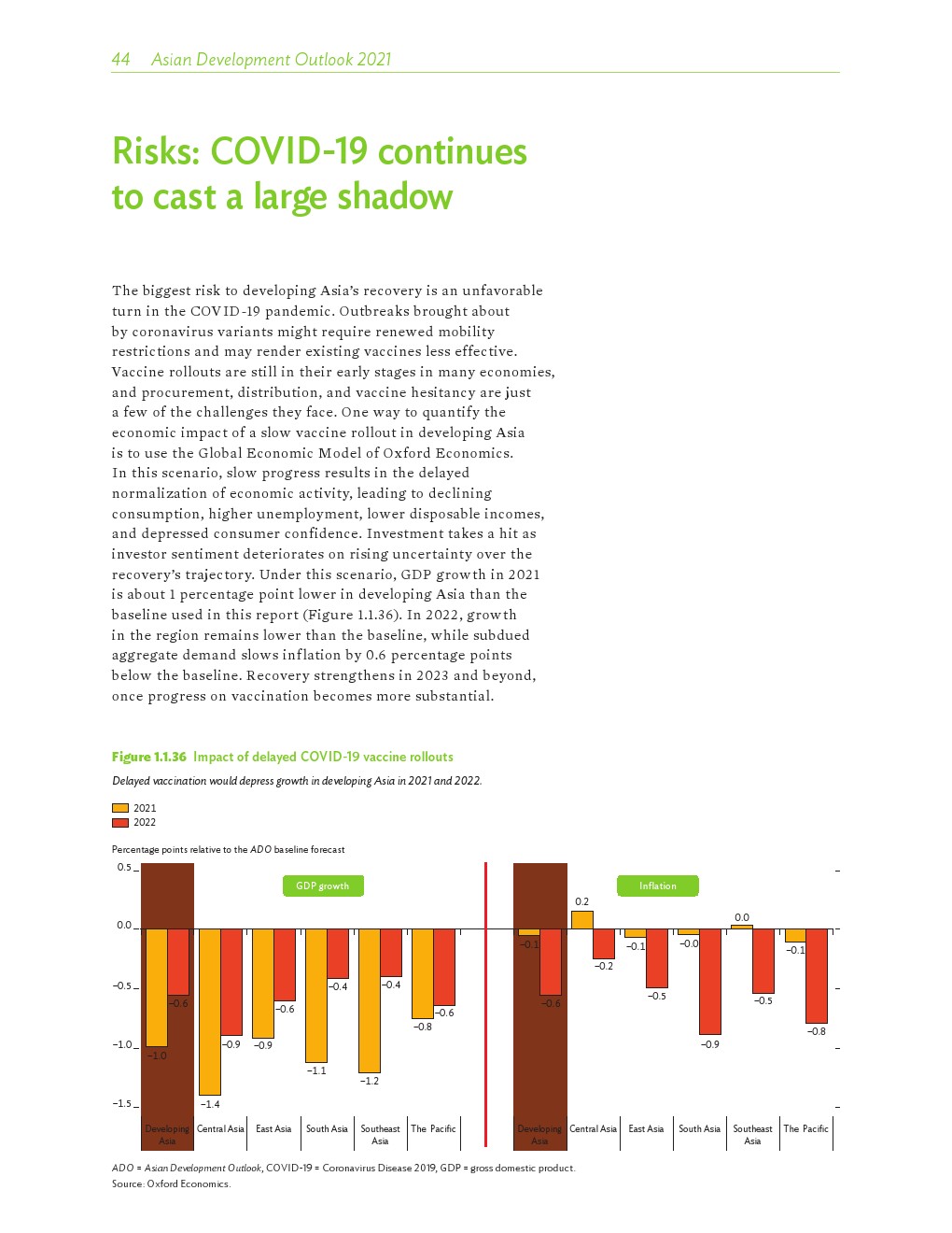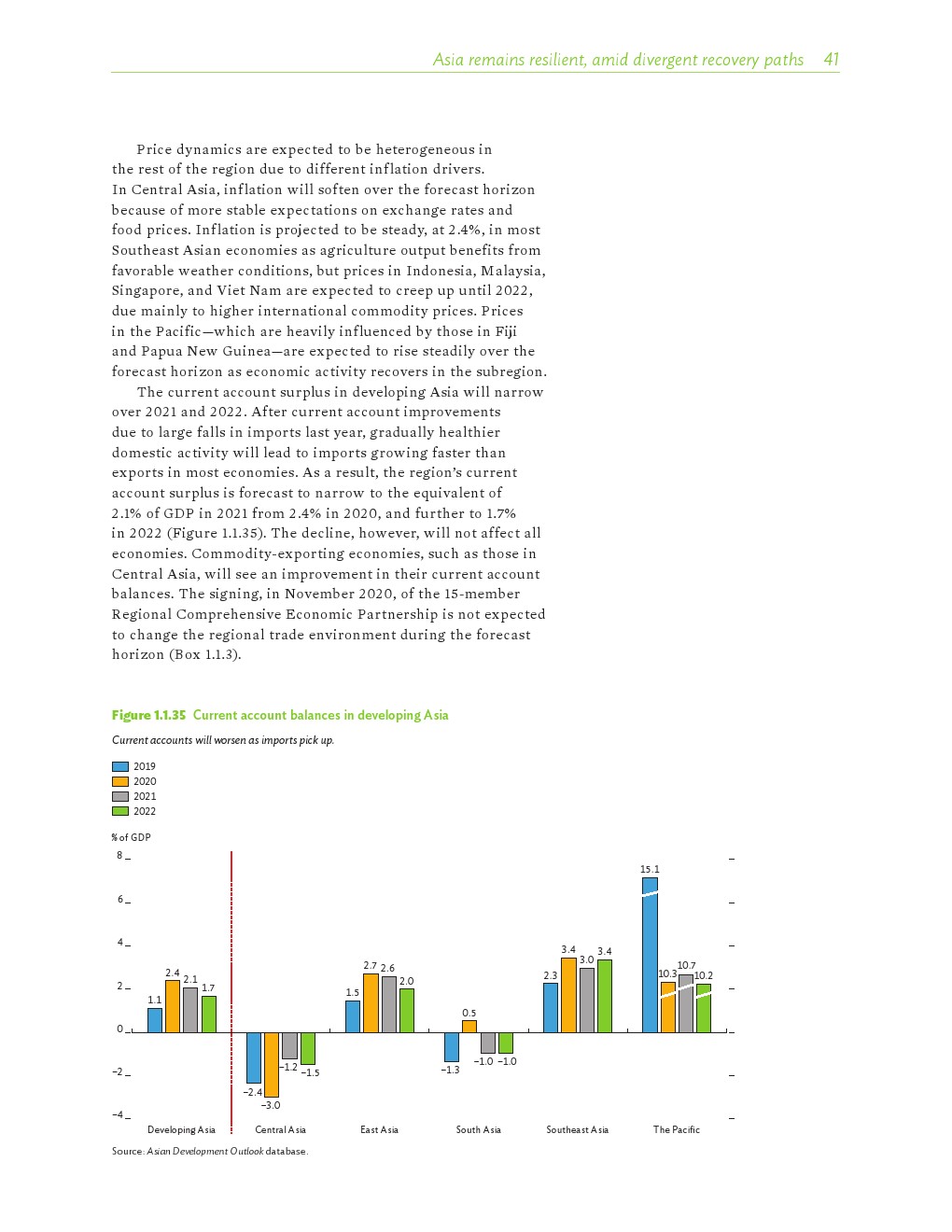亚洲发展中地区的增长势头强劲,但新冠病毒的爆发表明,这种流行病仍然是一种威胁。即便如此,在全球健康复苏和疫苗研发的支持下,该地区的经济复苏仍在进行中。预计2021年该地区经济增长将反弹至7.3%,2022年将放缓至5.3%。不包括高收入新兴工业化经济体,预计今年和明年的经济增长率分别为7.7%和5.6%。2020年小幅下降之后,由于食品价格压力的缓解,预计2021年整体通胀率将降至2.3%,2022年物价将上涨2.7%。