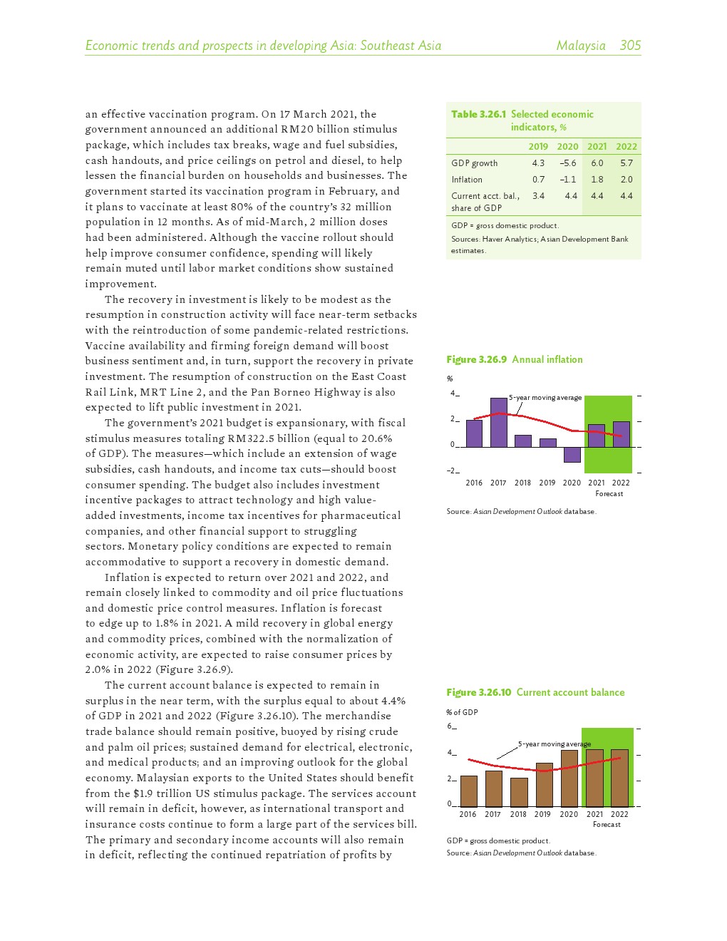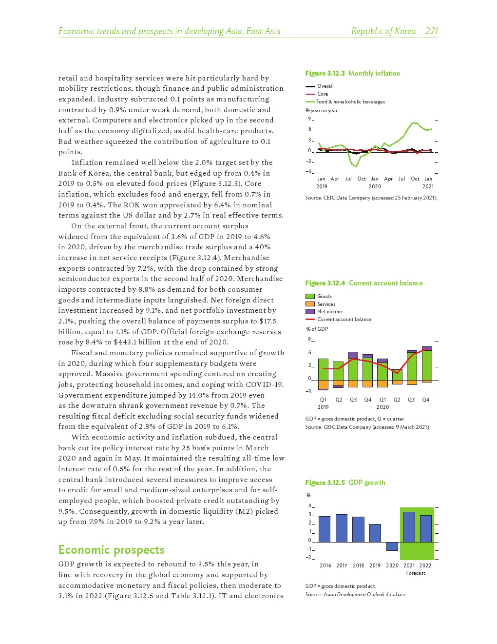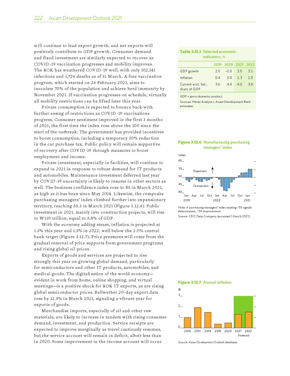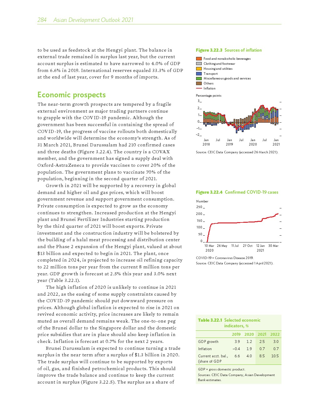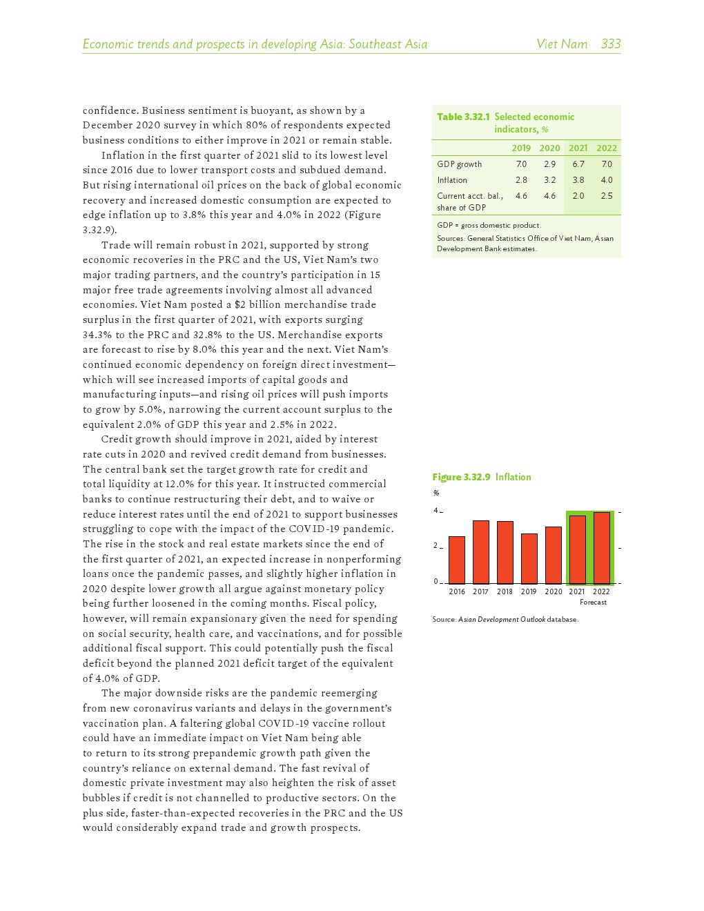 亚洲发展中地区的增长势头强劲,但新冠病毒的爆发表明,这种流行病仍然是一种威胁。即便如此,在全球健康复苏和疫苗研发的支持下,该地区的经济复苏仍在进行中。预计2021年该地区经济增长将反弹至7.3%,2022年将放缓至5.3%。不包括高收入新兴工业化经济体,预计今年和明年的经济增长率分别为7.7%和5.6%。2020年小幅下降之后,由于食品价格压力的缓解,预计2021年整体通胀率将降至2.3%,2022年物价将上涨2.7%。