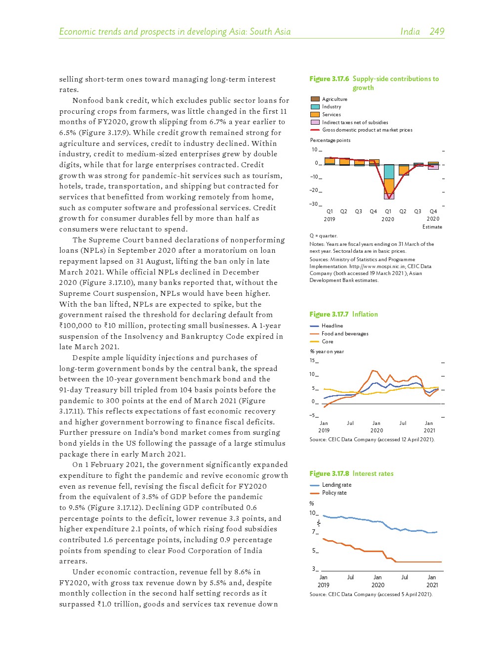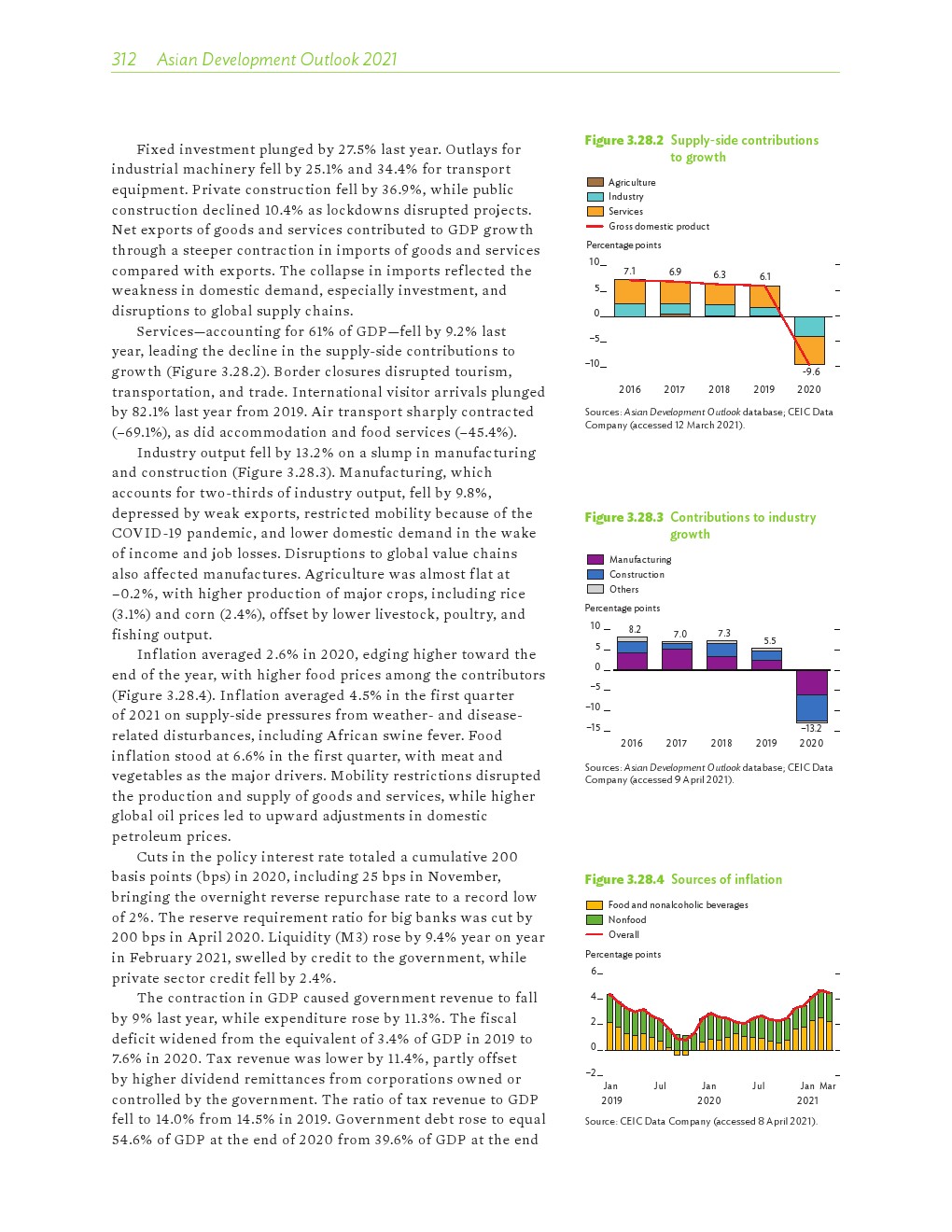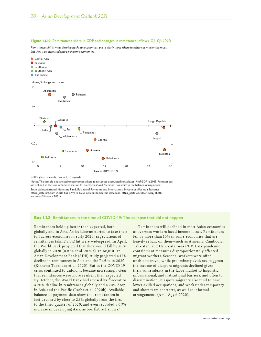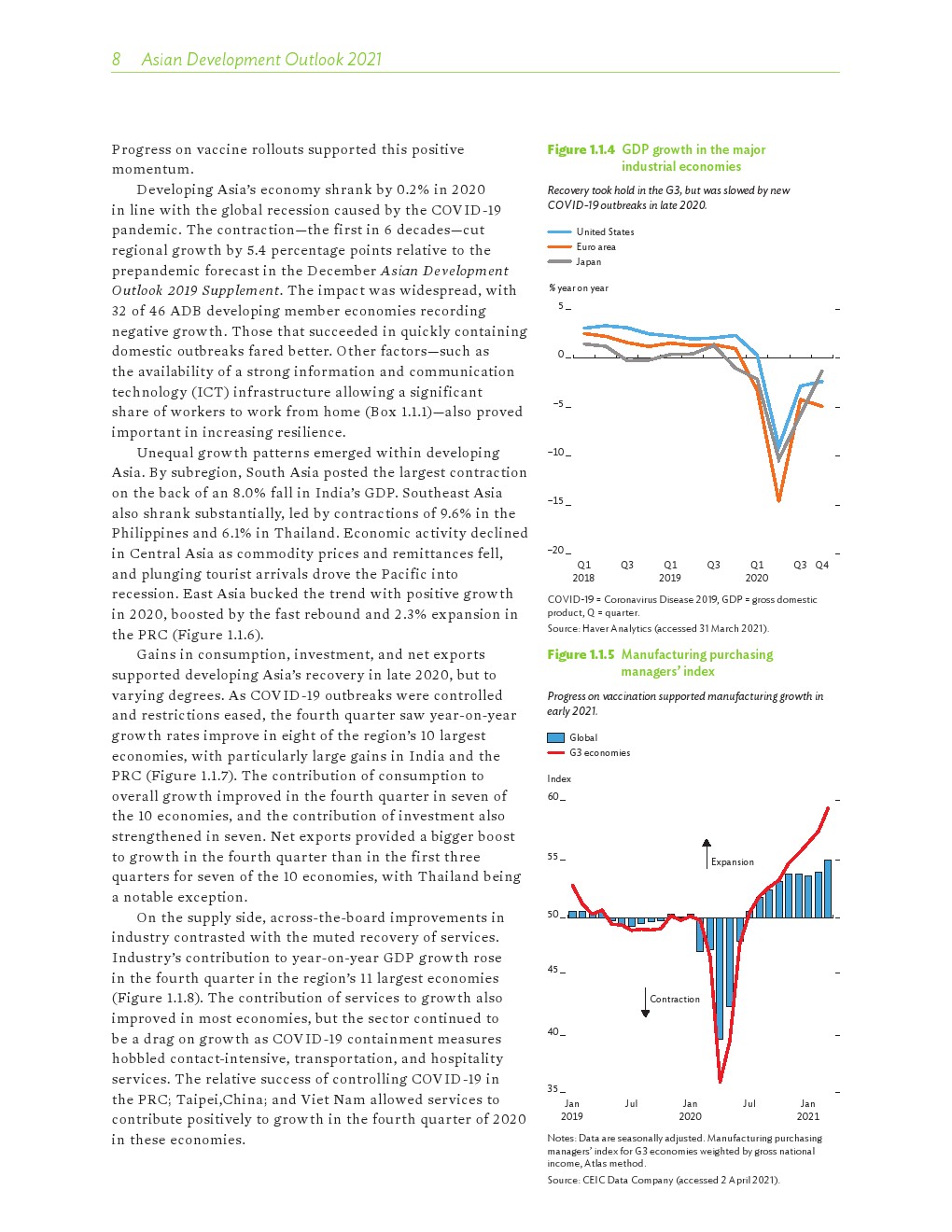 2020年发展中的亚洲经济各有不同,但总体萎缩了0.2%。在印度国内生产总值(GDP)下降8%的背景下,南亚出现了最大规模的萎缩。东南亚经济也大幅萎缩,菲律宾和泰国分别下滑了9.6%和6.1%。受中国经济快速反弹的推动,2020年东亚逆势实现正增长。