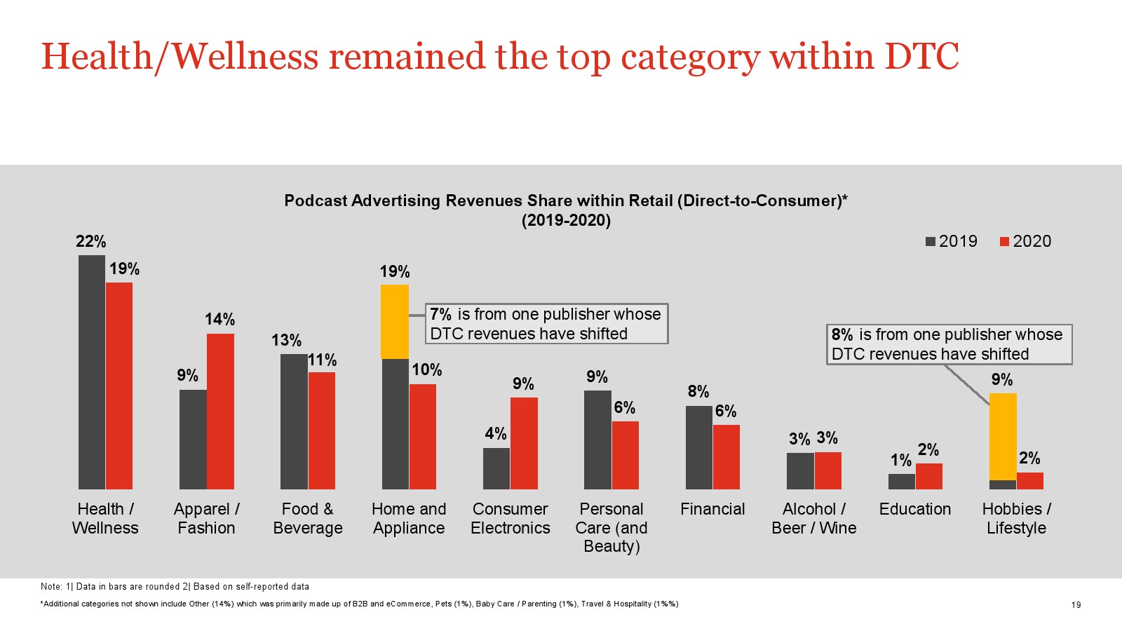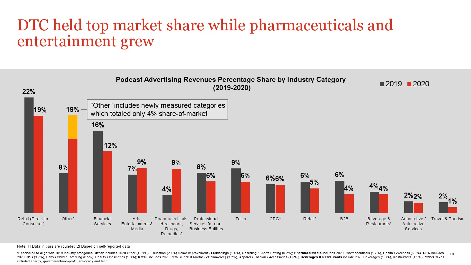 插播广告分别占现场插播广告和收入的76%。一半的播客广告持续时间超过30秒。较长的广告能提供更有创意的故事。新闻仍然是播客广告最主要的内容类型,占22%。广告主应该倾向于新闻。直接面向消费者的品牌是最大的播客广告主(19%),药品行业的播客广告份额同比增长了一倍多(9%)。