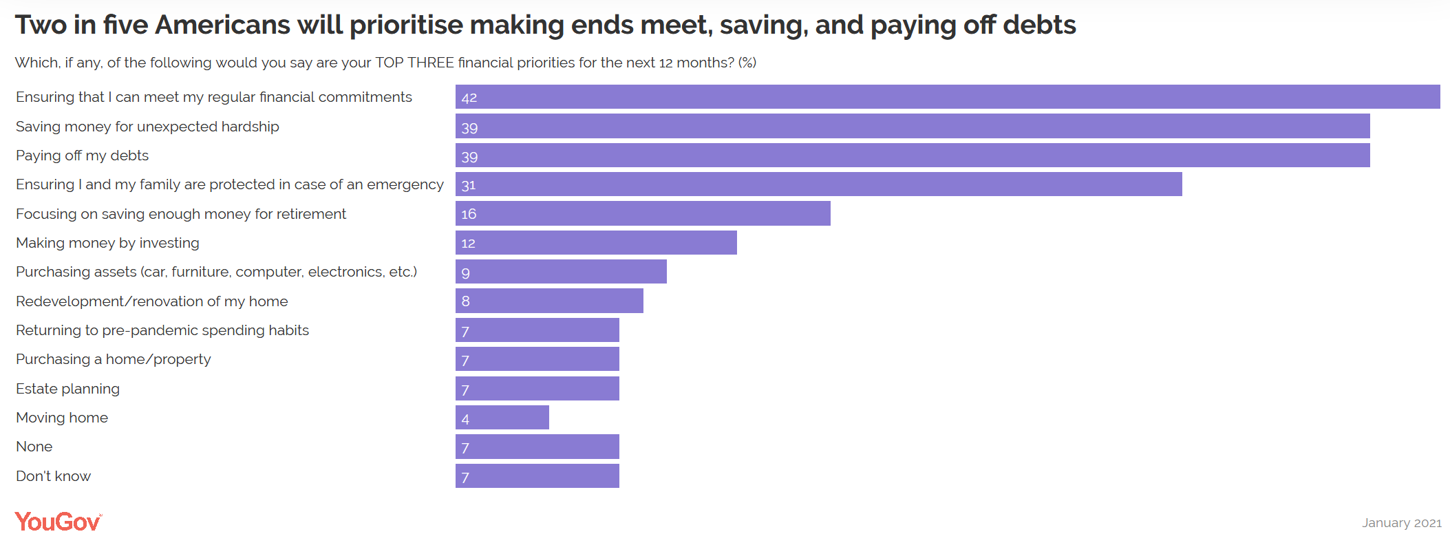 2/5的美国人计划将履行定期财政承诺作为下一年的重点(42%),其次是意外困难储蓄(39%)和偿还债务(39%)。