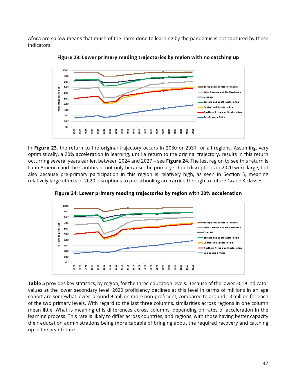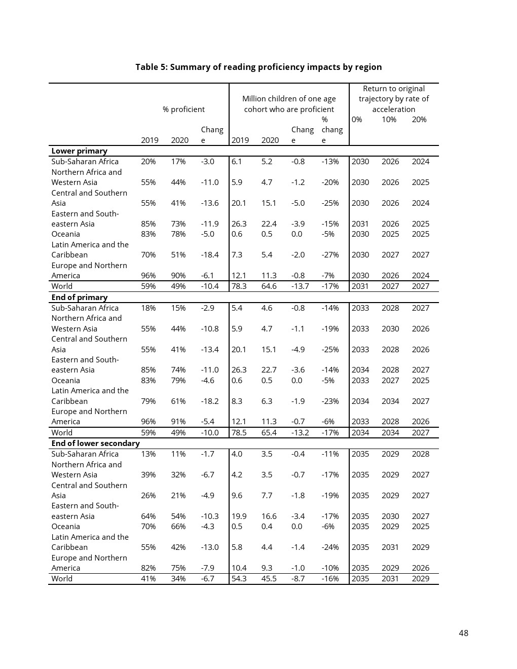 在受调查的1亿儿童中约有3400万人来自中亚和南亚国家,2900万是来自东亚和东南亚的儿童。按绝对值计算,这是这两个地区的学校教育和学习成绩受疫情影响最严重。就熟练阅读儿童的百分比变化而言,拉丁美洲和加勒比地区的下降幅度最大,从70%下降到51%。撒哈拉以南非洲熟练儿童比例下降幅度则相当小,这是因为即使在2019年精通阅读的儿童比例也很低。