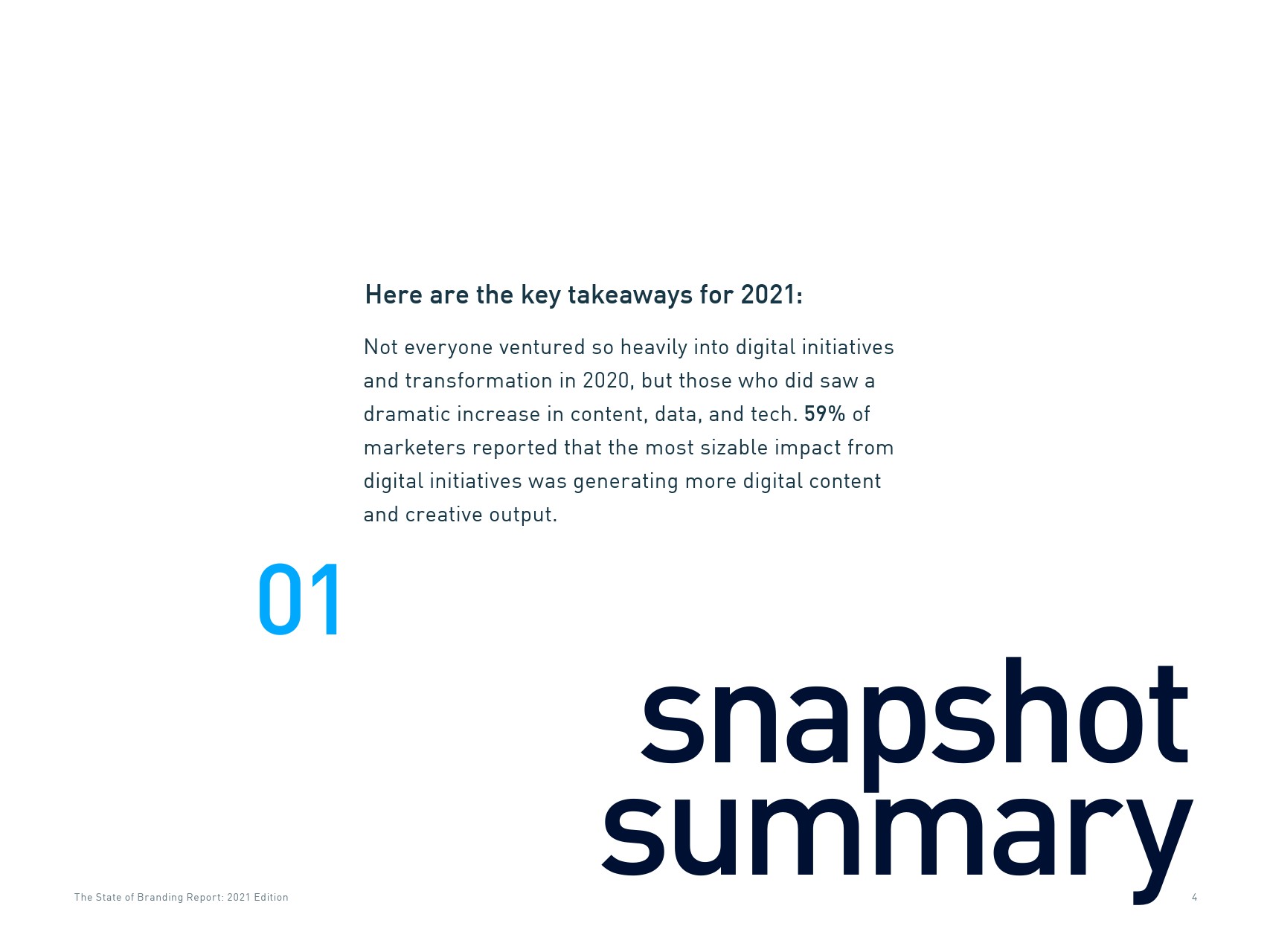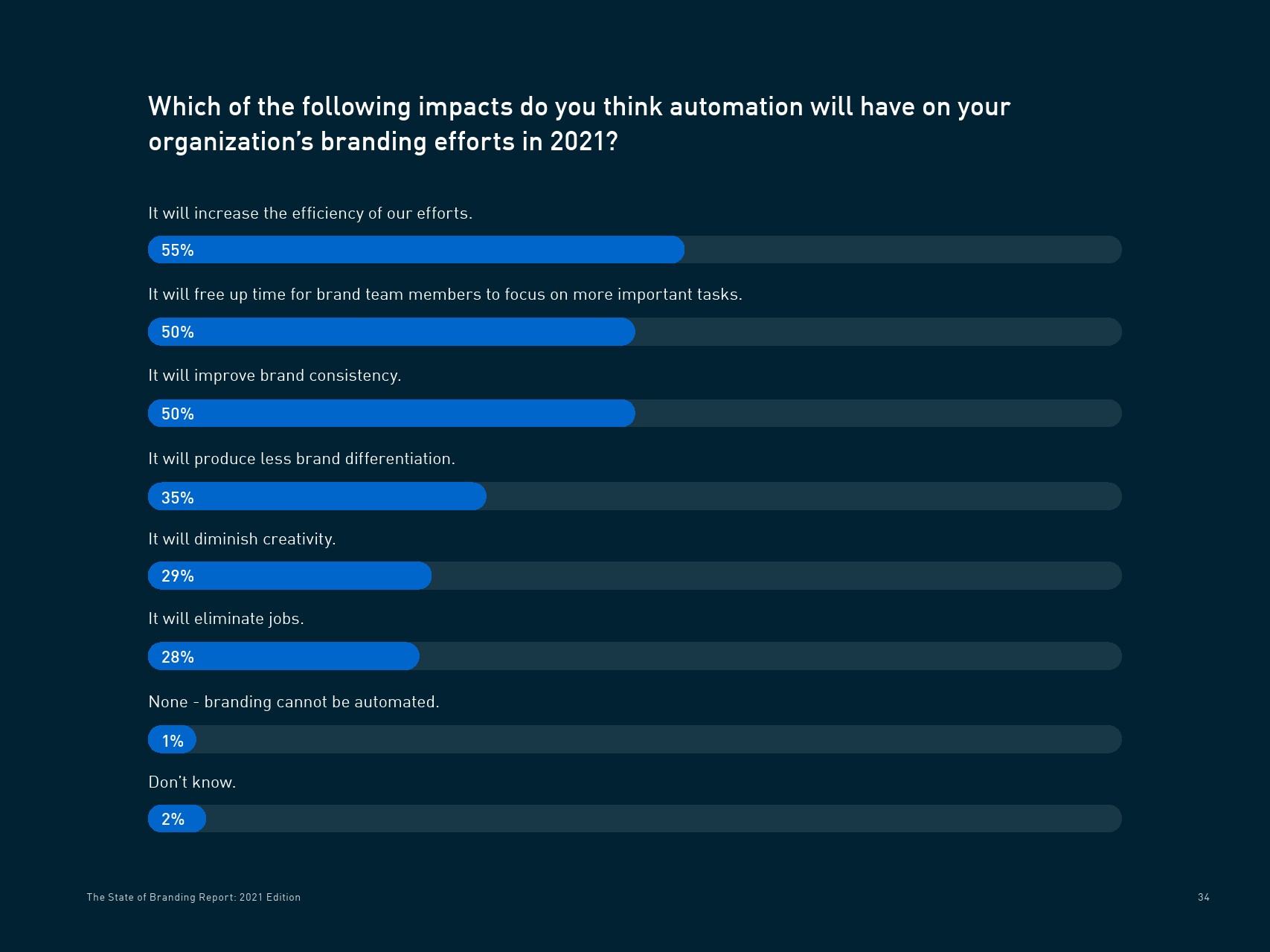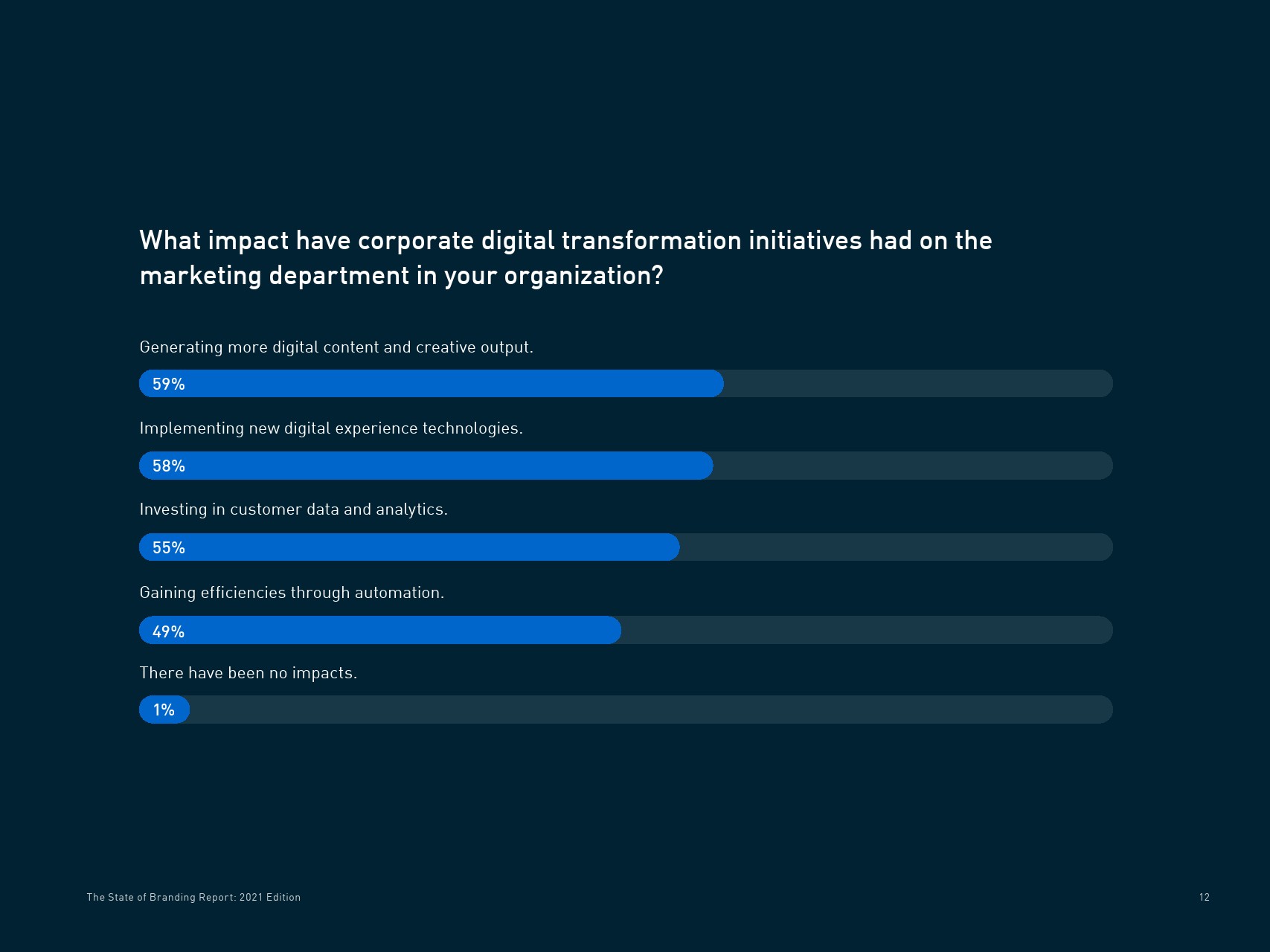 企业数字化转型举措对营销部门的影响是积极的。来自美国和欧洲的1600名营销和创意受访者表示,企业的数字转型举措产生了更多的数字内容和创意输出(59%),实施了新的数字体验技术(58%),投资客户数据和分析(55%),并通过自动化提高效率(49%)。