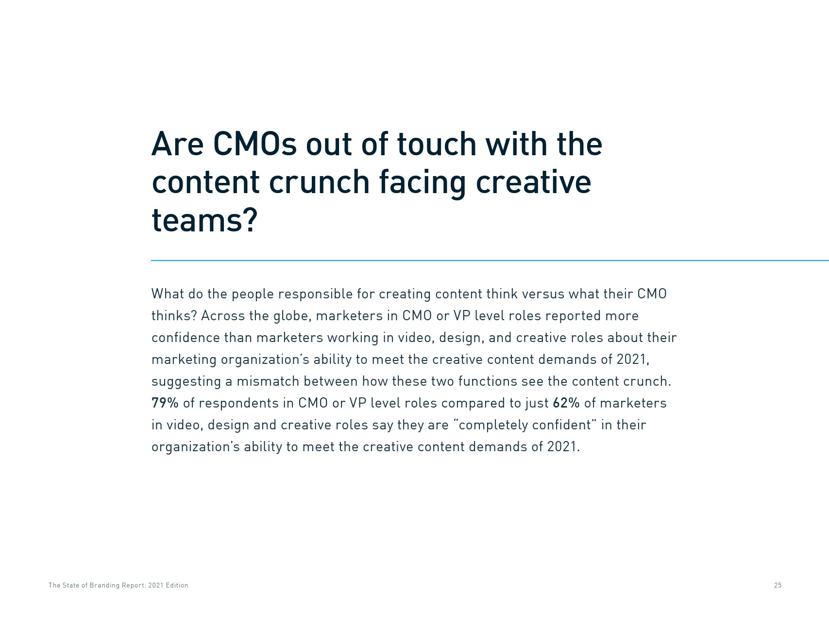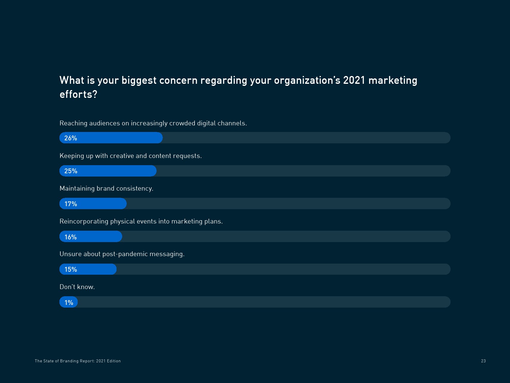受访者对2021年的营销工作有些担忧,包括通过日益拥挤的数字渠道接触受众(26%),将体育活动重新纳入营销计划(16%)。1/4的受访者最担心的是跟上创意和内容需求。