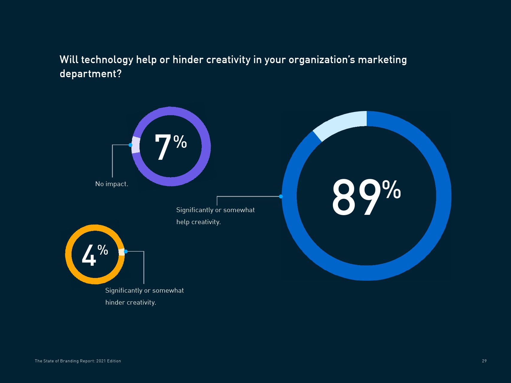 89%的受访者认为科技将大大或在一定程度上有助于提高营销部门的创造力。