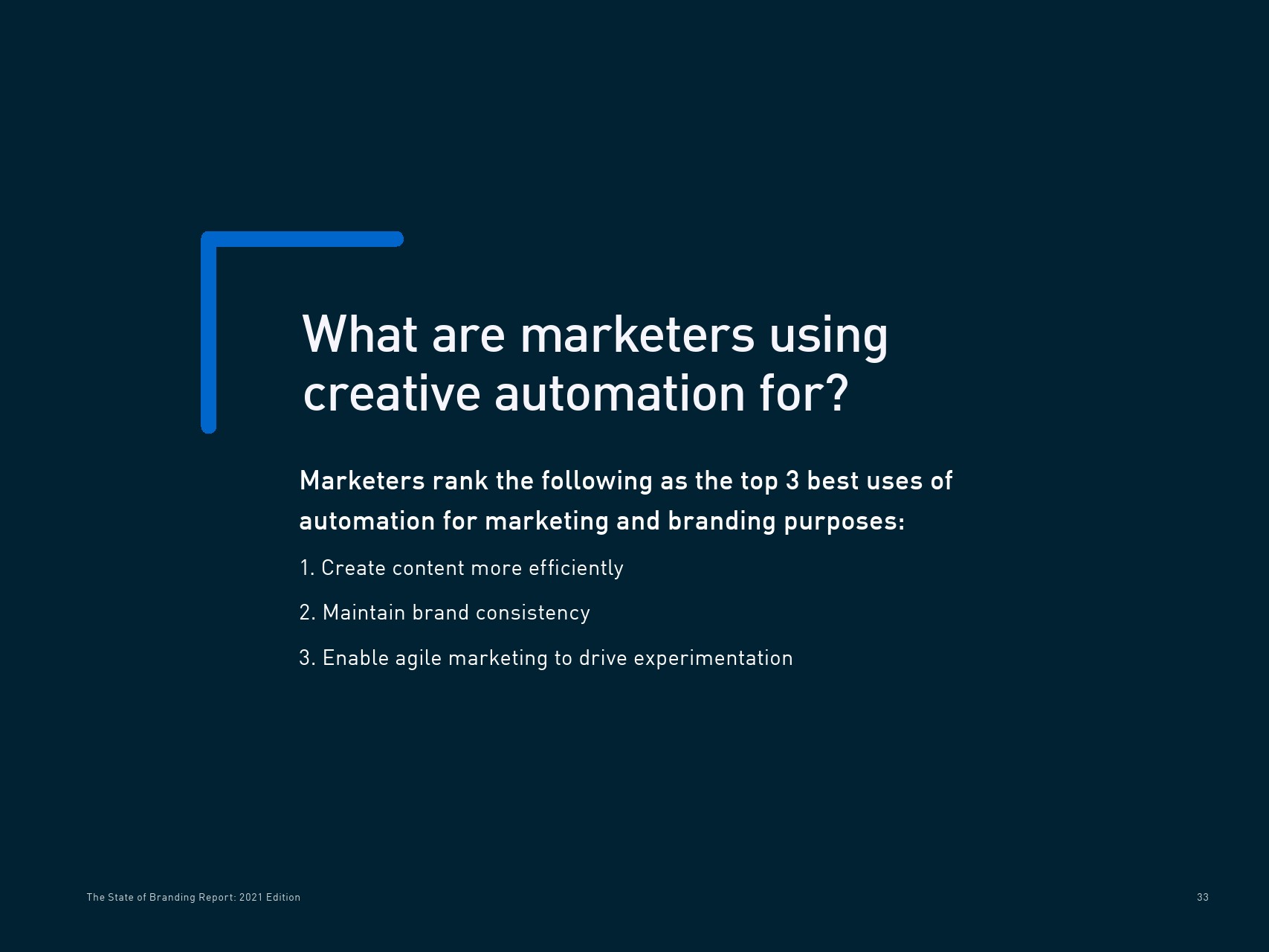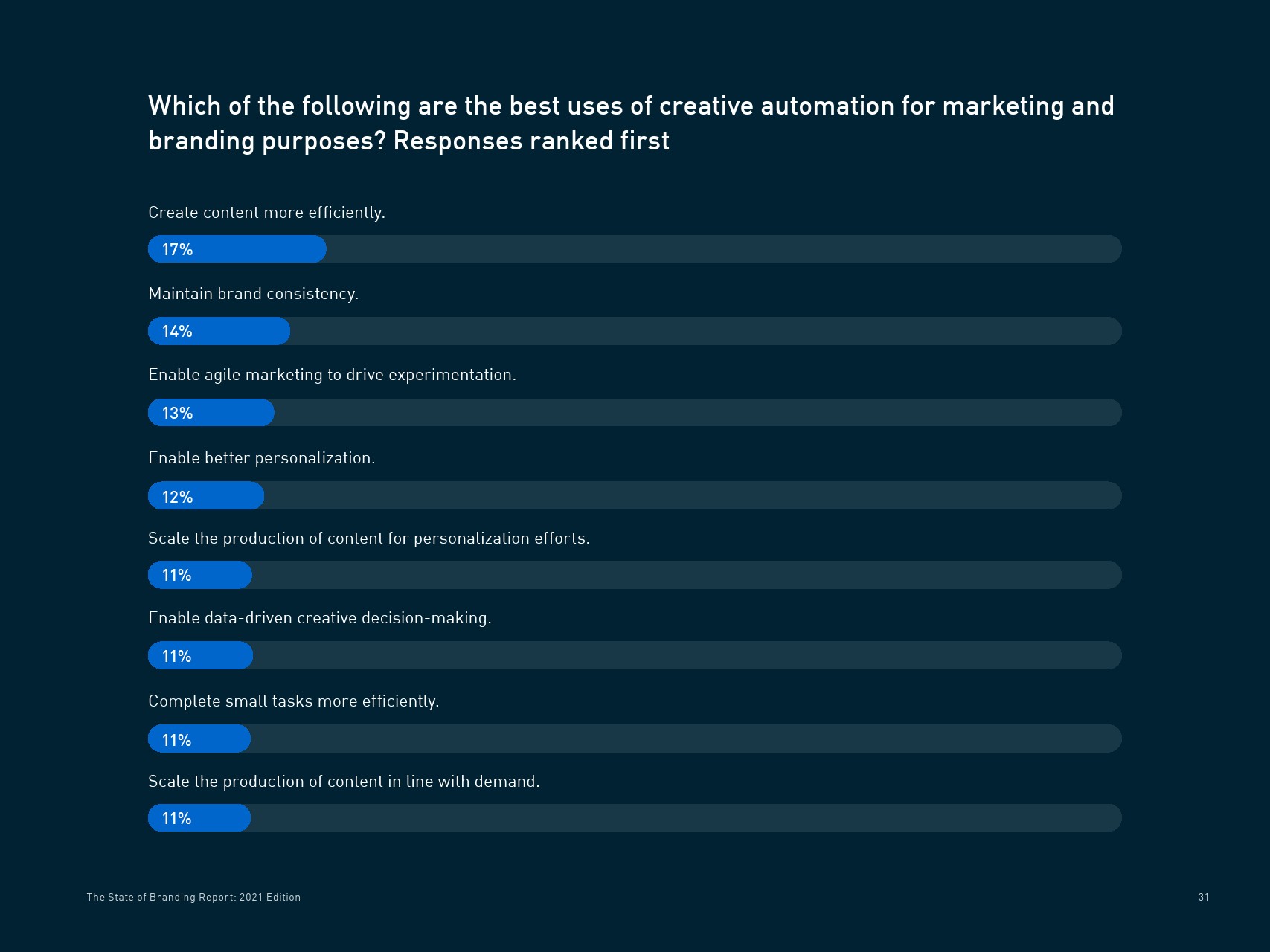 受访者列举了创意自动化的几个最佳用途,包括更高效地创建内容(17%)、保持品牌一致性(14%)、借助敏捷营销推动实验(13%)和实现更好的个性化(12%)。