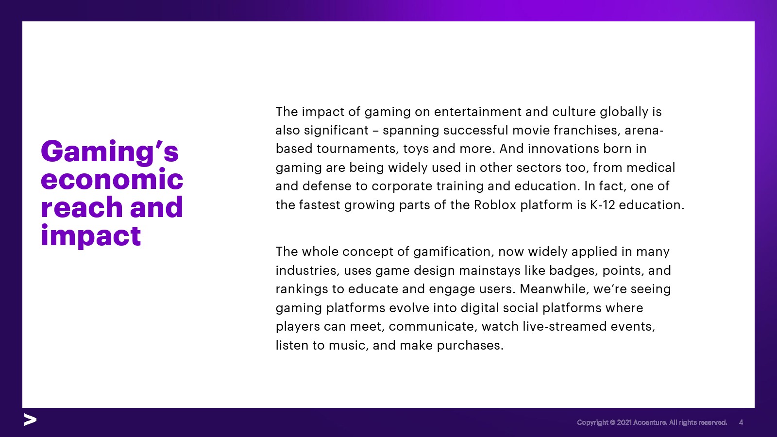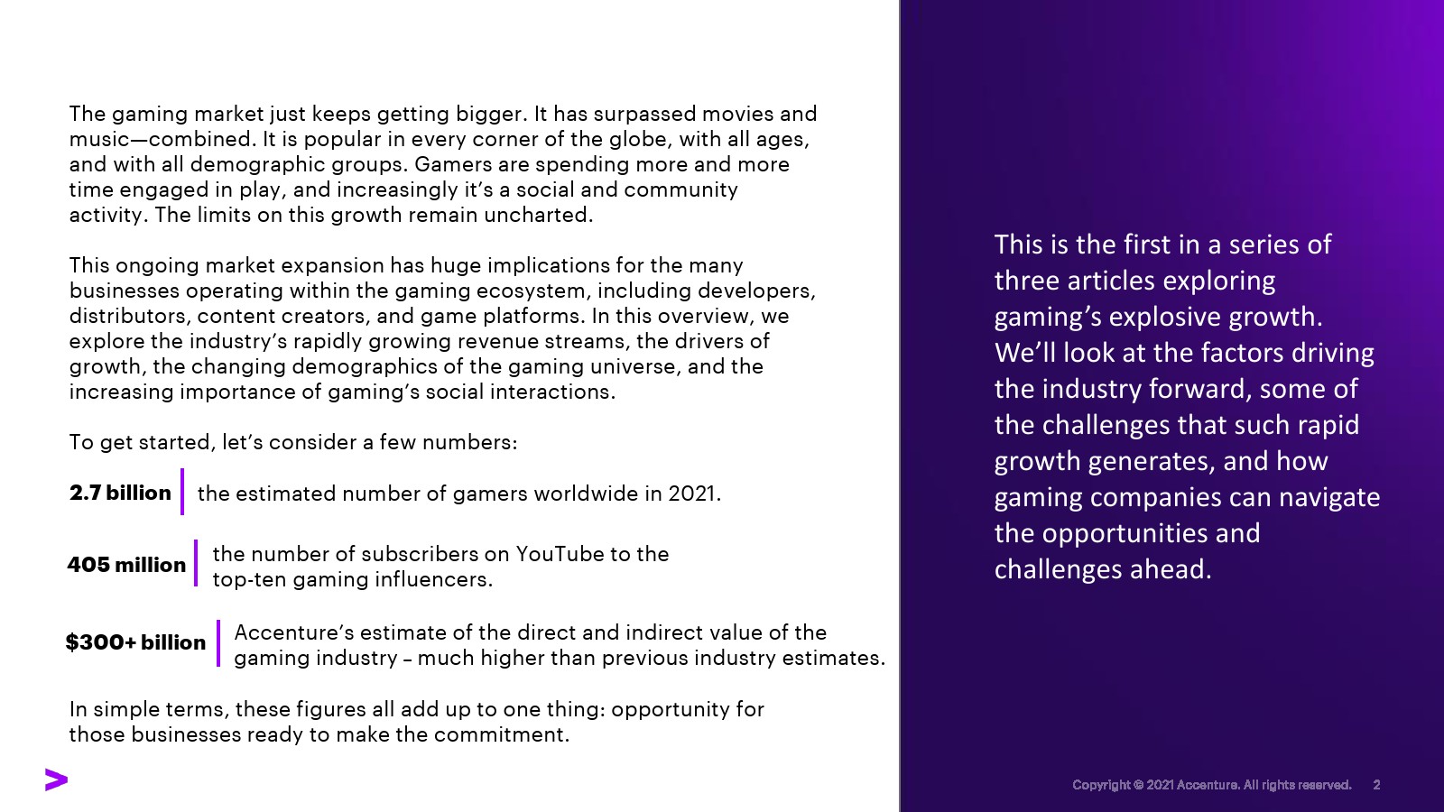 埃森哲估计,由于移动游戏的激增以及在此期间人们对社交互动的重视,游戏行业的总价值现已超过3000亿美元,超过电影和音乐市场的总和。