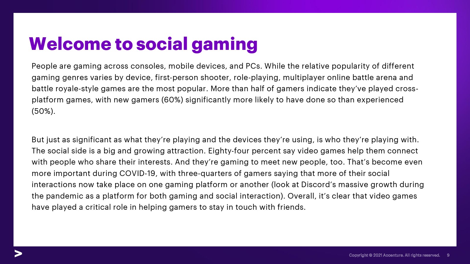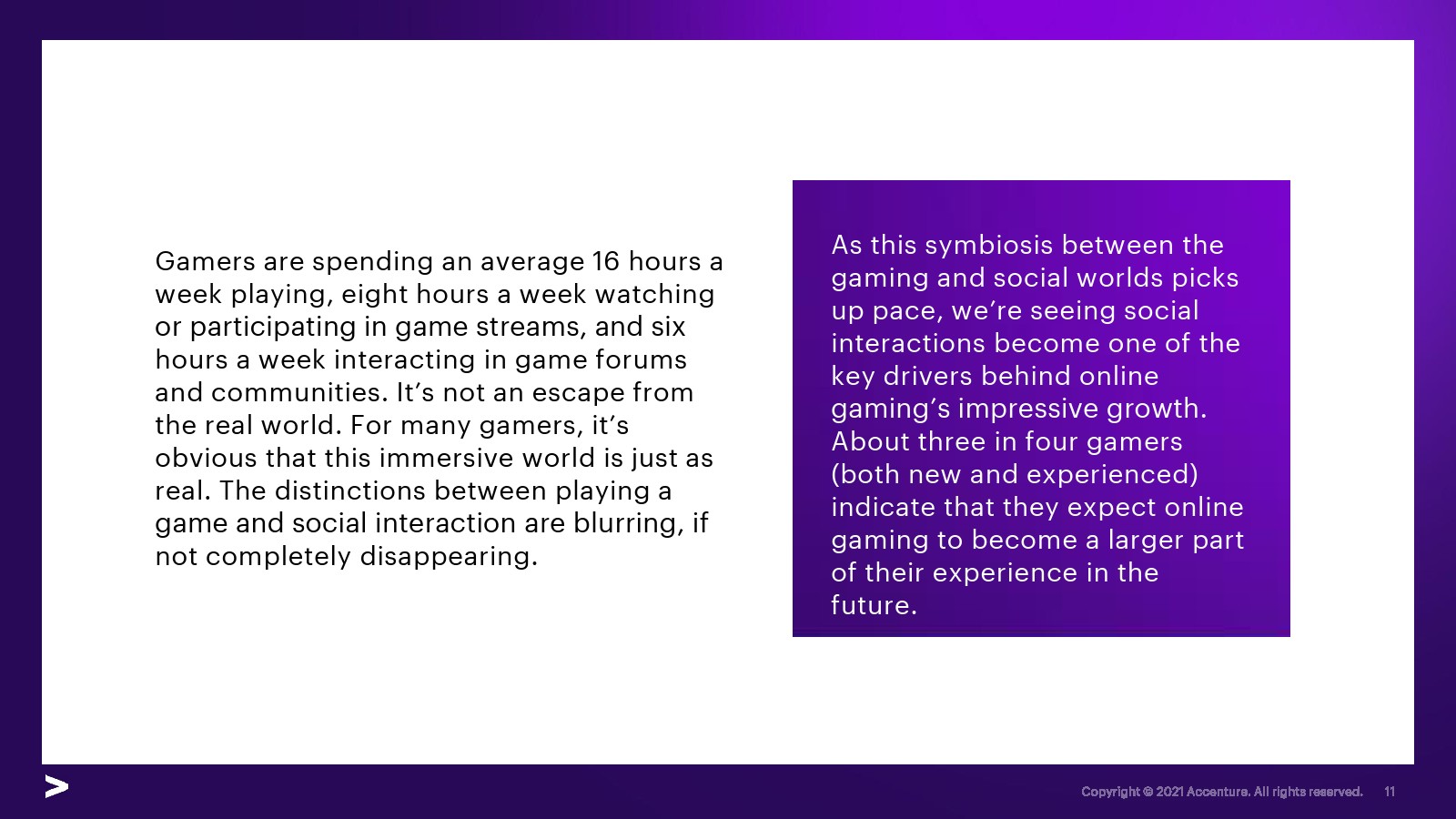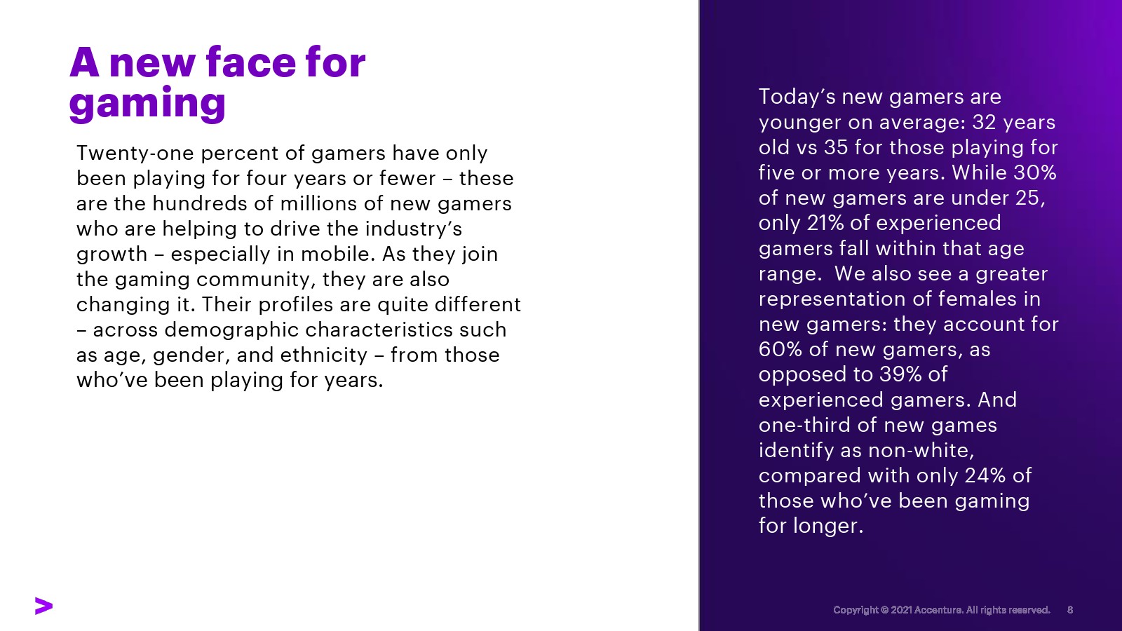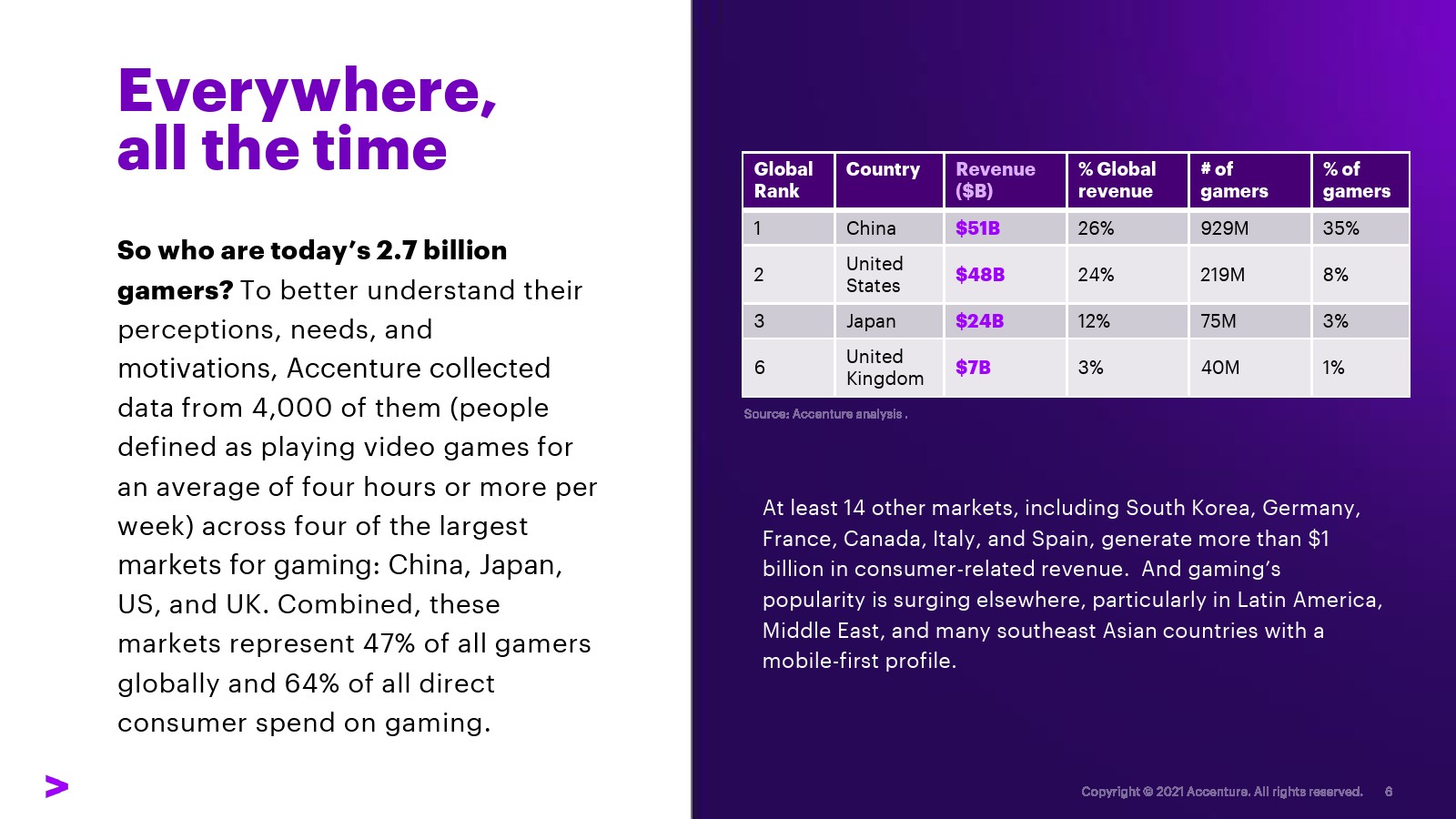 埃森哲分析了来自四个最大游戏市场(中国、日本、英国和美国)的4,000位玩家的数据,以了解玩家的需求和该行业大规模增长的动力。