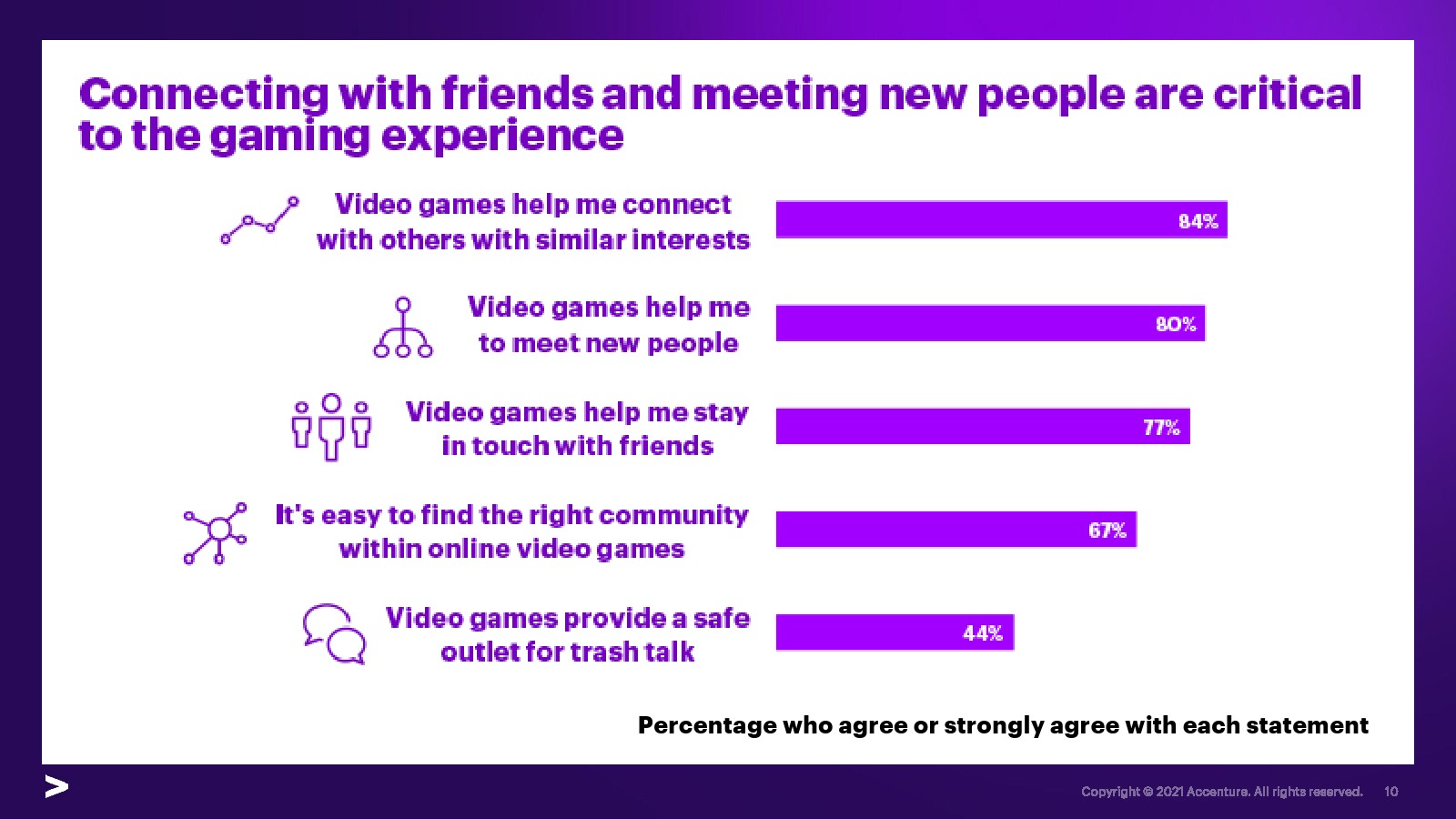 随着游戏社区的不断发展,社交已成为游戏玩家整体体验中越来越重要的方面。84%的受访者表示视频游戏可以帮助他们与兴趣相似的其他人建立联系;3/4的受访者认为,现在他们的社交互动更多发生在游戏平台上。