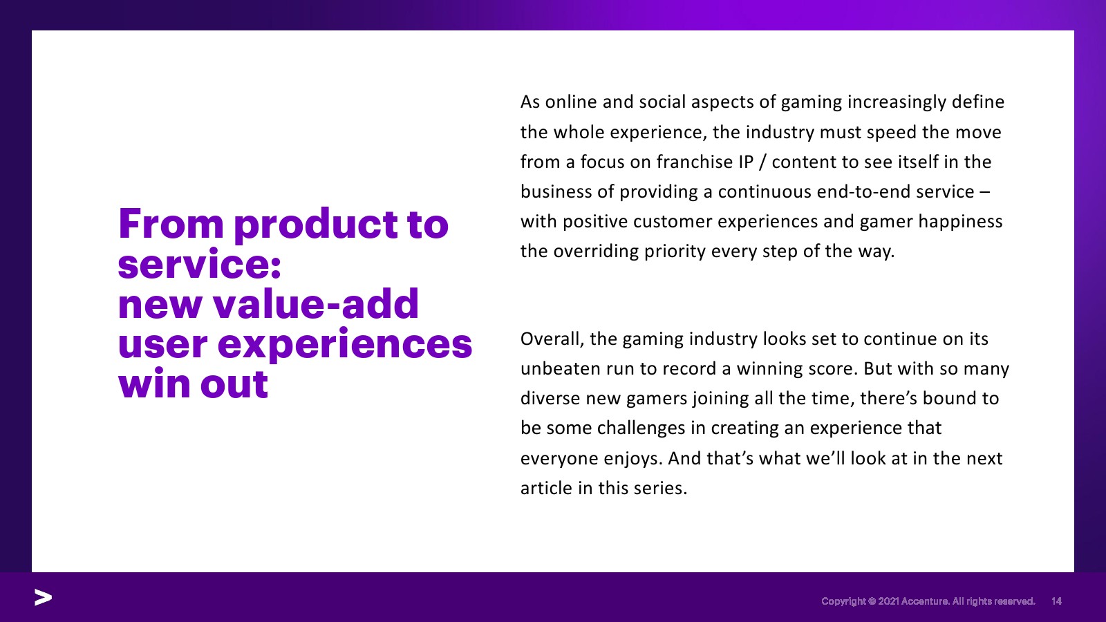 新游戏平台的出现和不断变化的人口统计特征正在推动游戏企业从以产品为中心转变为以体验为导向。该行业必须平衡新玩家的需求,他们更加关注在线互动。