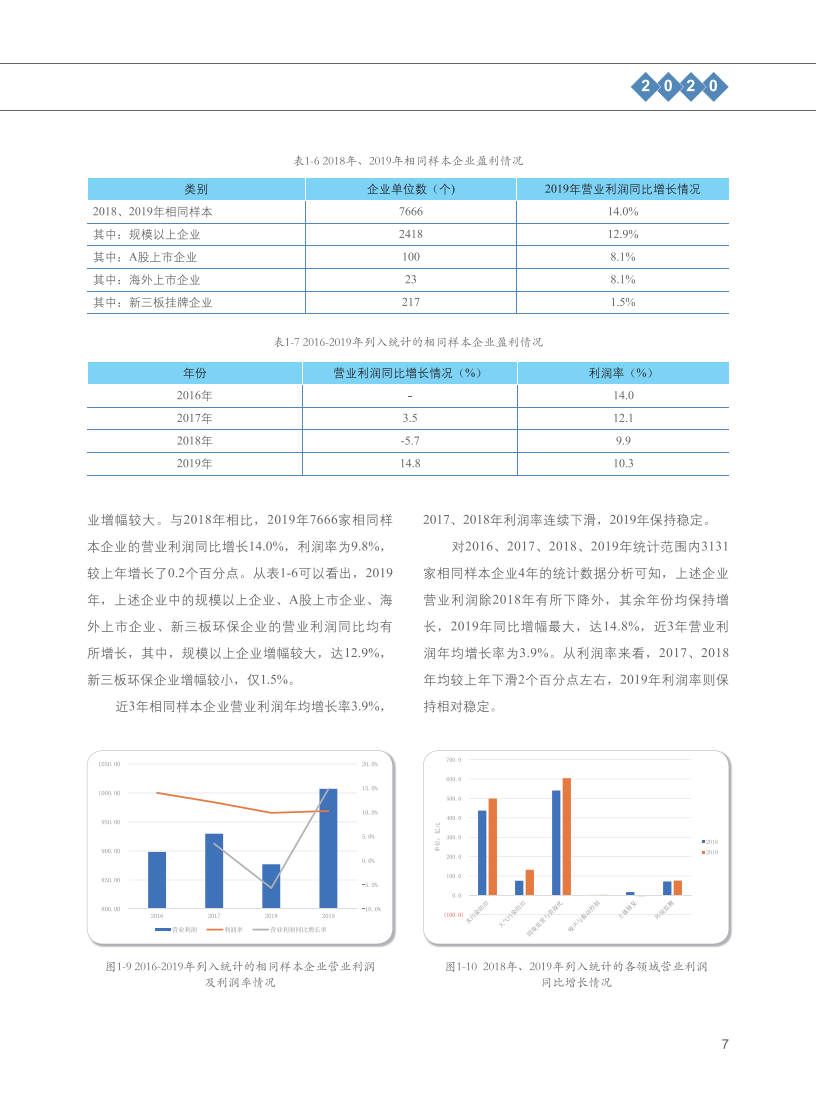 2019年,统计范围内企业环保业务营业收入9864.4亿元,同比增长了13.5%。对2016、2017、2018、2019年统计范围内相同样本企业数据进行分析可知,上述企业环保业务营业收入年均增长率在15%以上,但近三年环保业务营业收入同比增幅逐年收窄;营业利润年均增长率3.9%,2017、2018年利润率连续下滑,2019年保持稳定。具体到细分领域,与2018年相比,除土壤修复外,水污染防治、大气污染防治、固废处置与资源化、环境监测领域企业的环保业务营业收入、营业利润均有不同程度的增长。