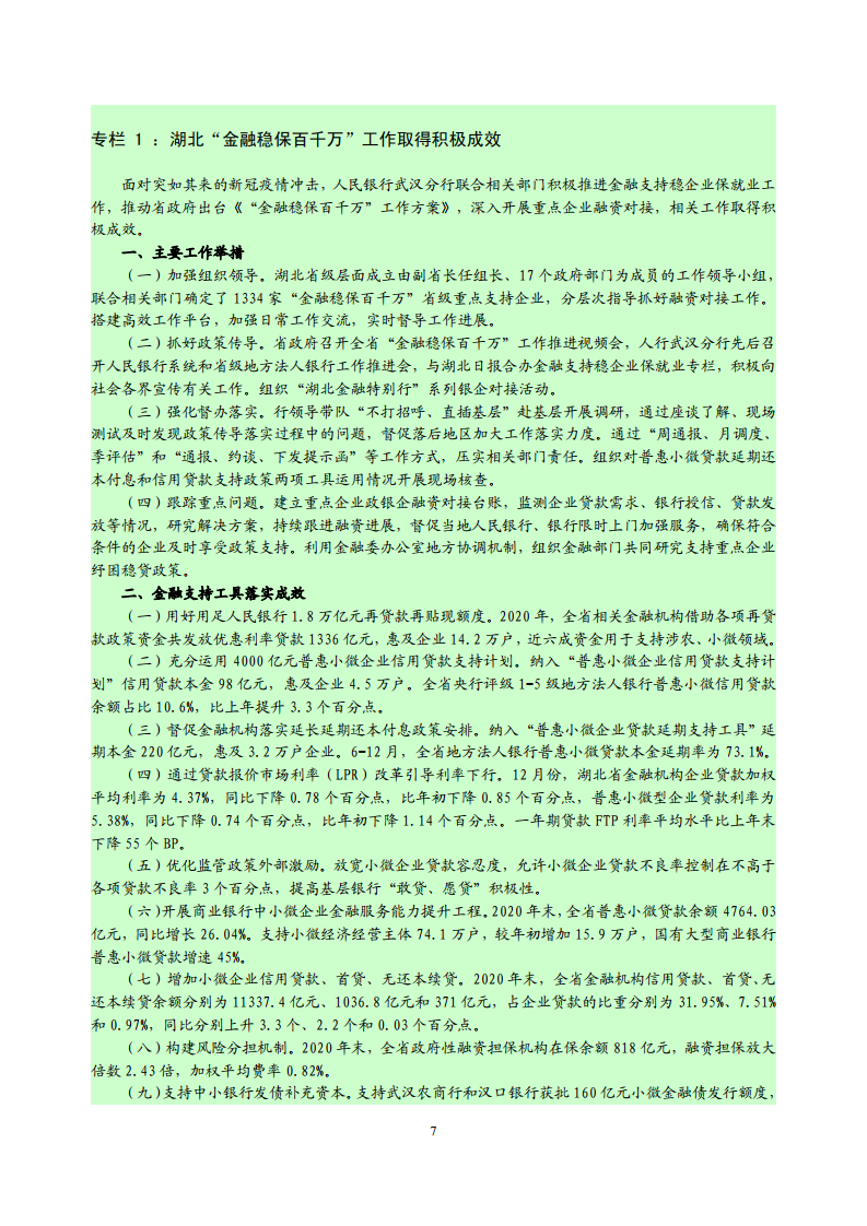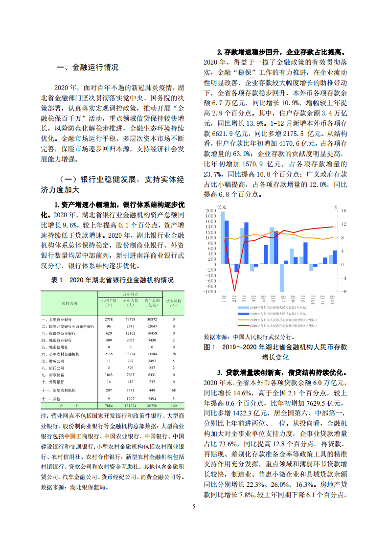 2021 年,湖北省 金融系统将按照中央经济工作会议精神,认真贯彻落实稳健的货币政策,灵活精 准、合理适度,稳字当头,努力服务创新驱动、绿色发展和乡村振兴等重大战略, 持续加大对小微企业、高技术制造业、县域金融、科技金融、绿色金融等重点领 域和薄弱环节的支持力度,为促进湖北经济快速复苏及高质量发展营造良好的货 币金融环境。