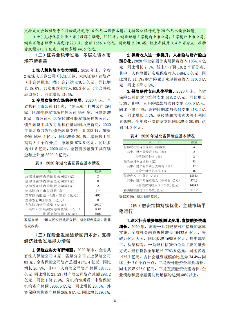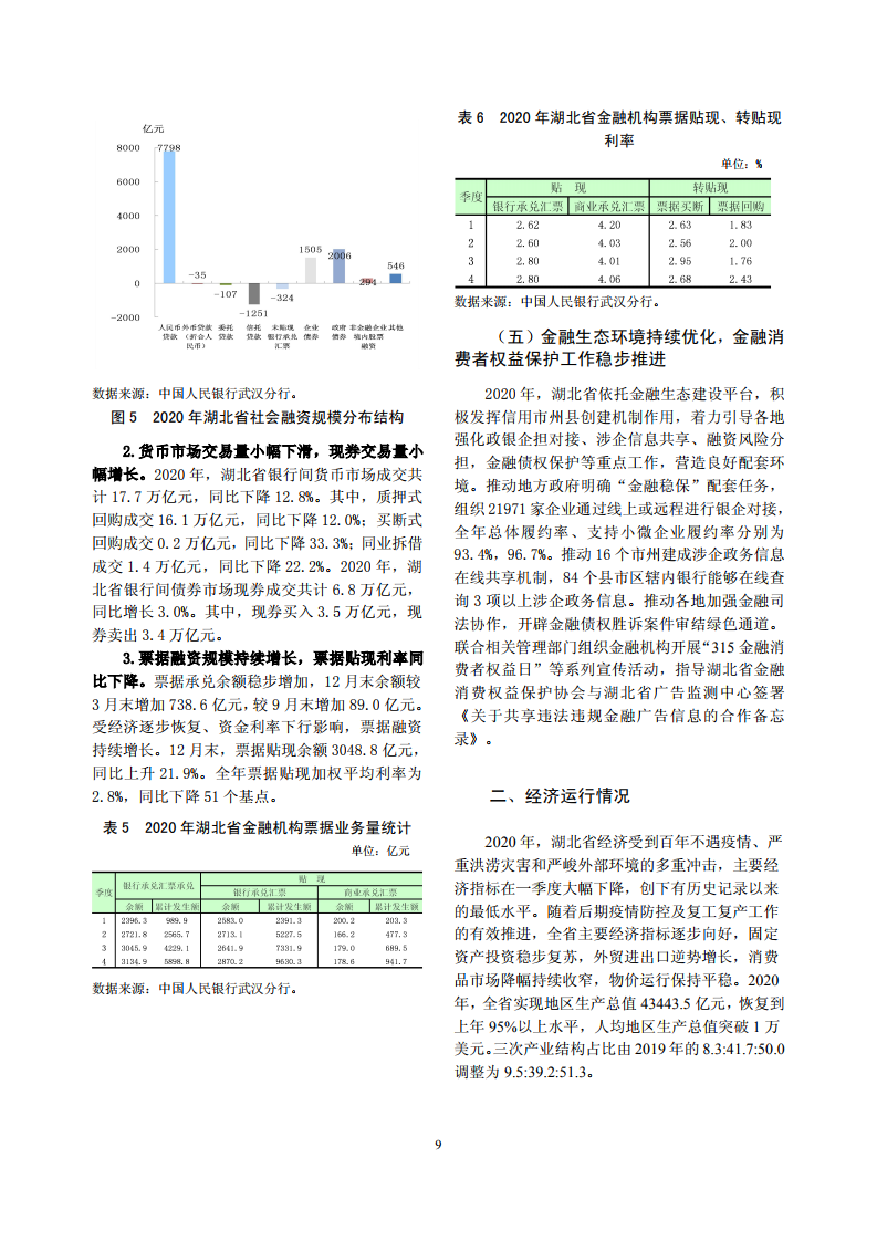 2020 年,全省社融规模增长 10432.6 亿元,突破万亿 元大关,同比多增 1698.6 亿元,居中部第三。债务融资工具发行量和存量均创 历史新高,债务融资支持工具发行 223 只,融资金额 1686.4 亿元,同比增长 20.4%,增速较上年提高 3.4 个百分点,净融资规模 673.8 亿元,同比多增 44.5 亿元。2020 年末,全省债务融资工具存续金额上升至 3529.3 亿元。四是金融生 态环境持续优化,金融消费者权益保护工作稳步推进。