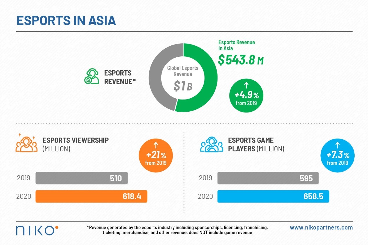 尽管面临新冠的挑战,但亚洲电子竞技在2020年创造了5.438亿美元的收入,比2019年增长了4.9%,并且在2021年表现强劲。这不包括游戏产生的收入,但包括电子竞技行业的收入。2021年该地区的电子竞技继续增长,今年亚洲的收入可能接近或超过6亿美元,除非出现任何重大中断。即相当于比2020年增长10.5%。亚洲占全球近10亿美元电子竞技市场的54%以上。2022年亚洲电子竞技观众人数激增,将达到 6.184亿人。这比2019年亚洲电子竞技观众(5.1 亿)增长了 21%。随着全球收视率的持续上升,预计许可和合作伙伴将成为电子竞技生态系统中增长最快的部分。