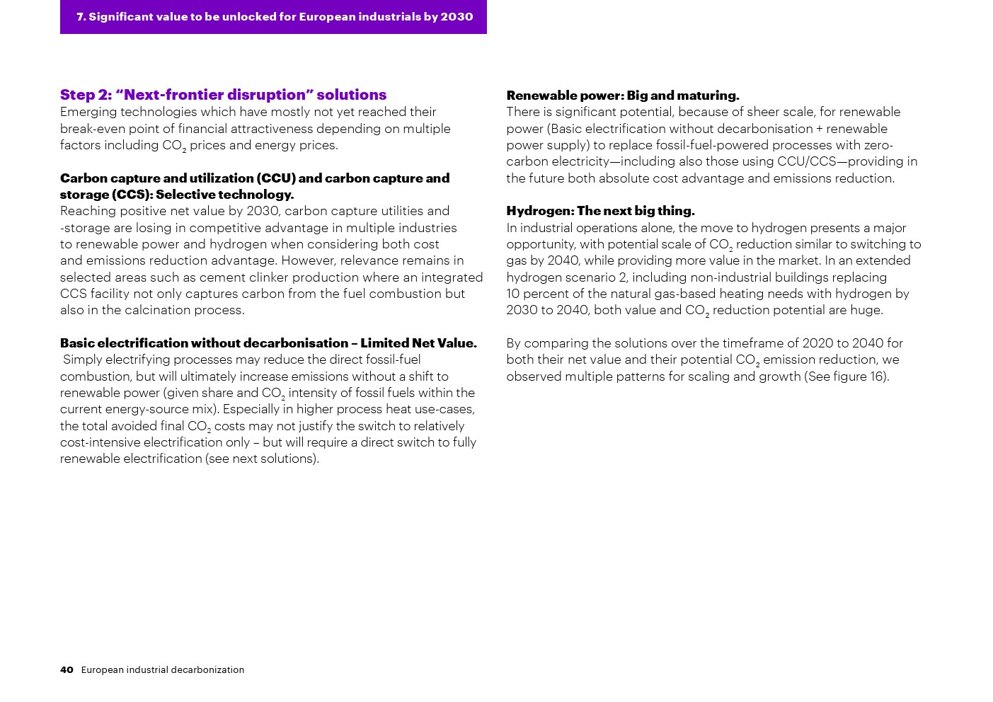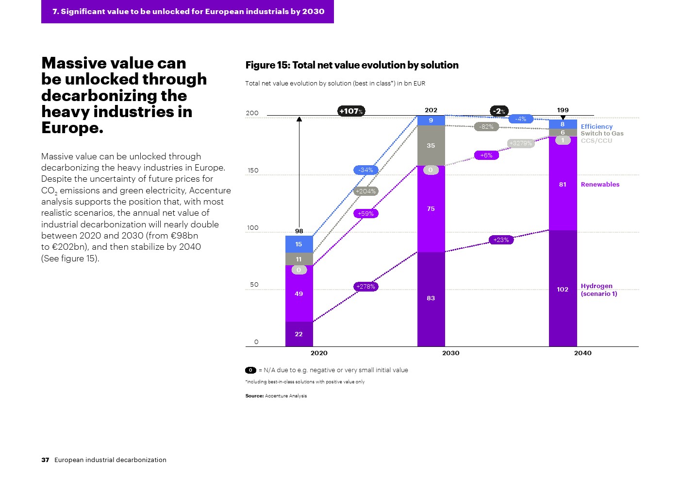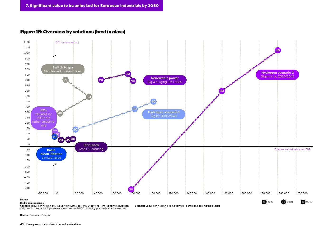 尽管未来二氧化碳排放量和绿色电力价格仍不确定,但研究预测,2020年至2030年工业脱碳的年净价值将翻一番以上,从每年大约1000亿欧元增加到2000多亿欧元。埃森哲对现有和新兴技术的分析表明,这一数字将在2030年至2040年间稳定下来。
