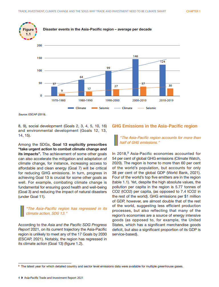 按绝对值计算,亚太地区现在是最大的温室气体排放地。然而,《2021年亚太贸易和投资报告》显示,该地区所有经济体都有很大的空间使贸易和投资环境更加适应气候变化。