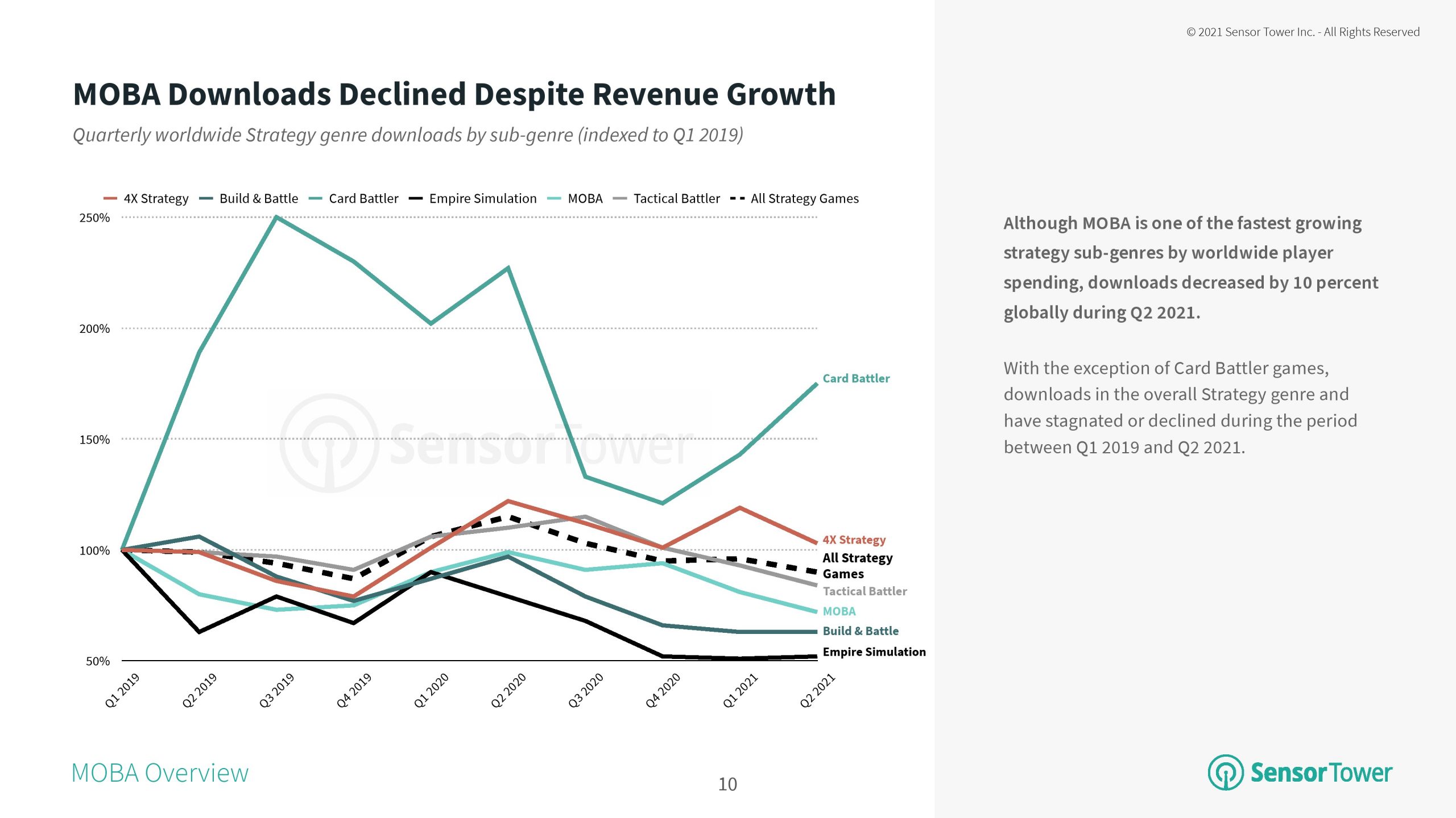 与其他手机游戏市场一样,全球新冠病毒大流行和封锁引发了全球MOBA玩家支出的激增,2020年平均月收入同比增长43%。在《王者荣耀》的推动下,该子类型的收入持续增长,到2021年为止平均月收入增长了14%,达到每月3亿多美元。