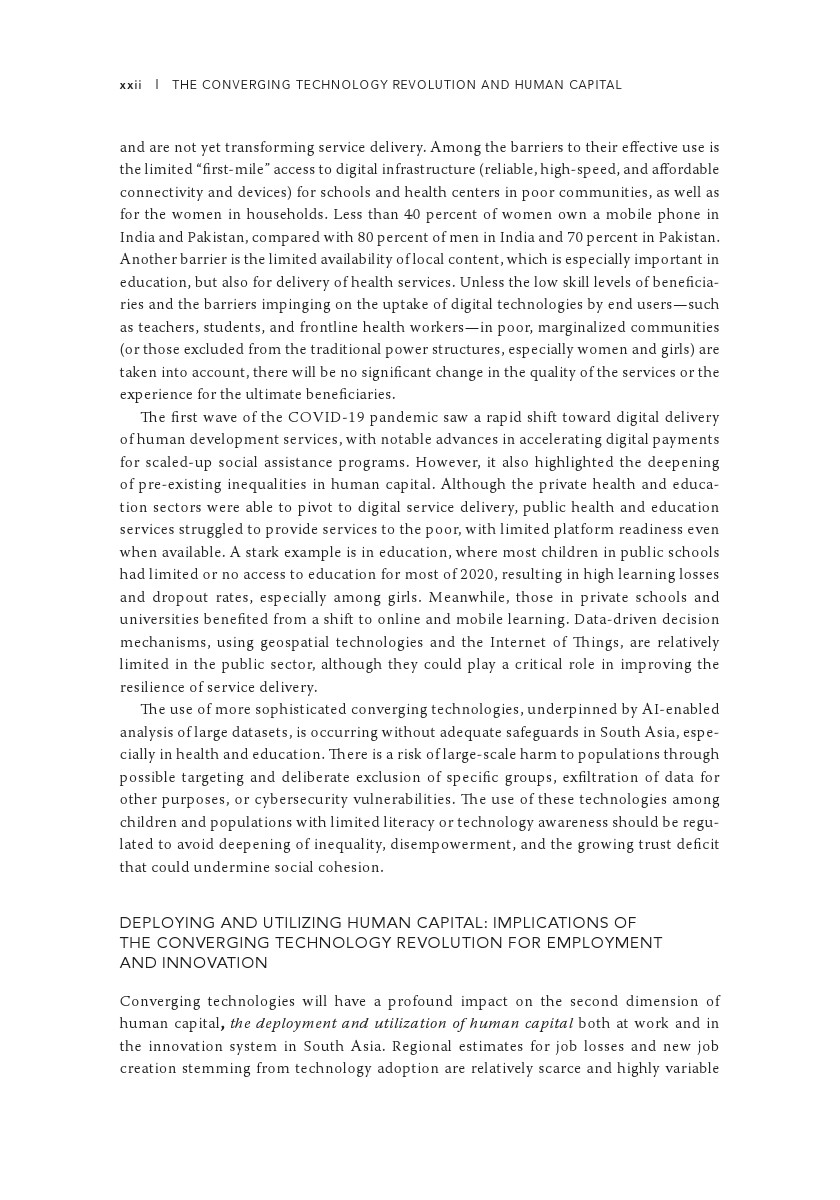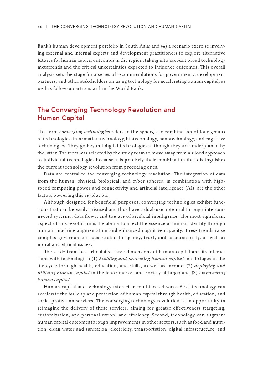 此外,在新冠大流行之前席卷全世界的深刻融合技术革命正在改变技术与人力资本之间的关系,并通过创造大量新机会来加速人力资本成果,同时产生新的、巨大的风险,使之更加复杂。这场融合革命的特点是虚拟、物理、生物和认知技术与大数据、机器学习和人工智能(AI)的力量相结合。
