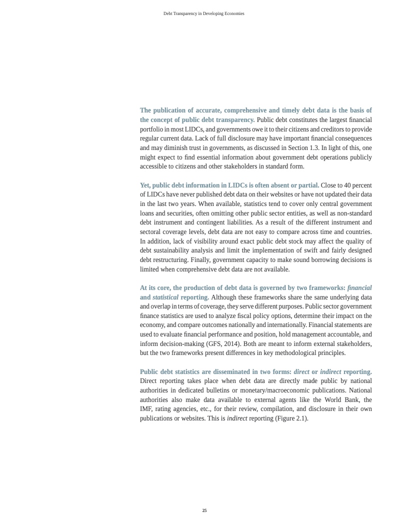 世界银行集团长期以来一直认为,债务透明度是各国发展进程中的一个关键步骤,因为债务透明度有助于吸引新投资、改善问责制和减少腐败。世界银行的全面债务报告系统仍然是低收入和中等收入国家外债可核查信息的唯一来源。所有世界银行借款国(超过100个)必须报告任何公共机构所欠外债的详细情况。此外,世界银行的可持续发展金融政策(SDFP)鼓励有资格获得国际开发协会(IDA)贷款的国家实施具体的绩效和政策行动(PPA),以提高债务透明度、金融可持续性和债务管理水平。