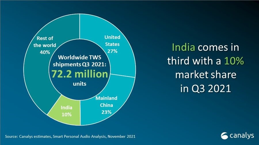 TWS(真无线立体声)细分市场是印度的主要动力,增长92%,达到 730万台。Canalys 研究分析师 Ashweej Aithal 表示:“印度已经达到了一个新的里程碑,该国以10%的市场份额巩固了其作为第三大 TWS市场的地位。强劲的表现得益于本土品牌,如 boAt、Noise 和 Boult,以及智能手机厂商,如 Realme,后者TWS出货量迅速增长。”