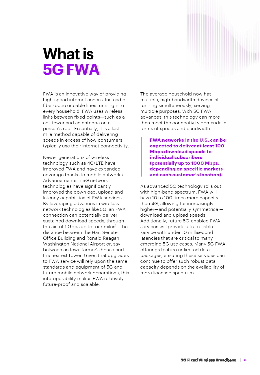 这份题为《5G固定无线宽带:帮助缩小美国农村地区的数字鸿沟》的报告讨论了5G固定无线接入服务如何快速、经济高效地为美国农村地区840万家庭带来高速宽带连接。随着联邦政府和各州政府准备了实施650亿美元的宽带基础设施项目以弥合数字鸿沟,决策者应该认识到5G FWA连接的能力。