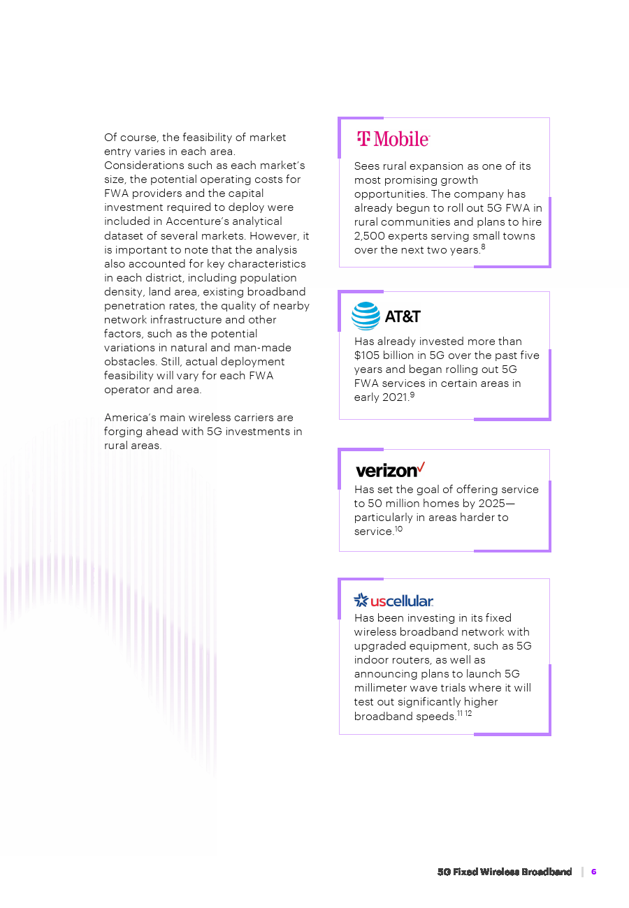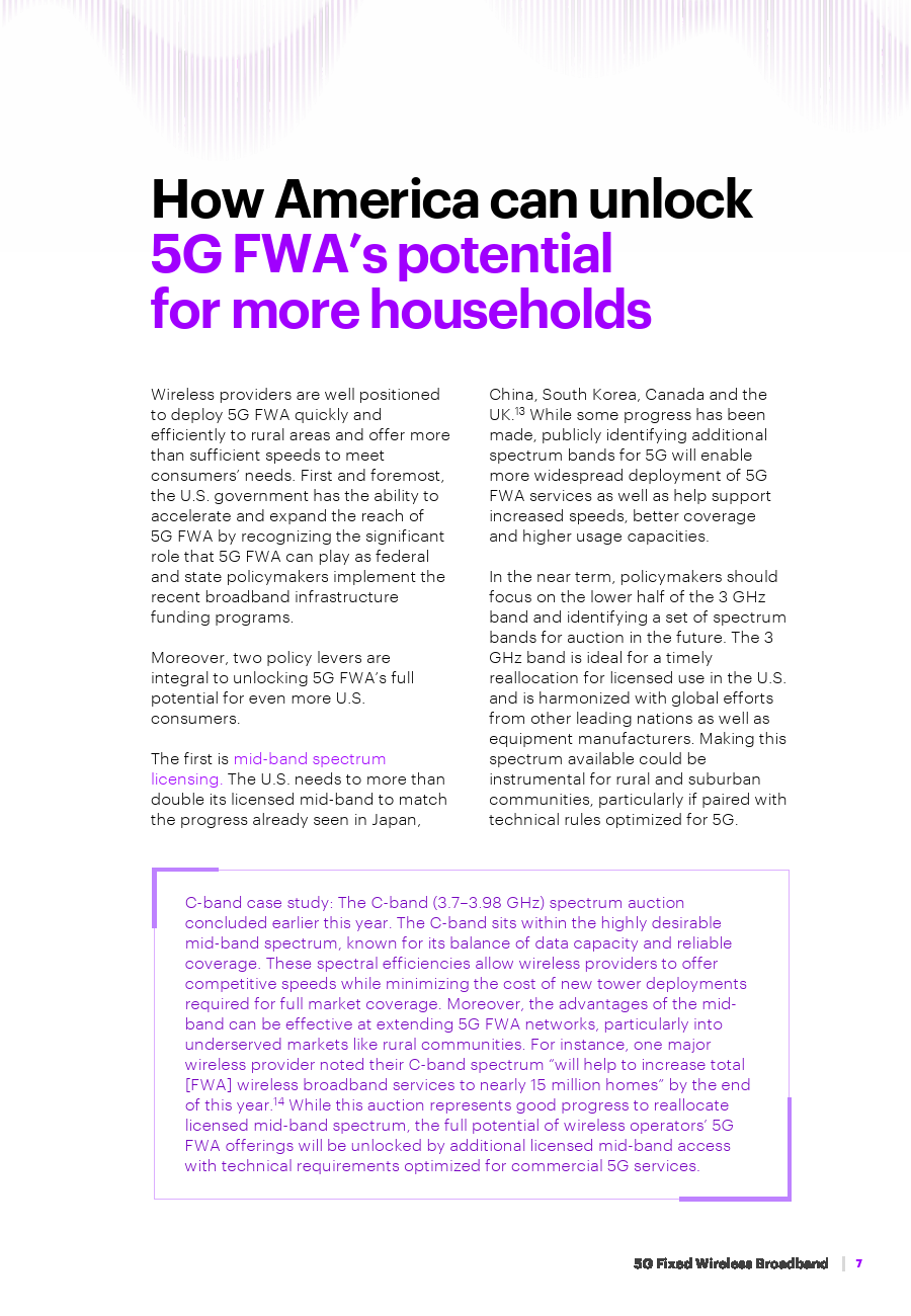 报告还讨论了5G FWA为移动农村连接和家庭宽带服务带来的好处。埃森哲还确定了额外的许可频谱,特别是在中频范围内,以及稳定的、全国性的监管框架,这些框架激励网络基础设施的高效建设,是未来将5G FWA带给更多美国消费者的关键。