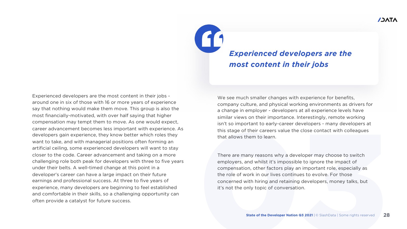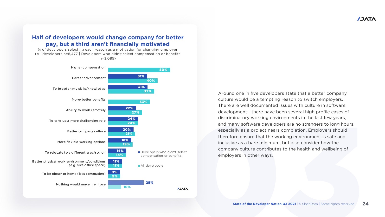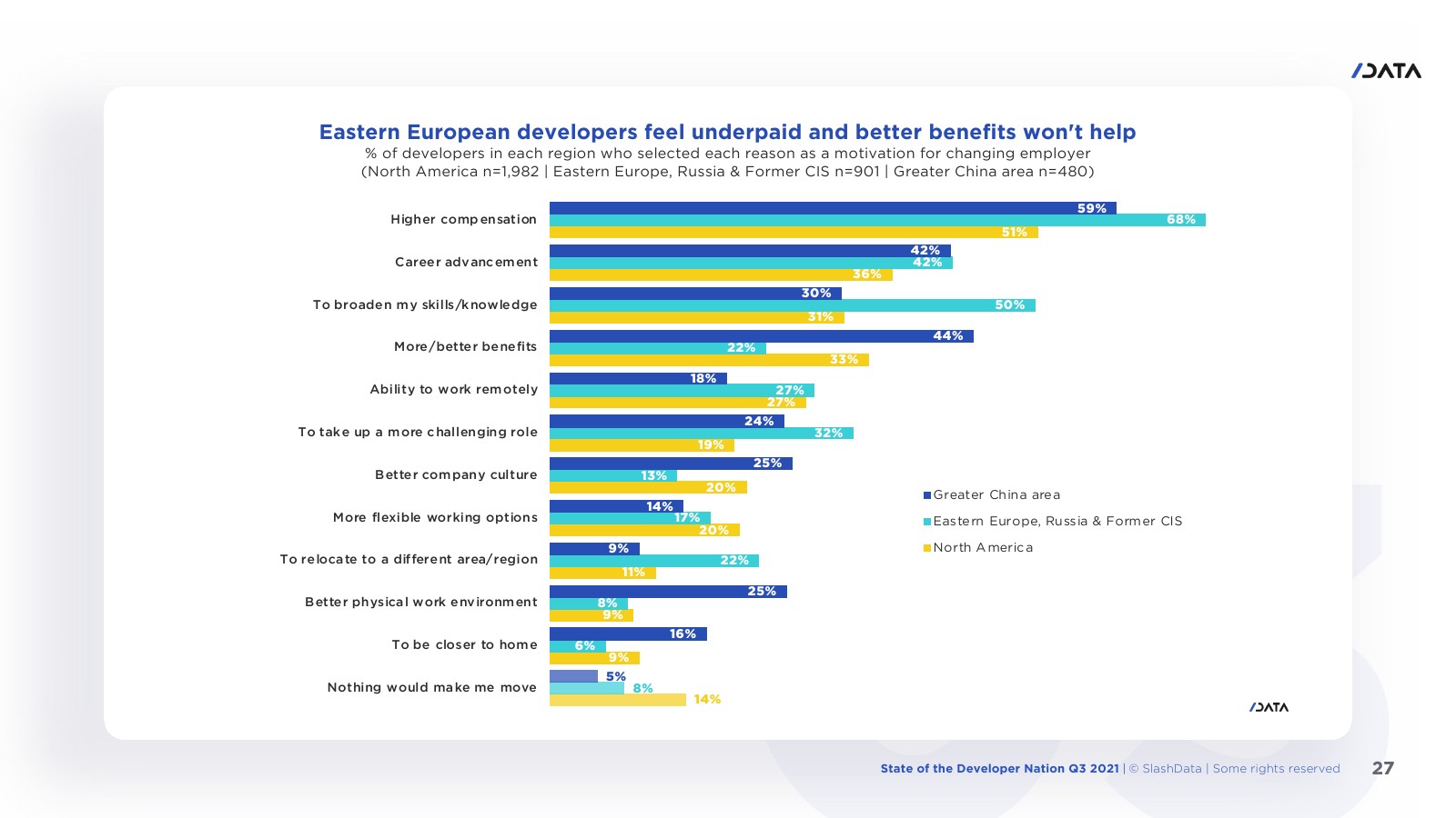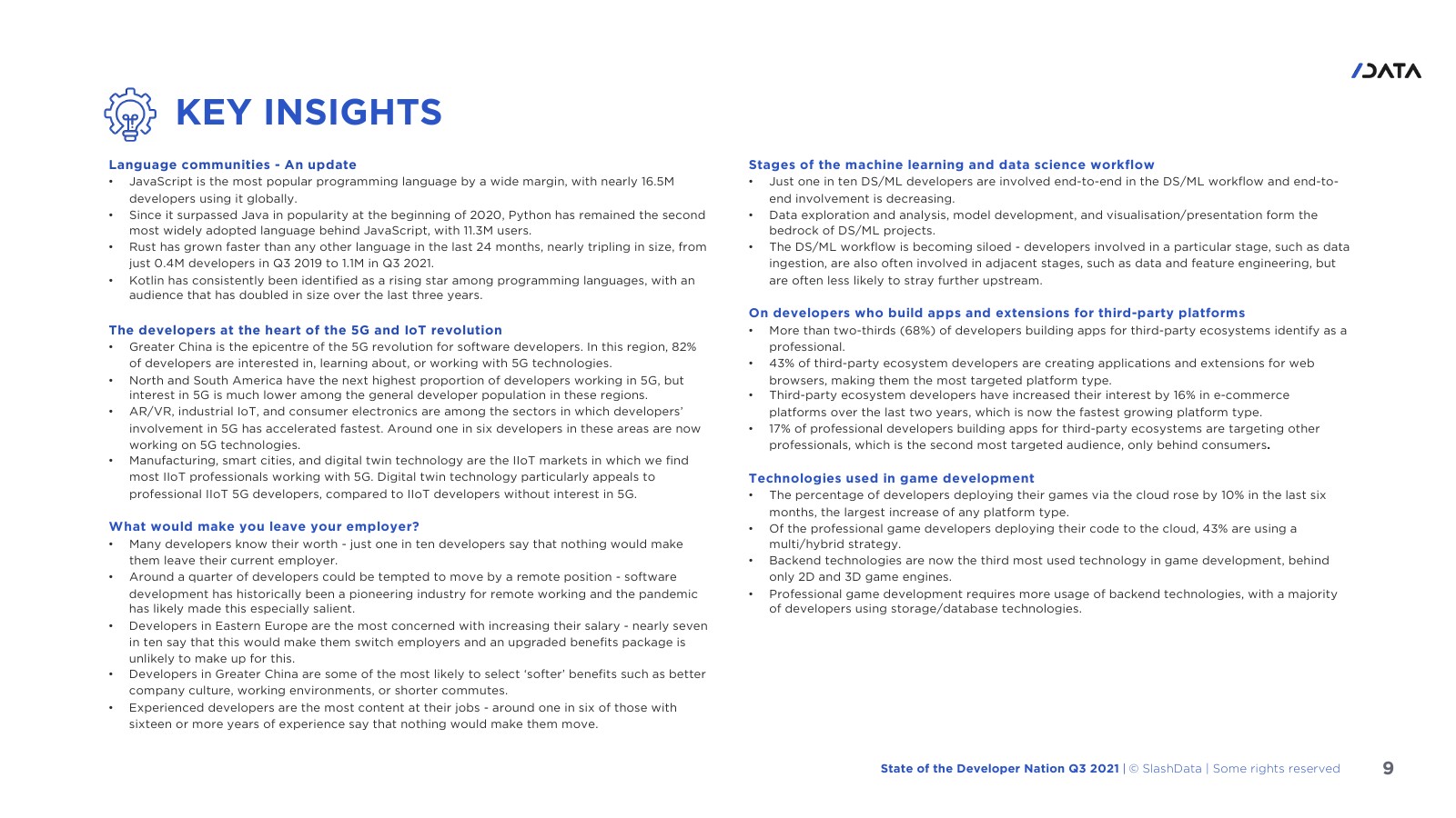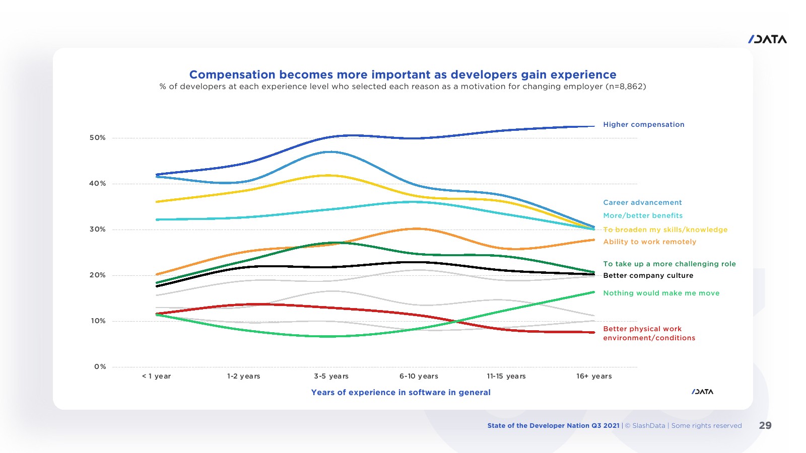 许多程序员知道自己的价值,1/10的受访者表示没有什么能让他们离开目前的雇主。大约1/4的开发人员可能会受到远程工作的诱惑。7/10的东欧开发人员最关心的是加薪,这也能导致他们更换雇主。大中华区的开发人员最有可能选择“软”福利。在拥有16年或以上经验的开发人员中约1/6表示没有什么能让他们离职。机器学习和数据科学工作流程