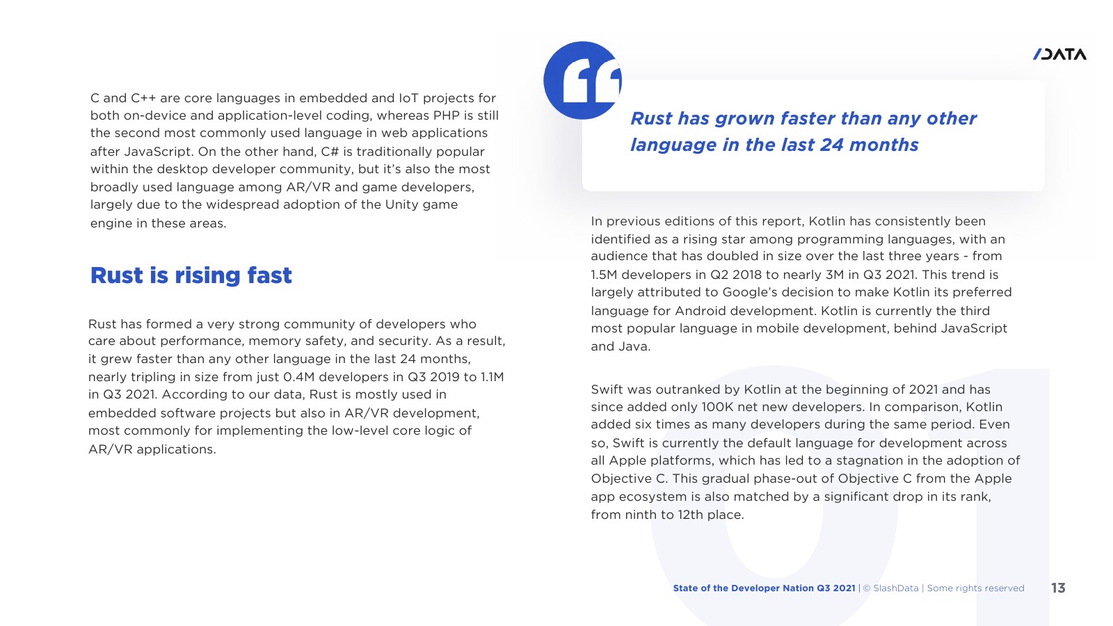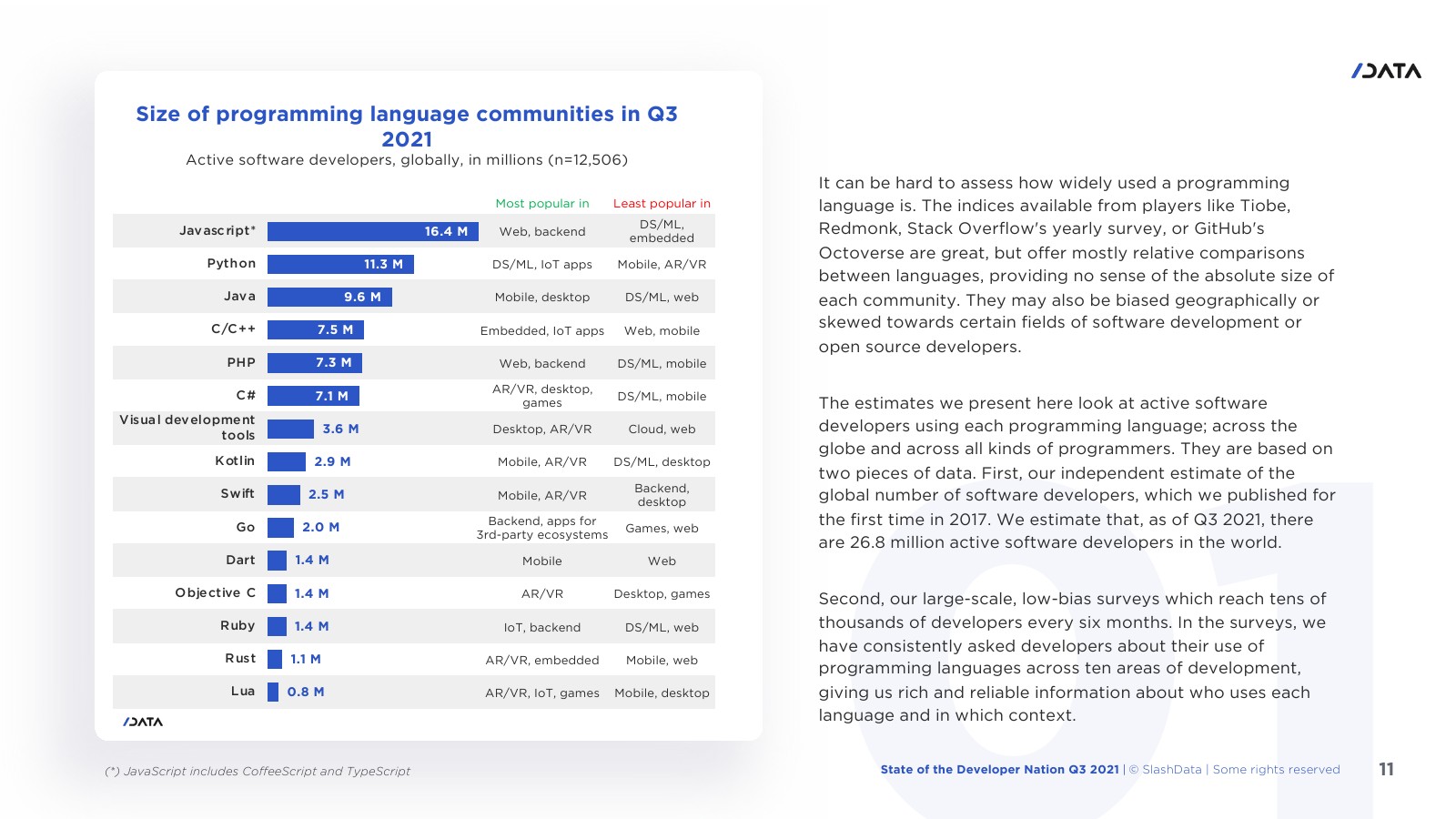 SlashData发布了“2021年开发者报告”。目前,JavaScript是最受欢迎的编程语言,在全球有近1650万开发人员使用它。自2020年初流行度超过Java以来,Python一直是仅次于JavaScript的第二语言,拥有1130万用户。在过去24个月里,Rust的增长速度比其他任何语言都快。Kotlin一直被视为编程语言中的新星。