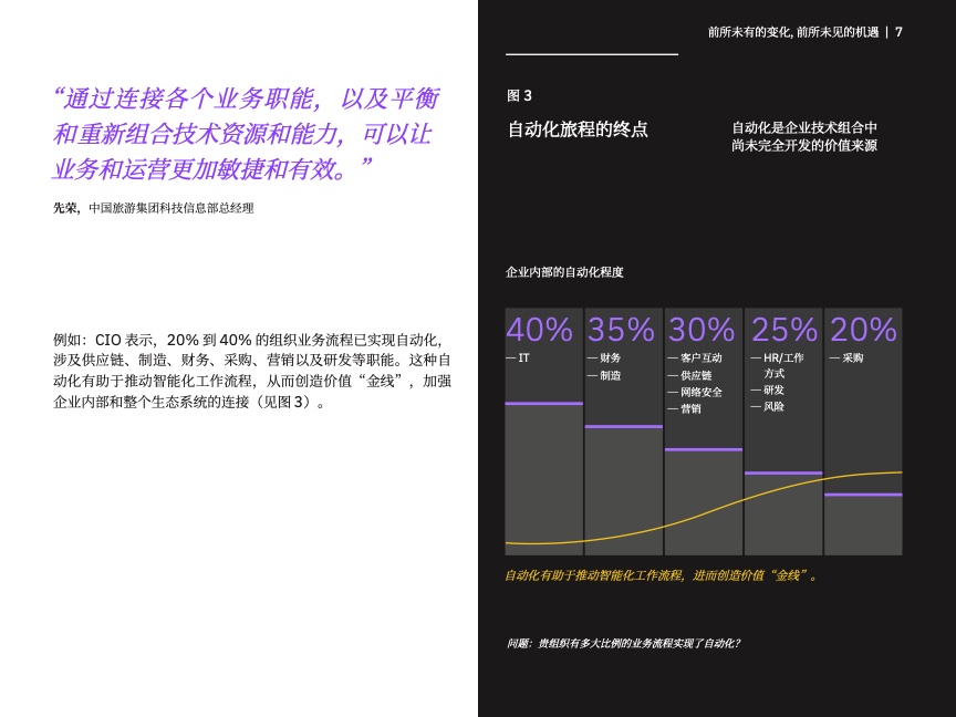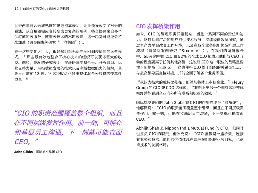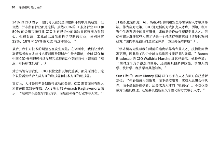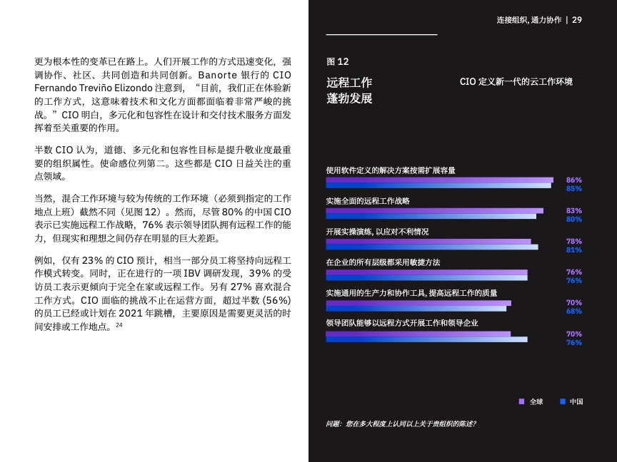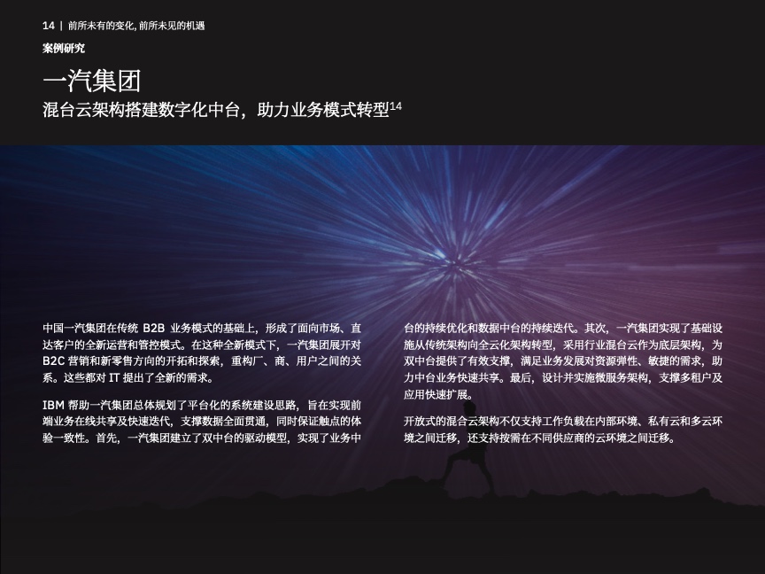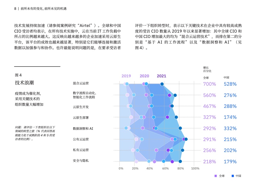 2021 年,企业的业务模式仍在继续加速适应不断变化的外部环 境。在新的“后数字化”方法的推动下,无边界企业 (Virtual Enterprise) 模式浮出水面,帮助组织积极抓住机会。1 这种模式 有赖于云技术的速度和规模,特别是混合云的灵活性与互操作 性,以及将人工智能 (AI) 和自动化相结合而快速实现的成果。这 些技术共同创造的协同效应以及新的价值来源,都要比单一技术 高出数个数量级。